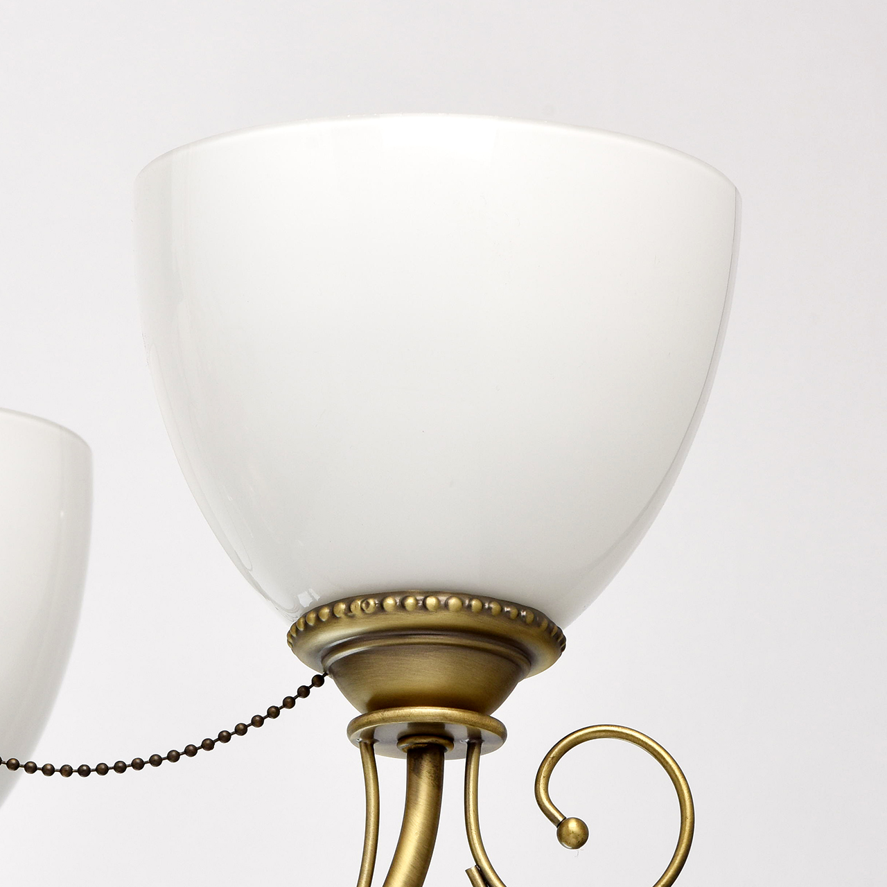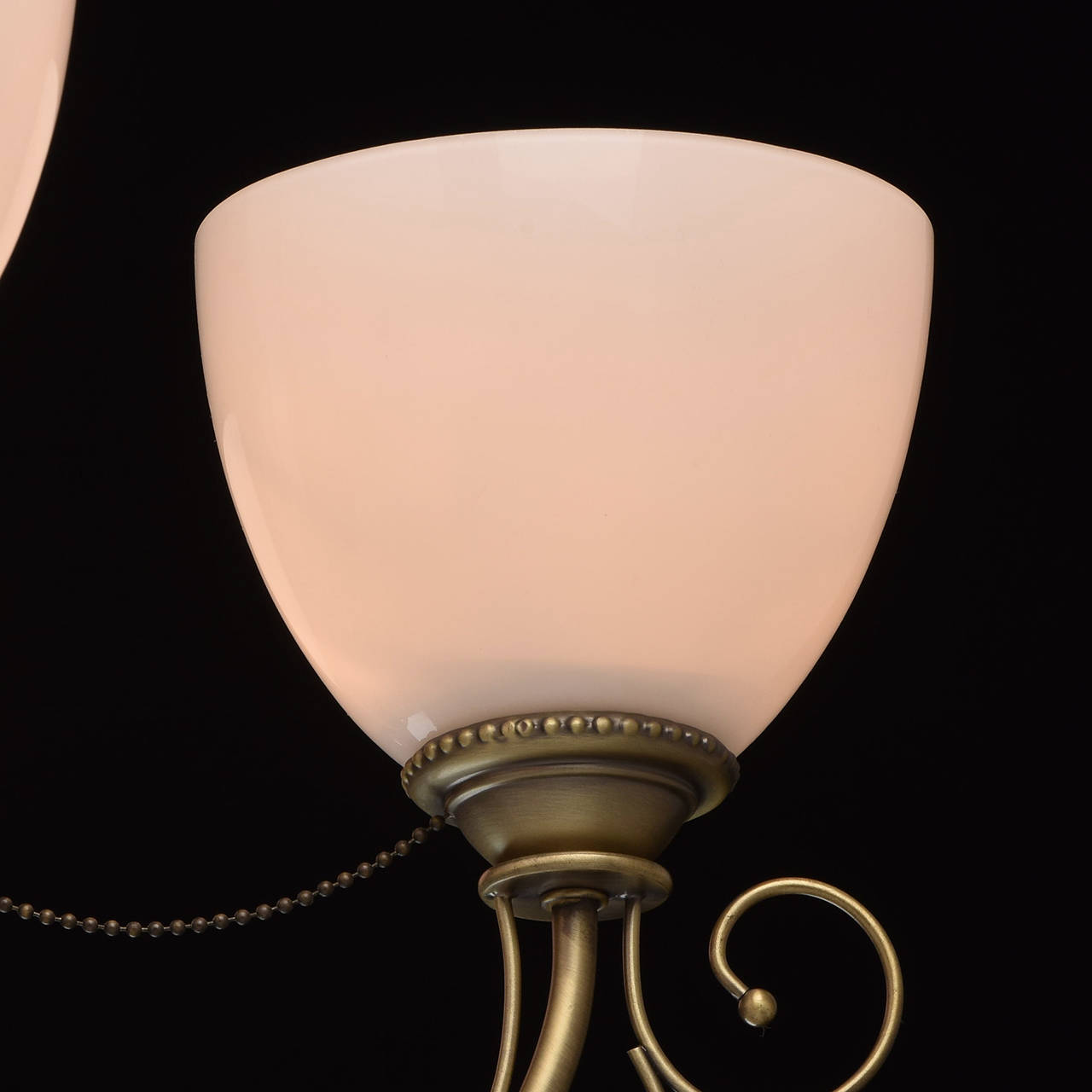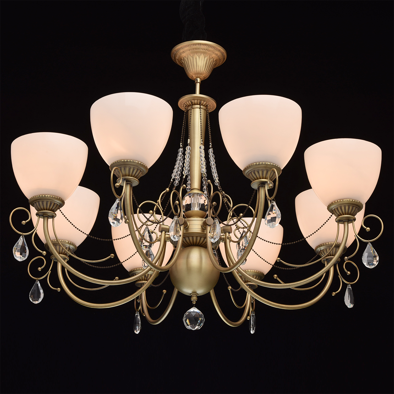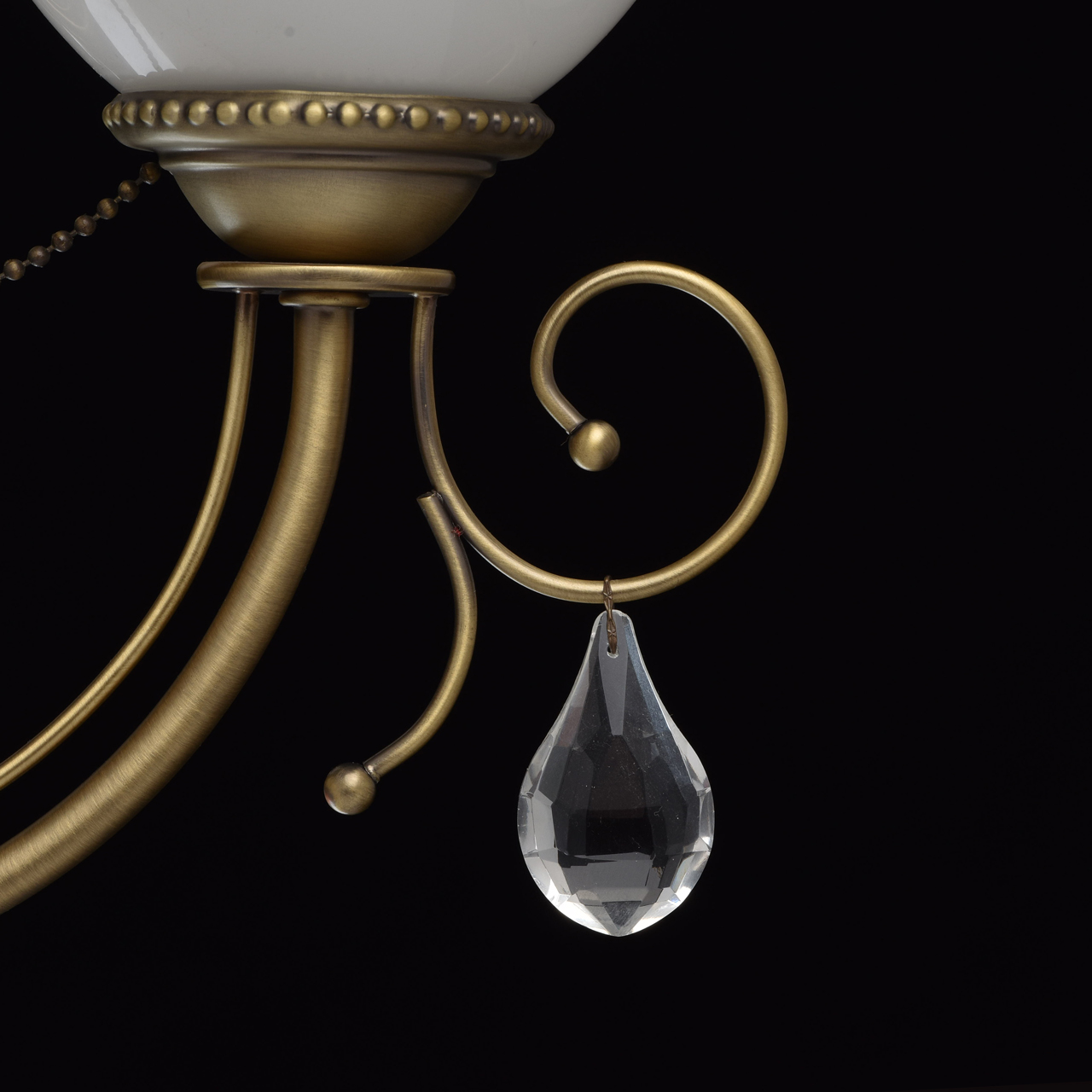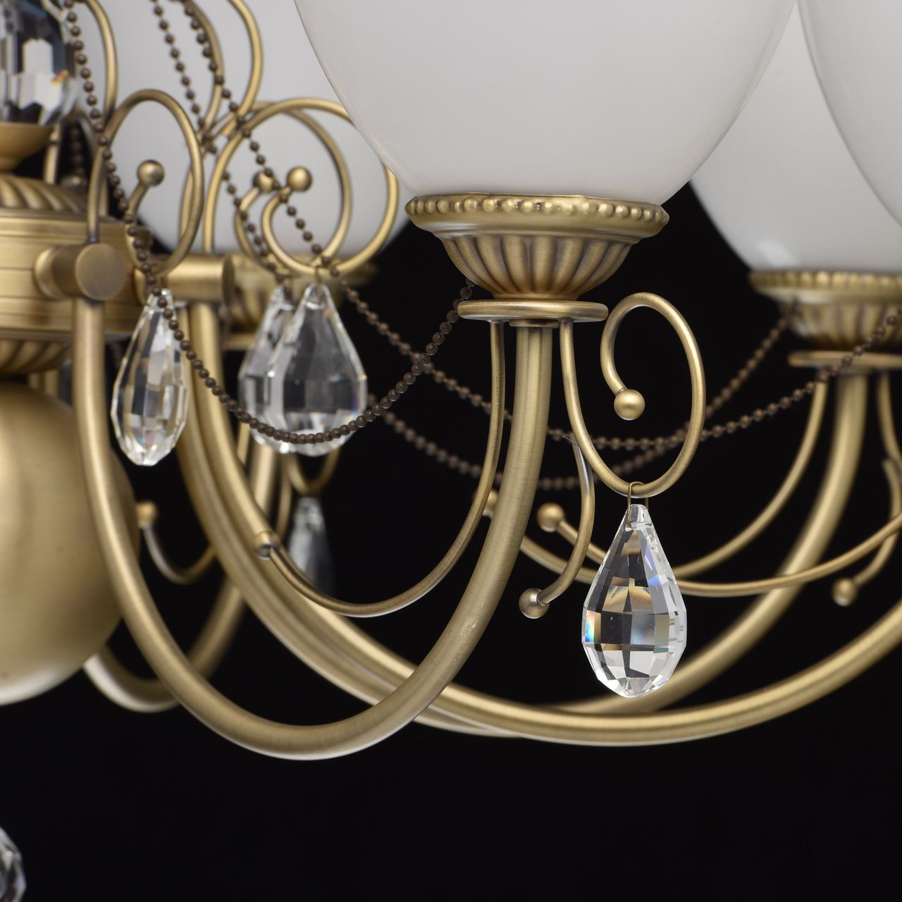 Арматура светильника выполнена из сплава железа и гальванизирована в цвет бронзы. Декоративная сфера на центральной оси выполнена по технологии токарной обработки. Основание и декоративные розетки выполнены по технологии прессования. Светильник декорирован массивом хрусталя, цепочками с хрустальными бусами и подвесками из хрусталя сложной огранки.Тип помещения