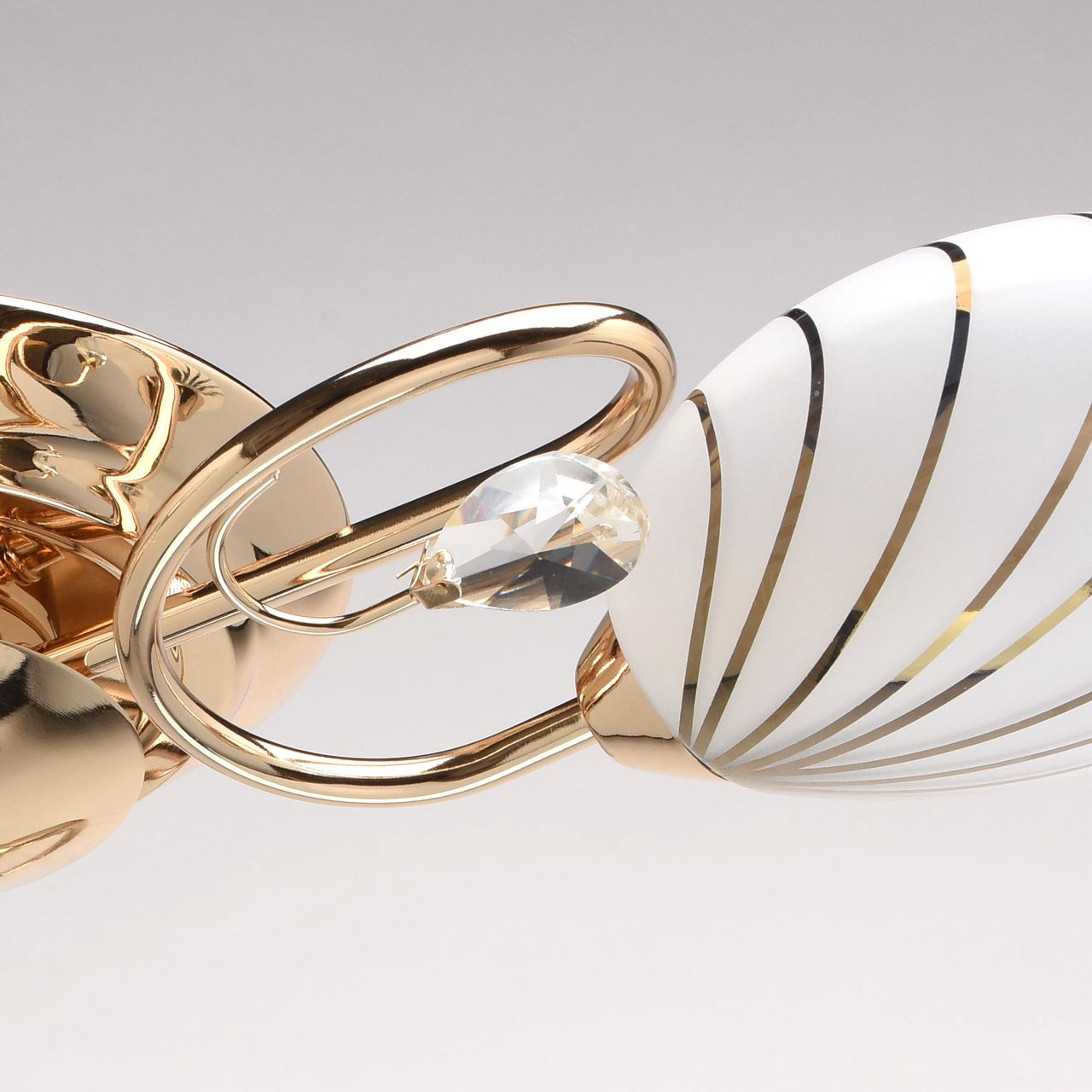 Металлическое основание цвета золота, плафоны из матового стекла с гальванизированным рисунком, декоративные элементы из прозрачного хрустального стекла.Технология производства