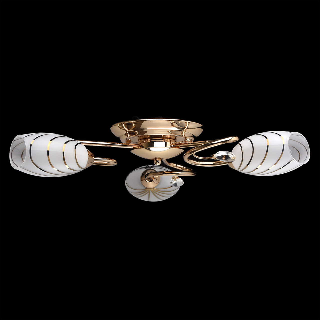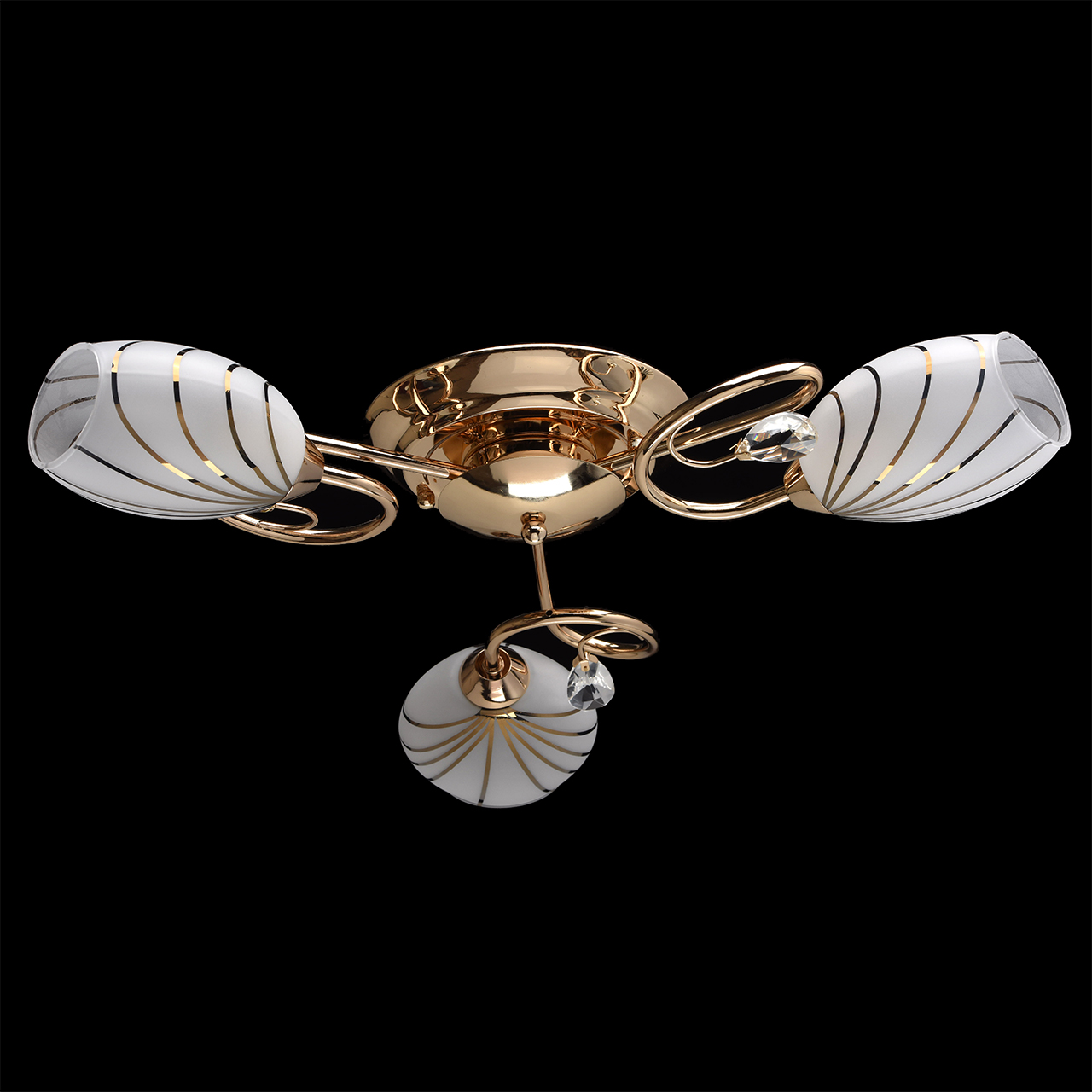 Основание светильника выполнено из металла и гальванизировано в цвет золота. Потолочная чаша, корпус и держатели плафонов изготовлены по технологии обработки на токарном станке, рожки и завитки изогнуты по технологии проката на роликовом станке. Светильник декорирован стеклянными плафонами, отлитыми в форму. Плафоны матированы, гальванизированы по трафарету в цвет золота. Края плафонов обработаны по технологии оплавления. Декоративные элементы: прозрачное хрустальное стекло миндалевидной формы.Тип помещения