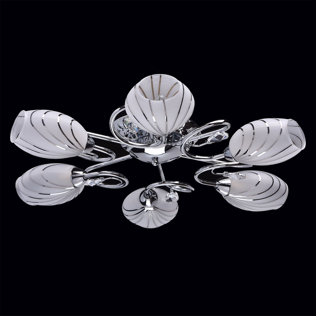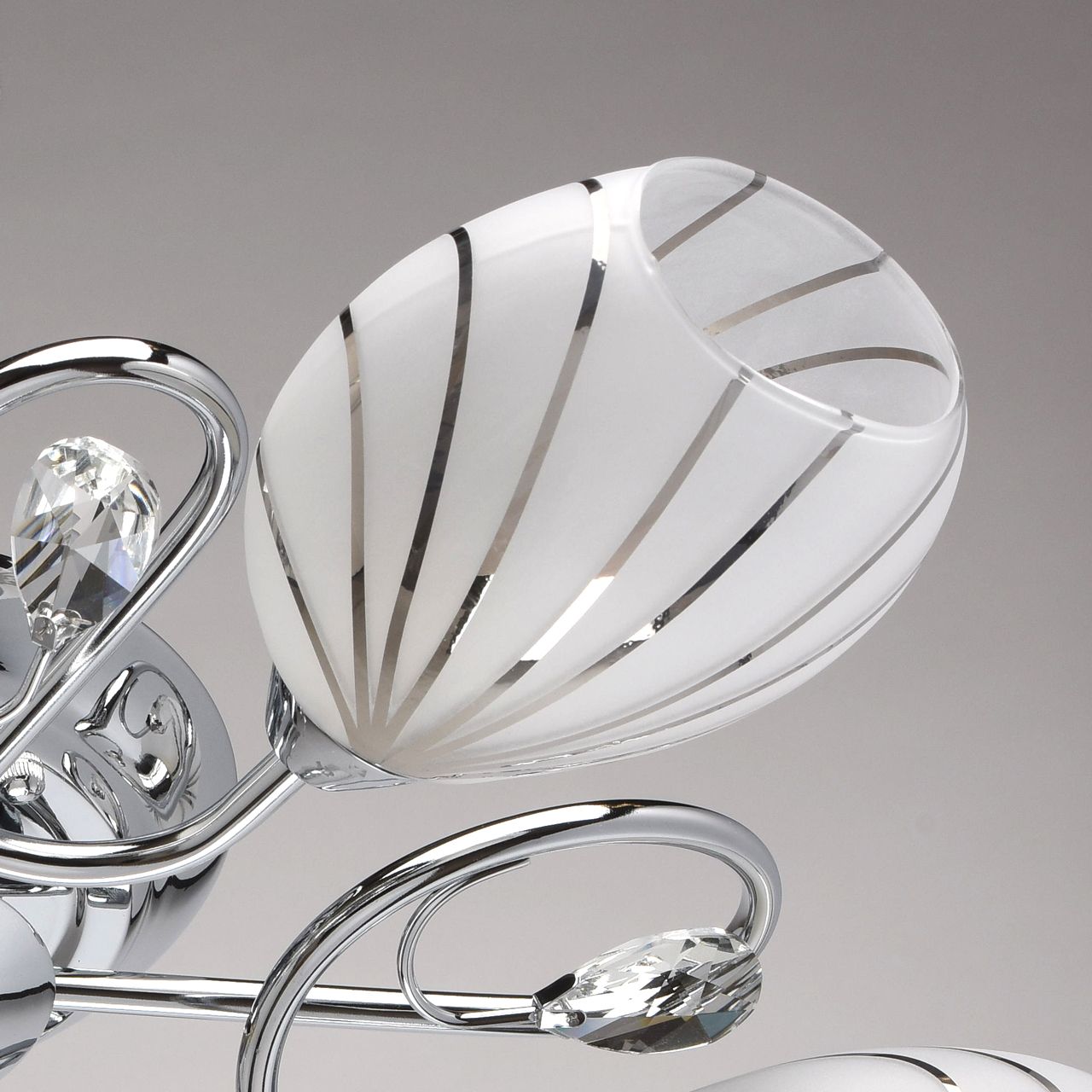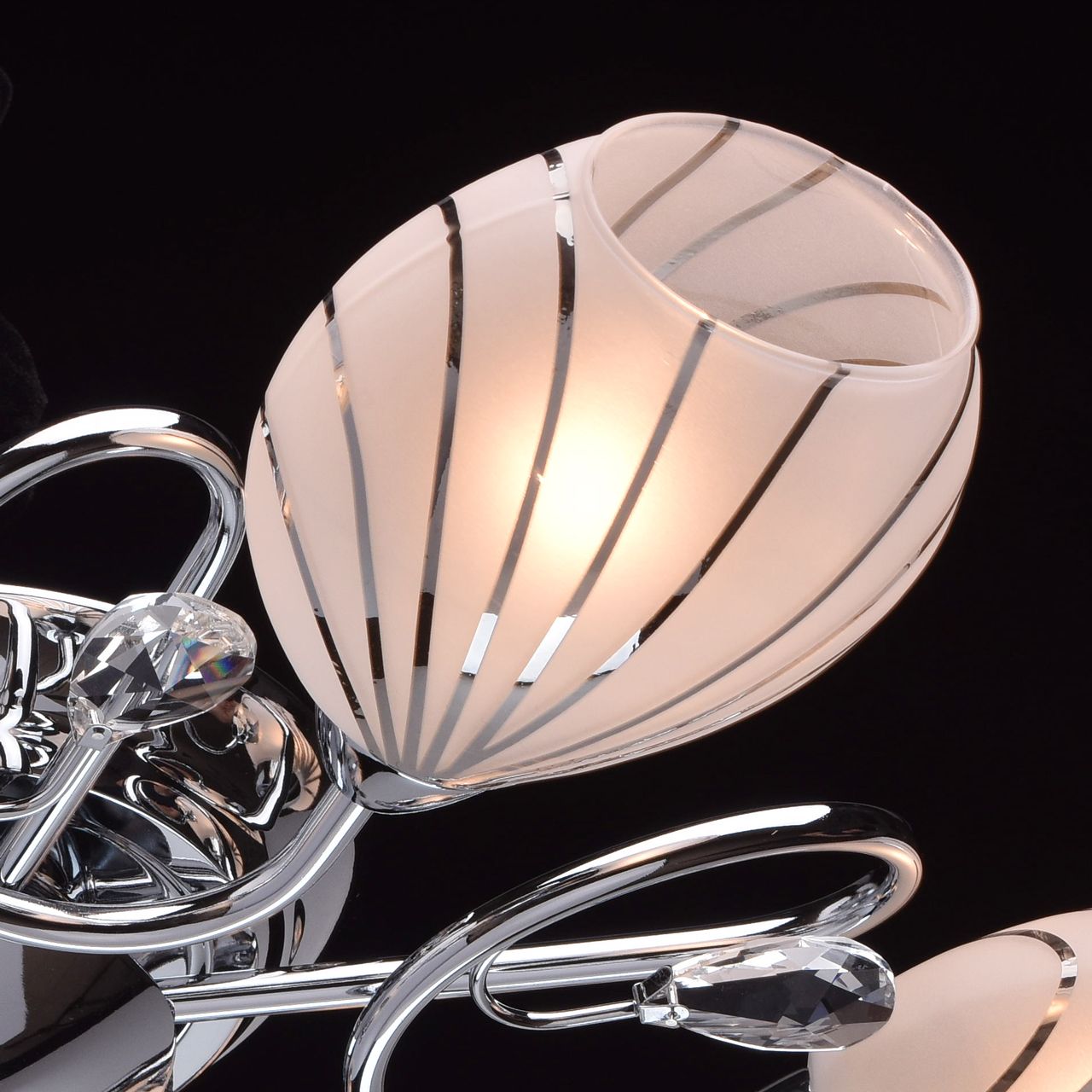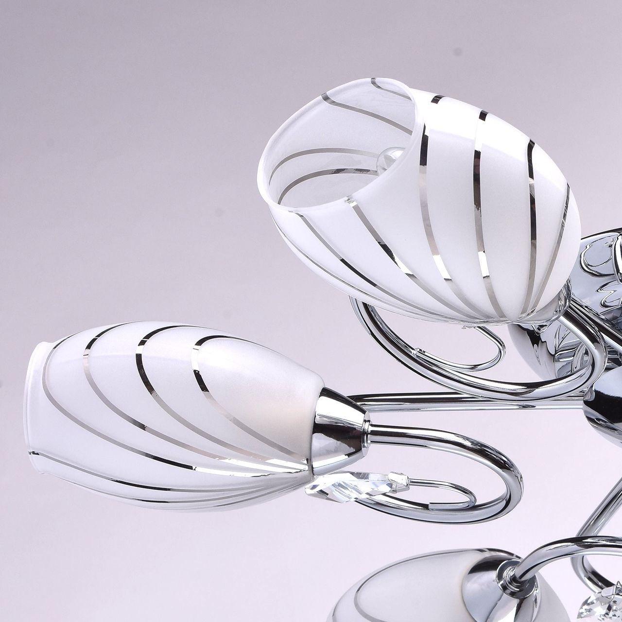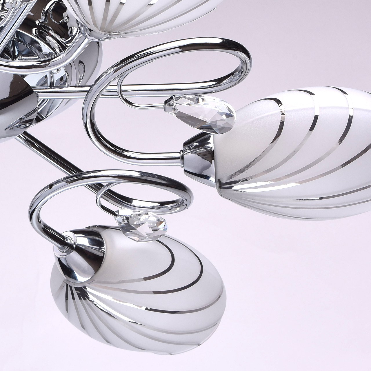 Основание светильника выполнено из металла и гальванизировано в цвет хрома. Потолочная чаша, корпус и держатели плафонов изготовлены по технологии обработки на токарном станке, рожки и завитки изогнуты по технологии проката на роликовом станке. Светильник декорирован стеклянными плафонами, отлитыми в форму. Плафоны матированы, гальванизированы по трафарету в цвет хрома. Края плафонов обработаны по технологии оплавления. Декоративные элементы: прозрачное хрустальное стекло миндалевидной формы.Тип помещения