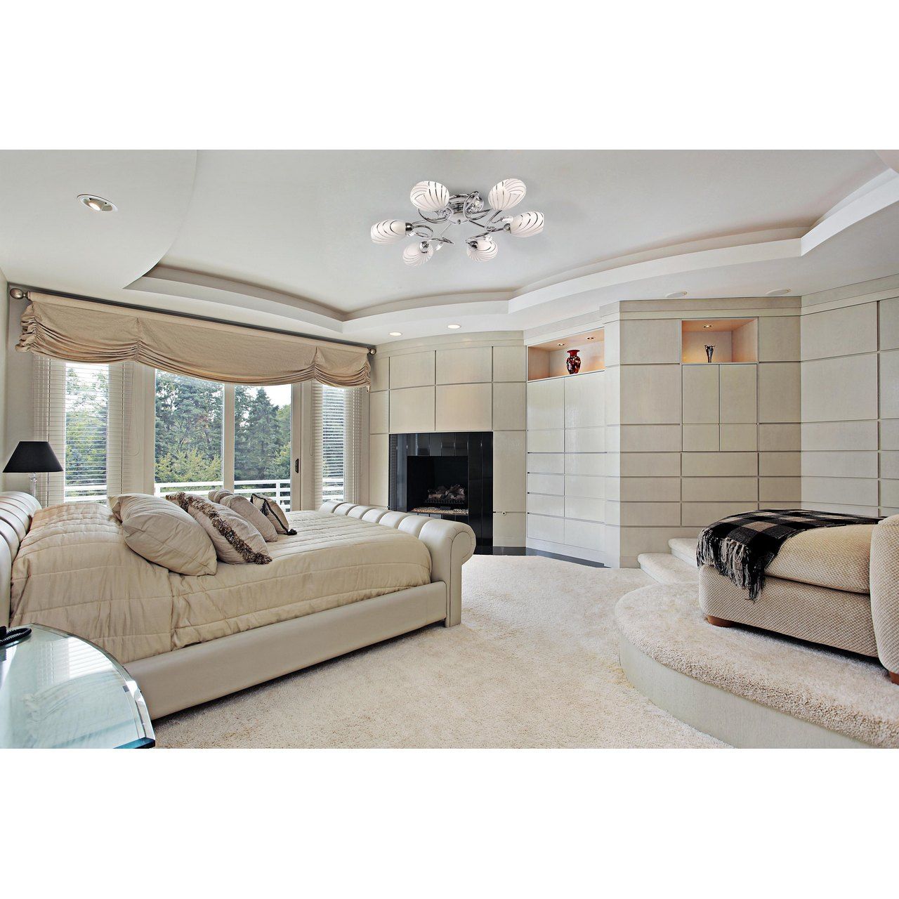 Современный дизайн объединяет в себе популярную форму плафонов и оригинальные завитки арматуры. Универсальность модели – легко впишется практически в любой интерьер. Высокие параметры освещенности за счет светлых плафонов и их оптимального размещения по всему диаметру светильника. Качественное гальваническое покрытие арматуры цвета хрома. Демократичная цена. Хороший вариант для комнат со стандартными потолками.Стилевые решения интерьера