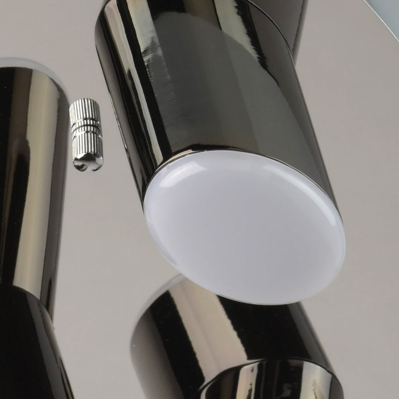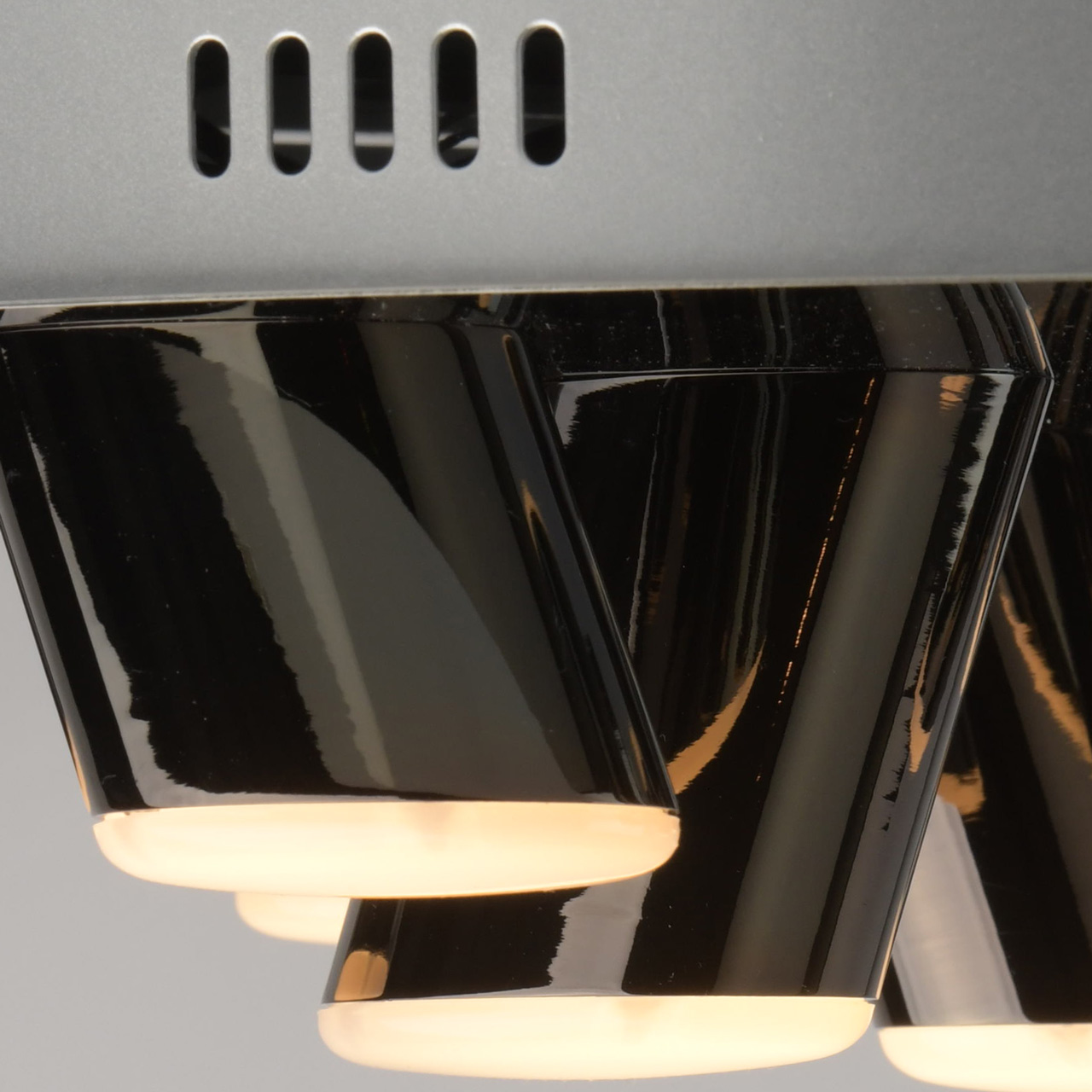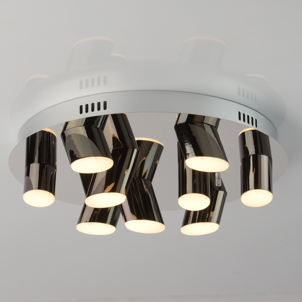 Основание выполнено из комбинации сплавов металлов. Потолочная чаша окрашена в серый цвет и закрыта листом из нержавеющей стали, отполированной до зеркального блеска. Плафоны - сплав алюминия, гальванизированы в цвет черного хрома. Светодиодные источники света типа CОВ закрыты глянцевым акрилом.Тип помещения