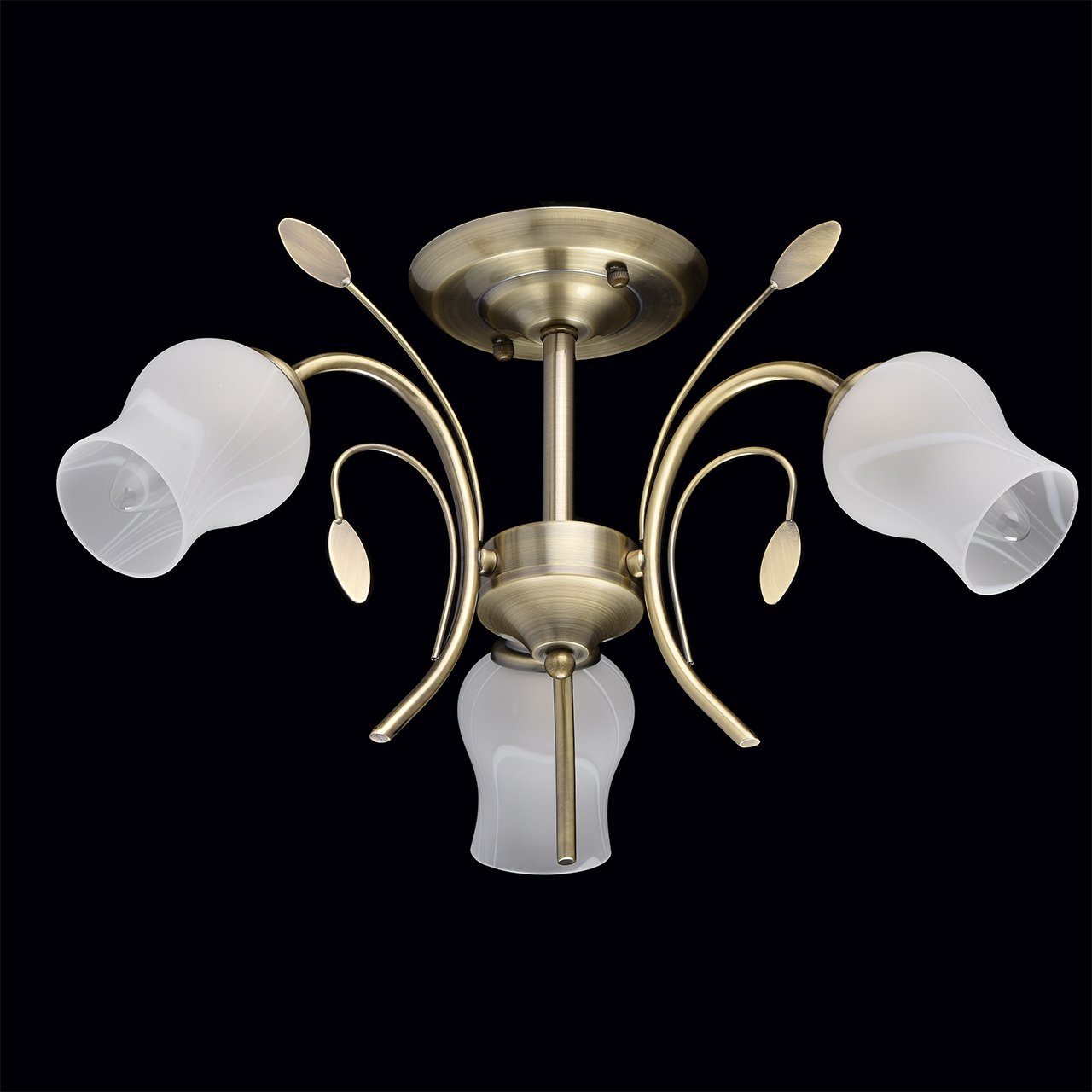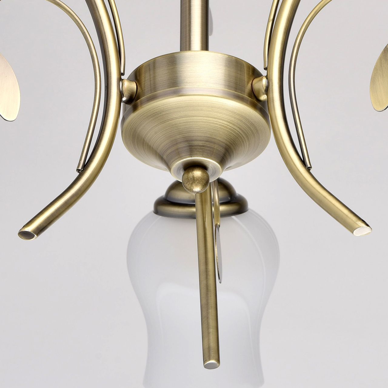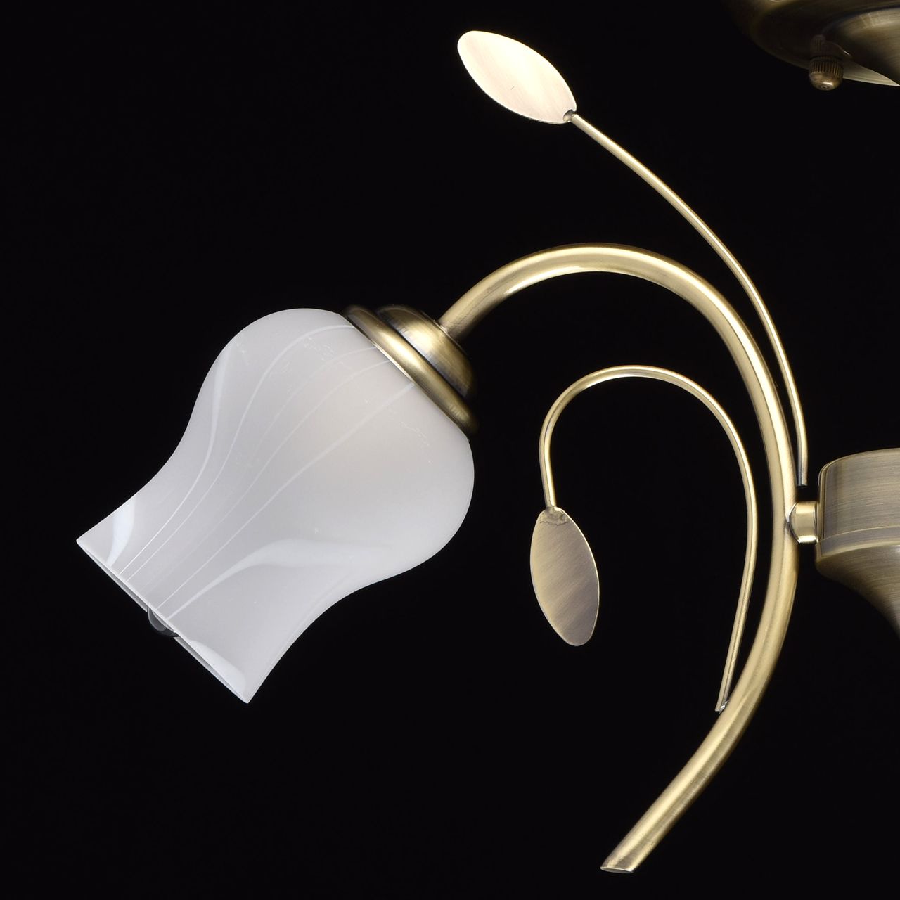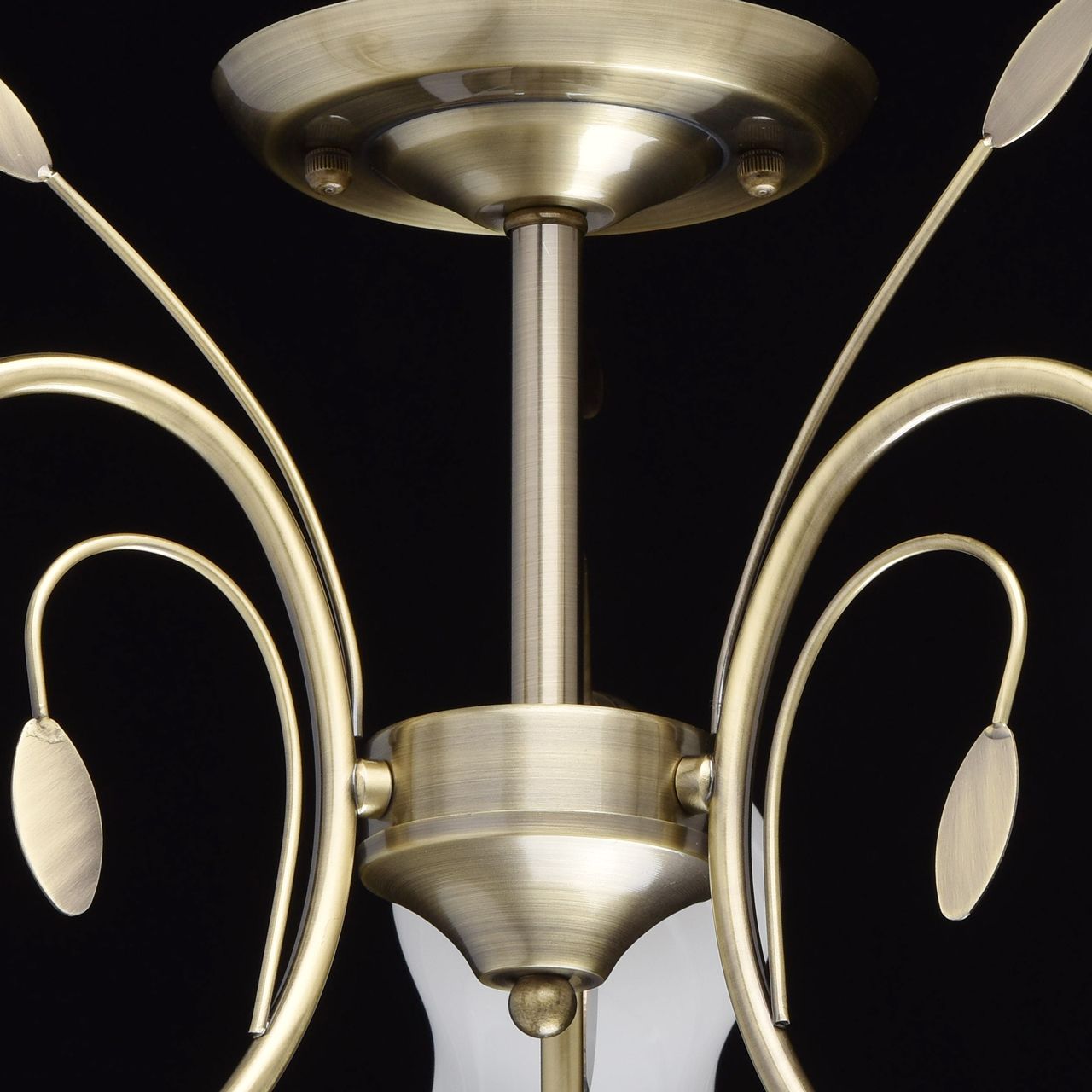 Основание светильника выполнено из металла и гальванизировано в цвет античной бронзы, лакировано. Потолочная чаша, корпус и держатели плафонов изготовлены по технологии обработки на токарном станке. Рожки и завитки изогнуты по технологии проката на роликовом станке. Декоративные элементы в виде листьев выполнены по технологии прессования. Светильник декорирован стеклянными плафонами, отлитыми в форму. Плафоны матированы, узор белой краской нанесен по внешней поверхности.Тип помещения