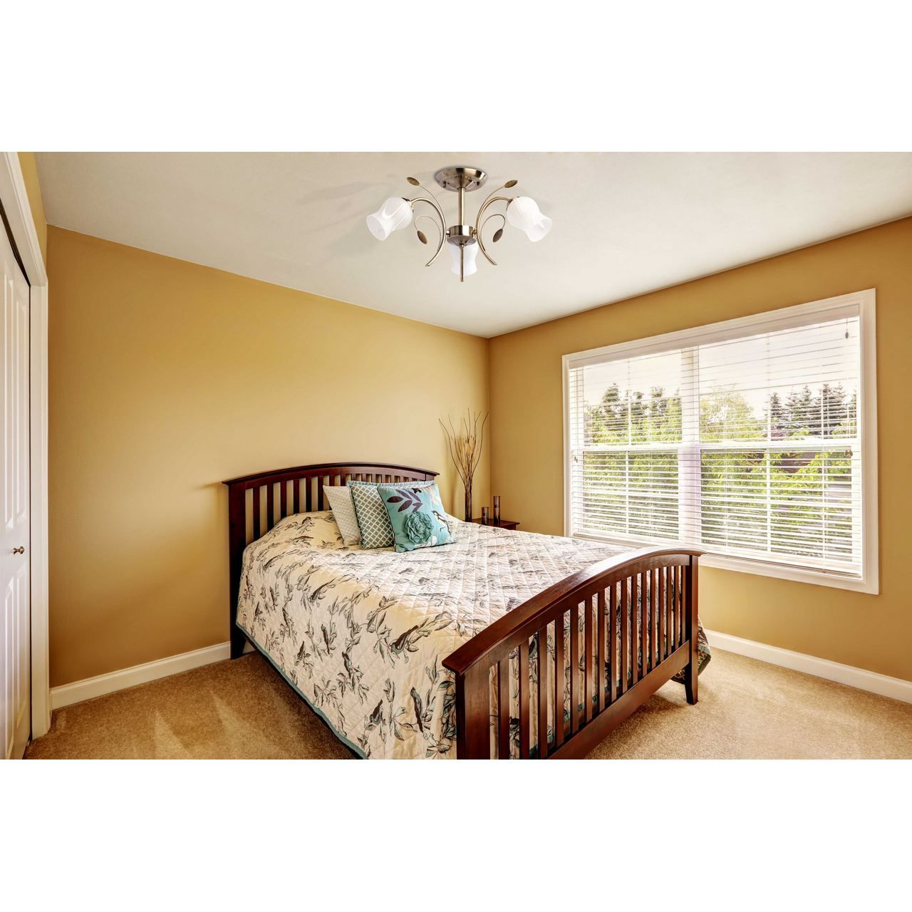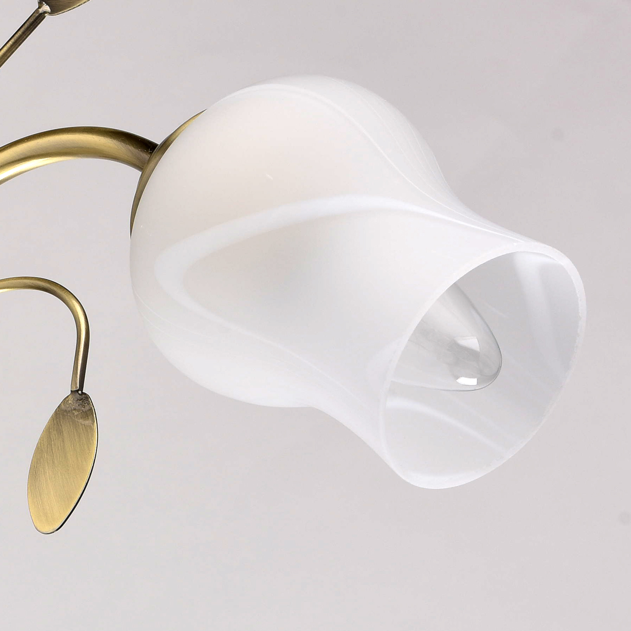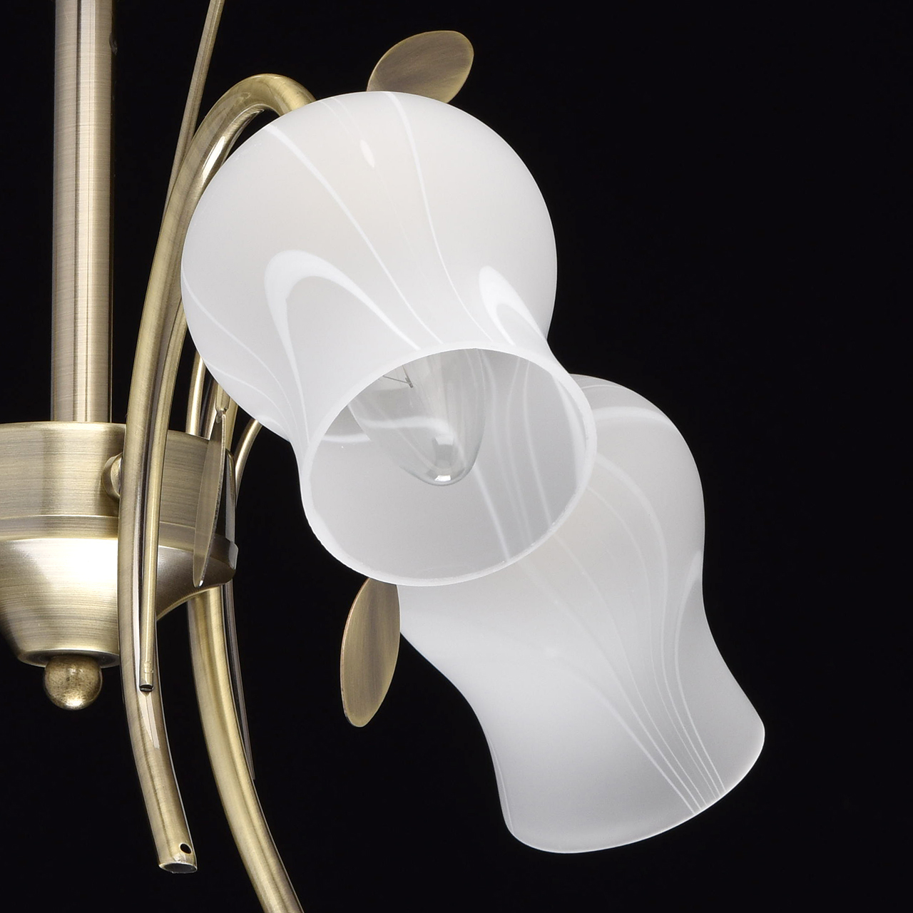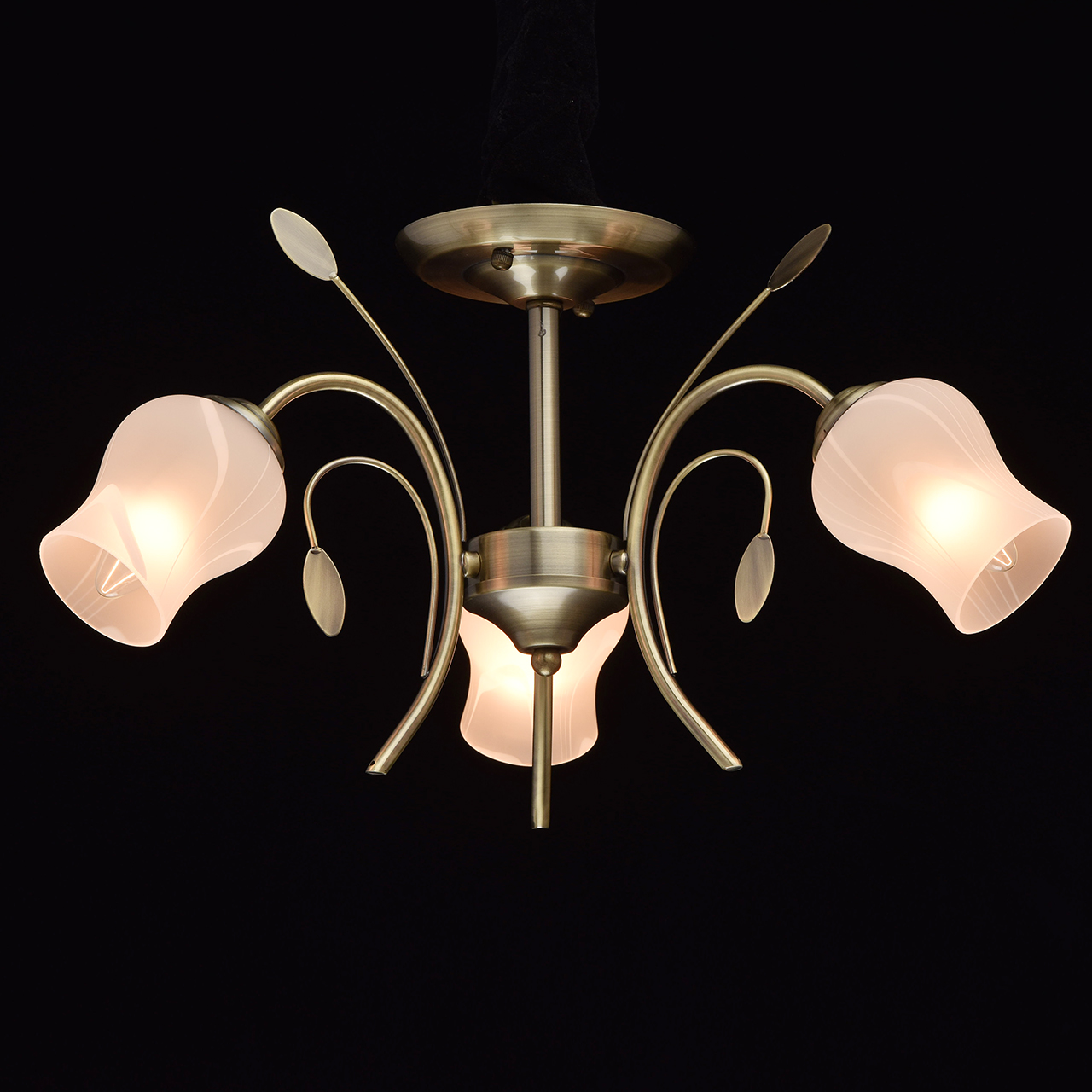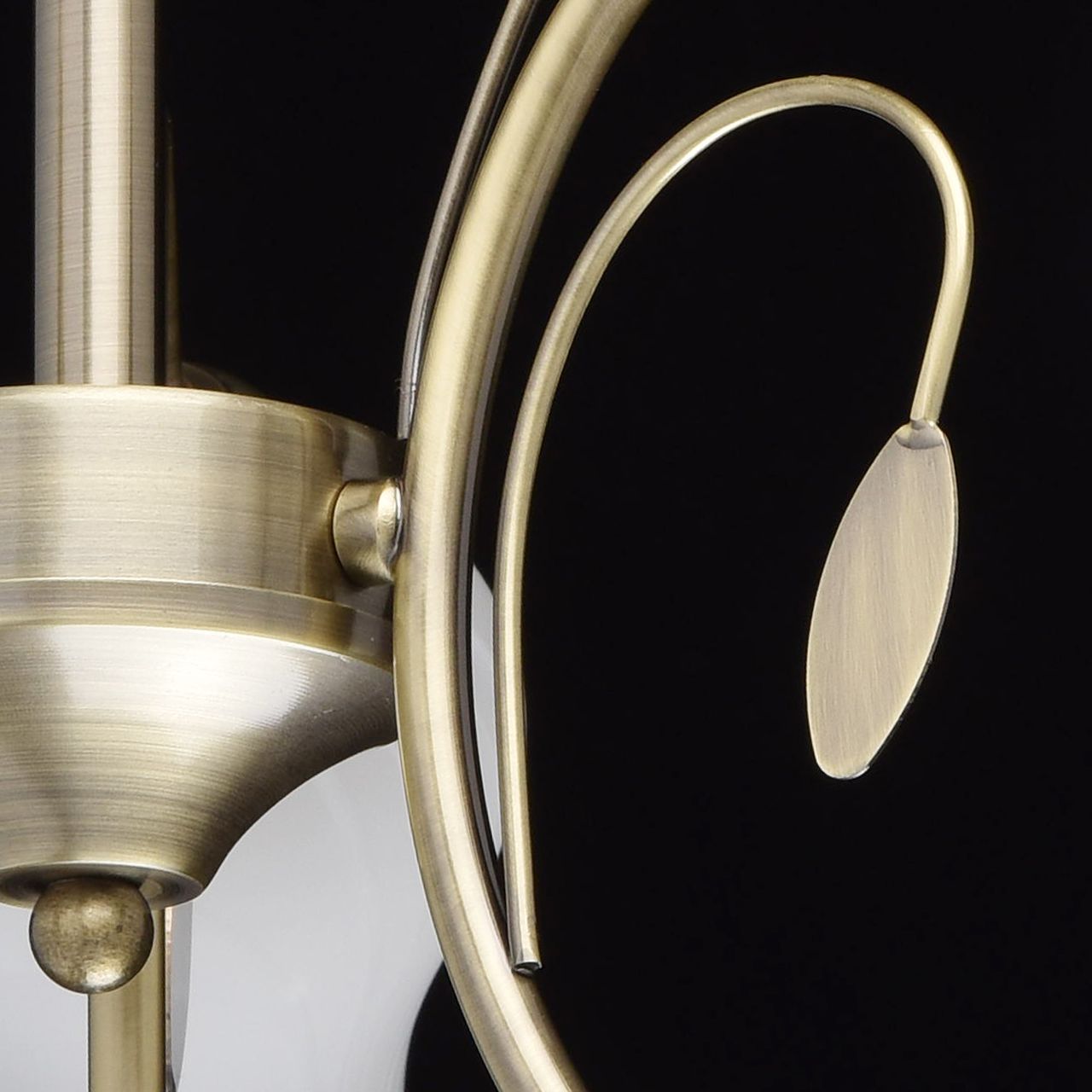 Основание светильника выполнено из металла и гальванизировано в цвет античной бронзы, лакировано. Потолочная чаша, корпус и держатели плафонов изготовлены по технологии обработки на токарном станке. Рожки и завитки изогнуты по технологии проката на роликовом станке. Декоративные элементы в виде листьев выполнены по технологии прессования. Светильник декорирован стеклянными плафонами, отлитыми в форму. Плафоны матированы, узор белой краской нанесен по внешней поверхности.Тип помещения