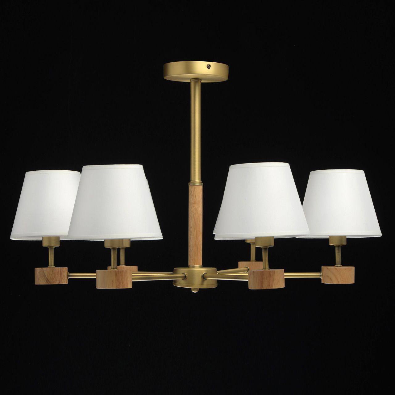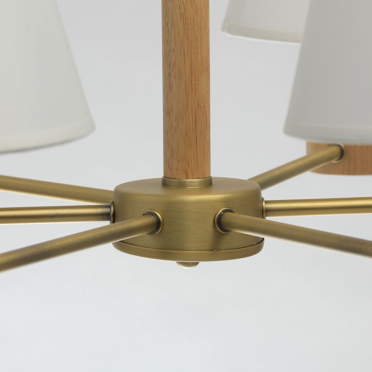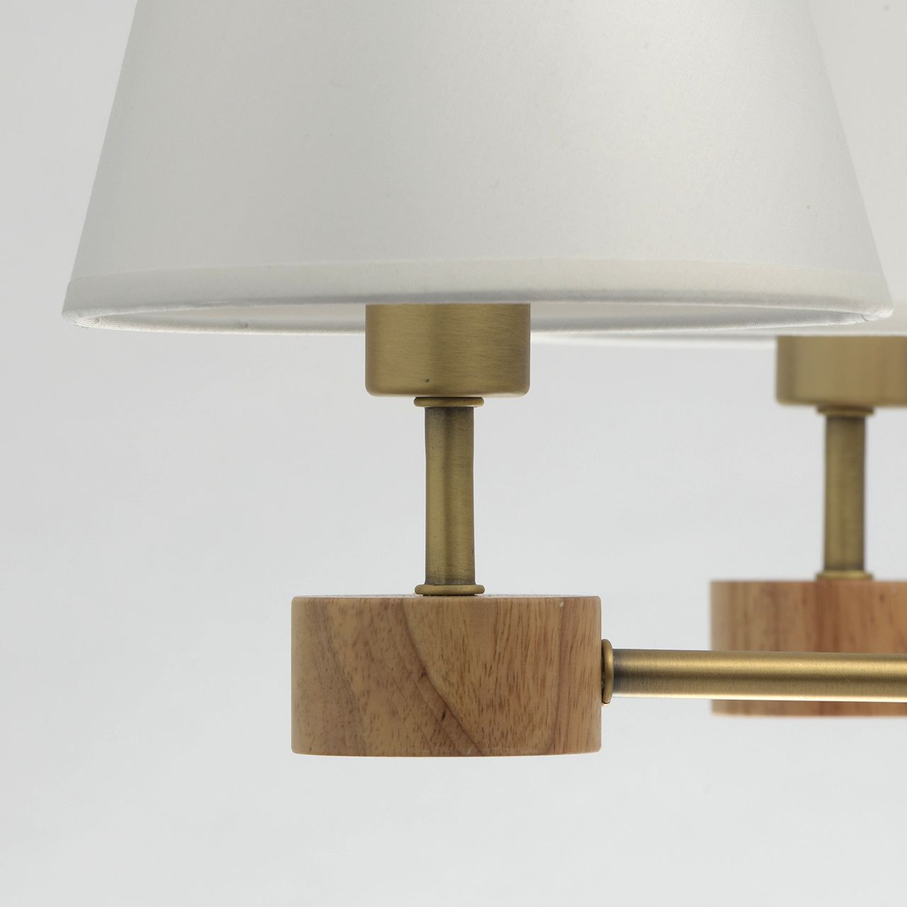 Металлическое основание гальванизировано в цвет матового золота. Декоративные элементы на рожках и центральном стержне выполнены из дерева гевеи. Текстильные абажуры белого цвета с термостойким акрилом внутри.Тип помещения