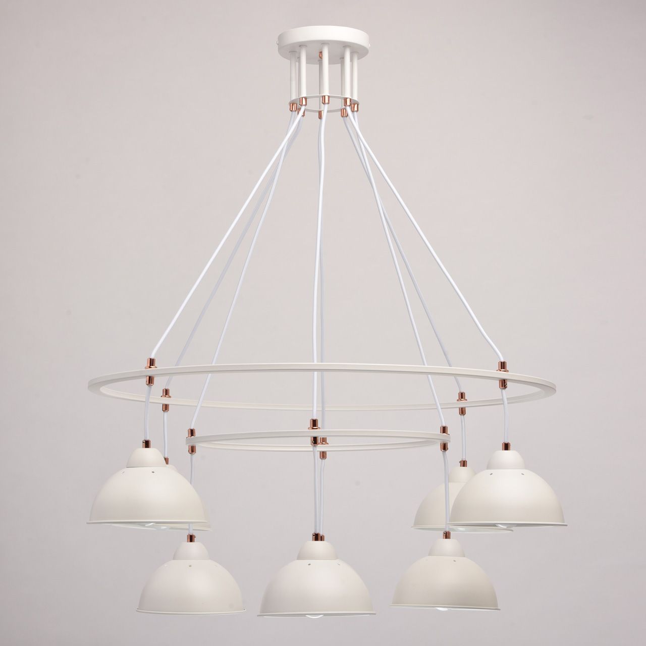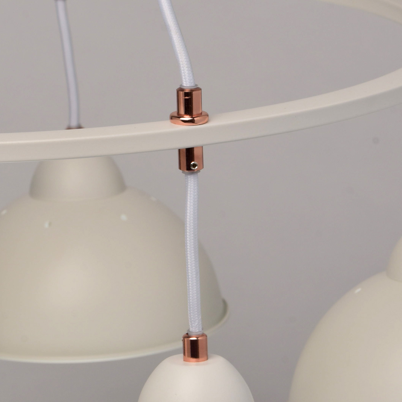 Основание и плафоны выполнены из металла и окрашены в белый цвет. Плафоны изнутри окрашены в белый цвет. Отдельные элементы гальванизированы в цвет розового золота. Плафоны свободно висят на текстильных подвесах белого цвета.Тип помещения