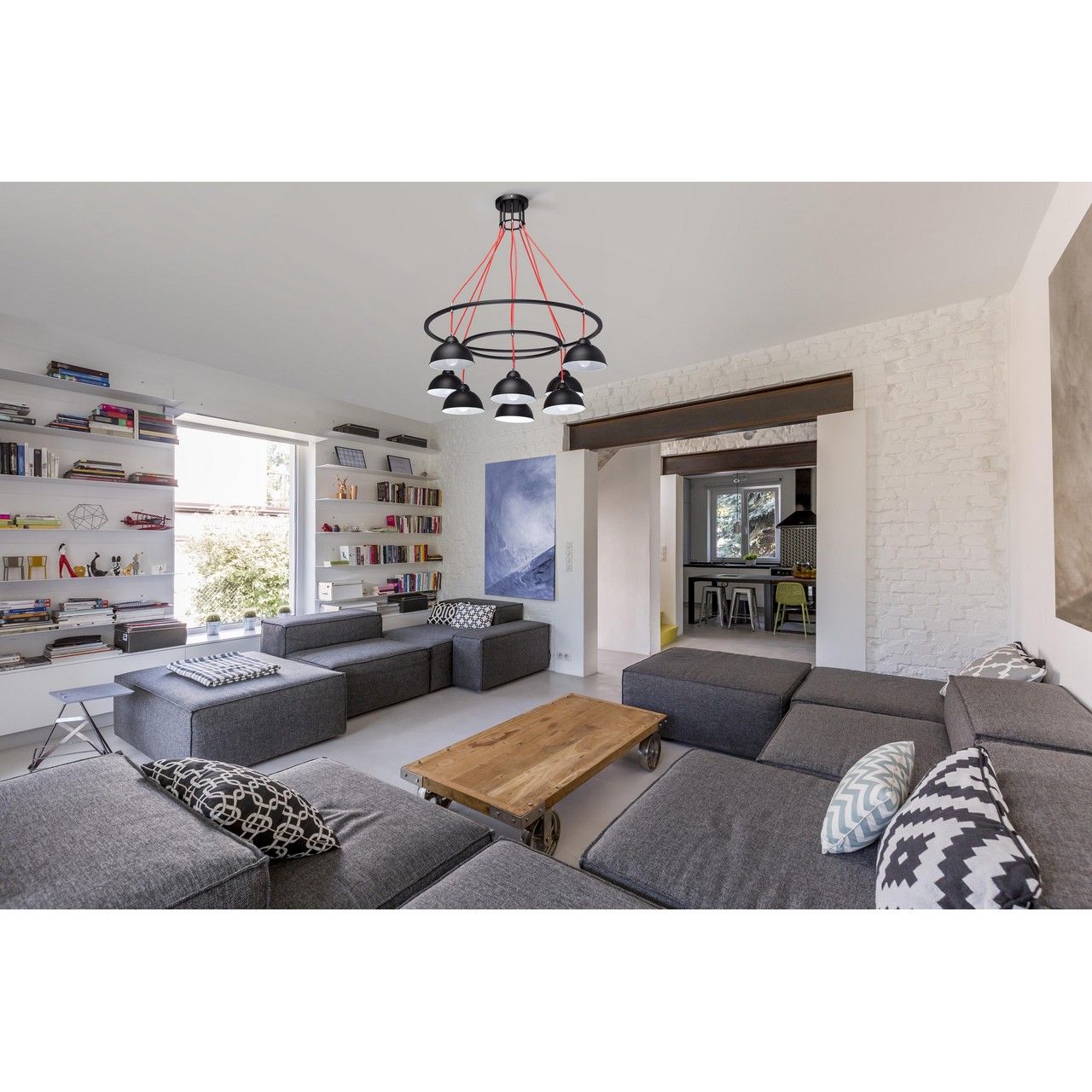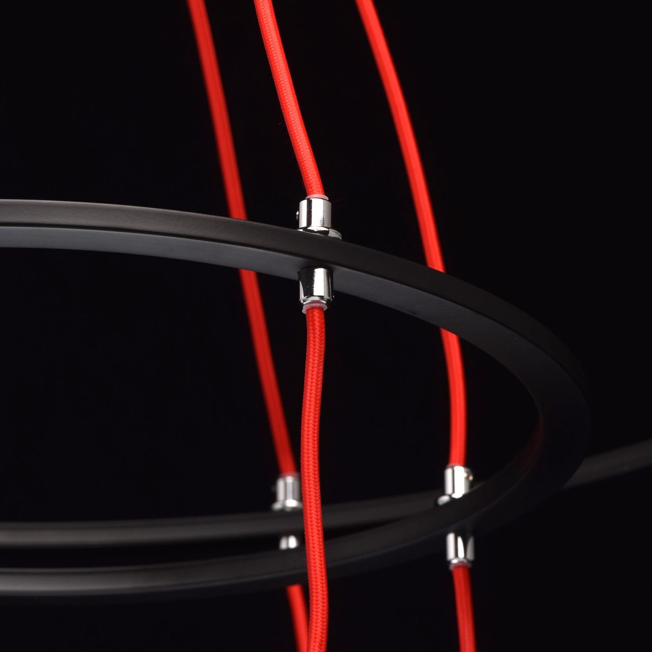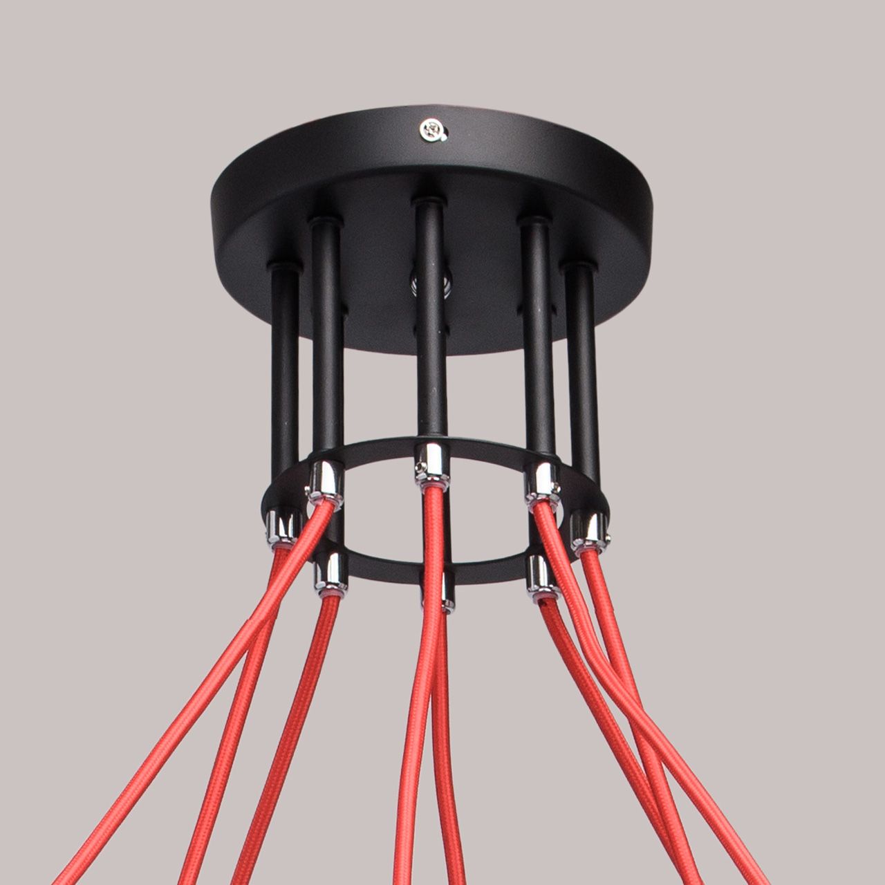 Люстра из коллекции "Формула" привлекает яркими сочетаниями и оригинальным воплощением. Металлическое основание и плафоны выполнены в классиечском чёрном оттенке. Тёмный тон разбавляют контрастные текситльные шнуры красного цвета - получается эффектный, но не пёстрый дуэт. Светильник идеален для современныйх интерьеров в стиле лофт, минимализм.Преимущества модели