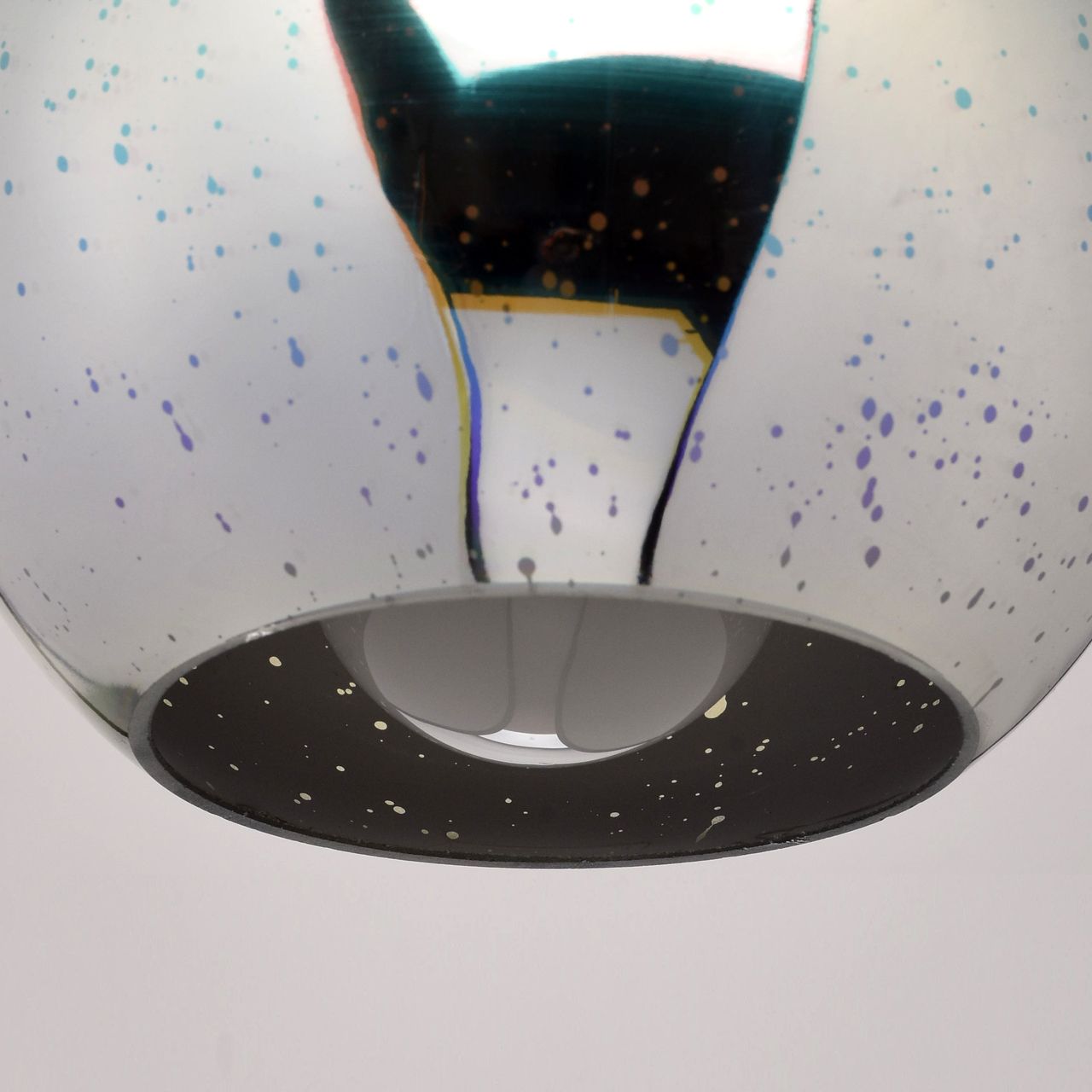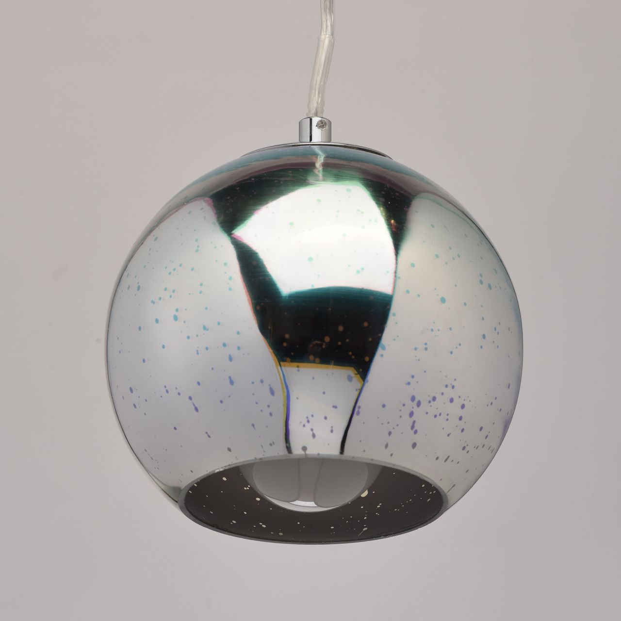 Металлическое основание гальванизировано в цвет хрома. Плафон из стекла c голографическим эффектом, имеет многослойное покрытие изнутри в цвет хрома.Тип помещения