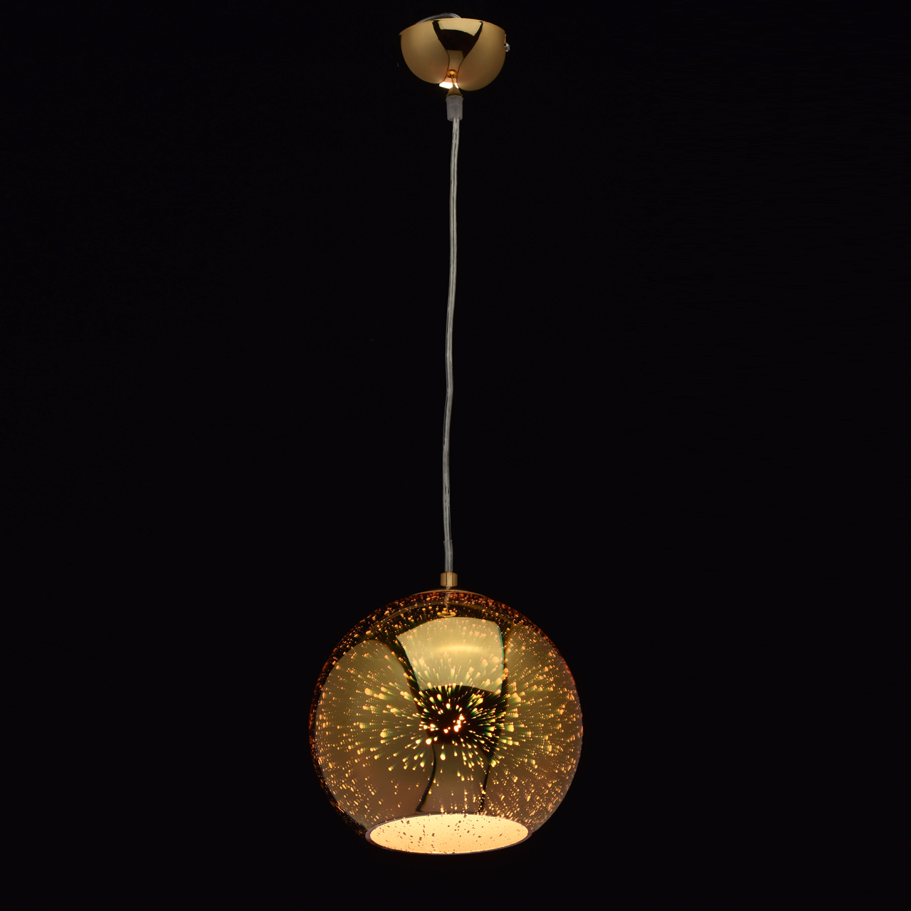 Ультрасовременный модный дизайн Есть возможность регулировать высоту подвеса, меняя на свое усмотрение, положение светильника по отношению к потолку. Необыкновенный 3D рисунок на плафоне создает удивительный эффект звездного неба. Светильник выполнен в 2-х цветах: золото и хром, что позволяет разместить его в разных цветовых решениях интерьера. Несколько размеров светильника позволяют создавать интересные дизайнерские композиции.Стилевые решения интерьера