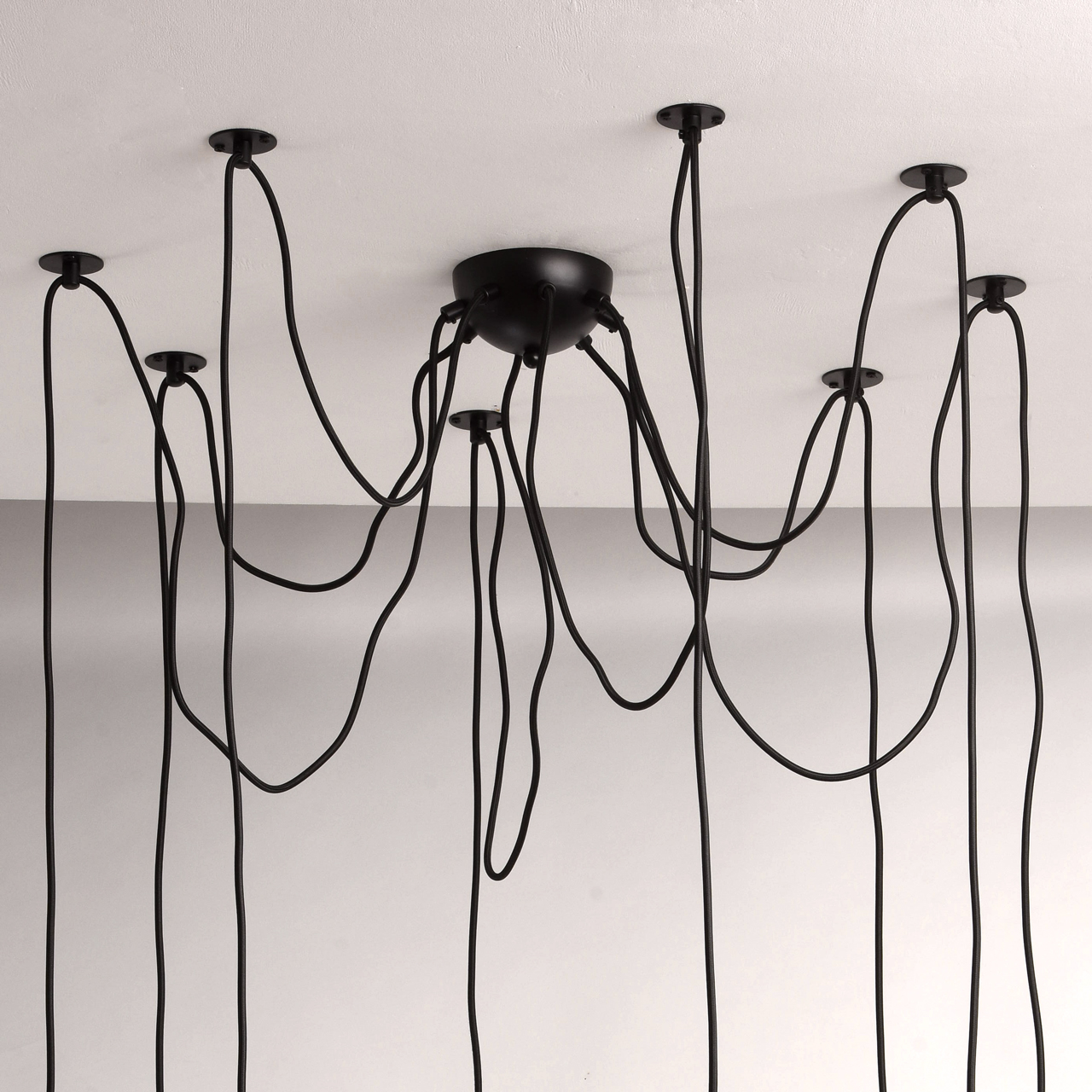 Оригинальная потолочная люстра из коллекции «Фьюжн» освежит и разнообразит интерьер. Металлическое основание и длинные подвесы окрашены в матовый черный цвет. На темном фоне контрастно выделяются округлые стеклянные плафоны цвета шампань. Всего 8 подвесов и плафонов, высоту и размещение которых можно легко менять. «Фьюжн» – не просто светильник, это целая световая система, а значит, доверясь своему вкусу, вы сможете создавать уникальные композиции в интерьере.Преимущества модели
