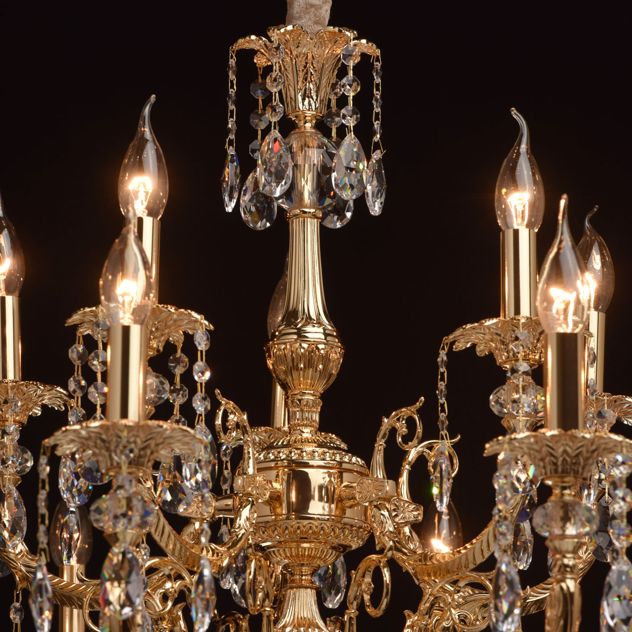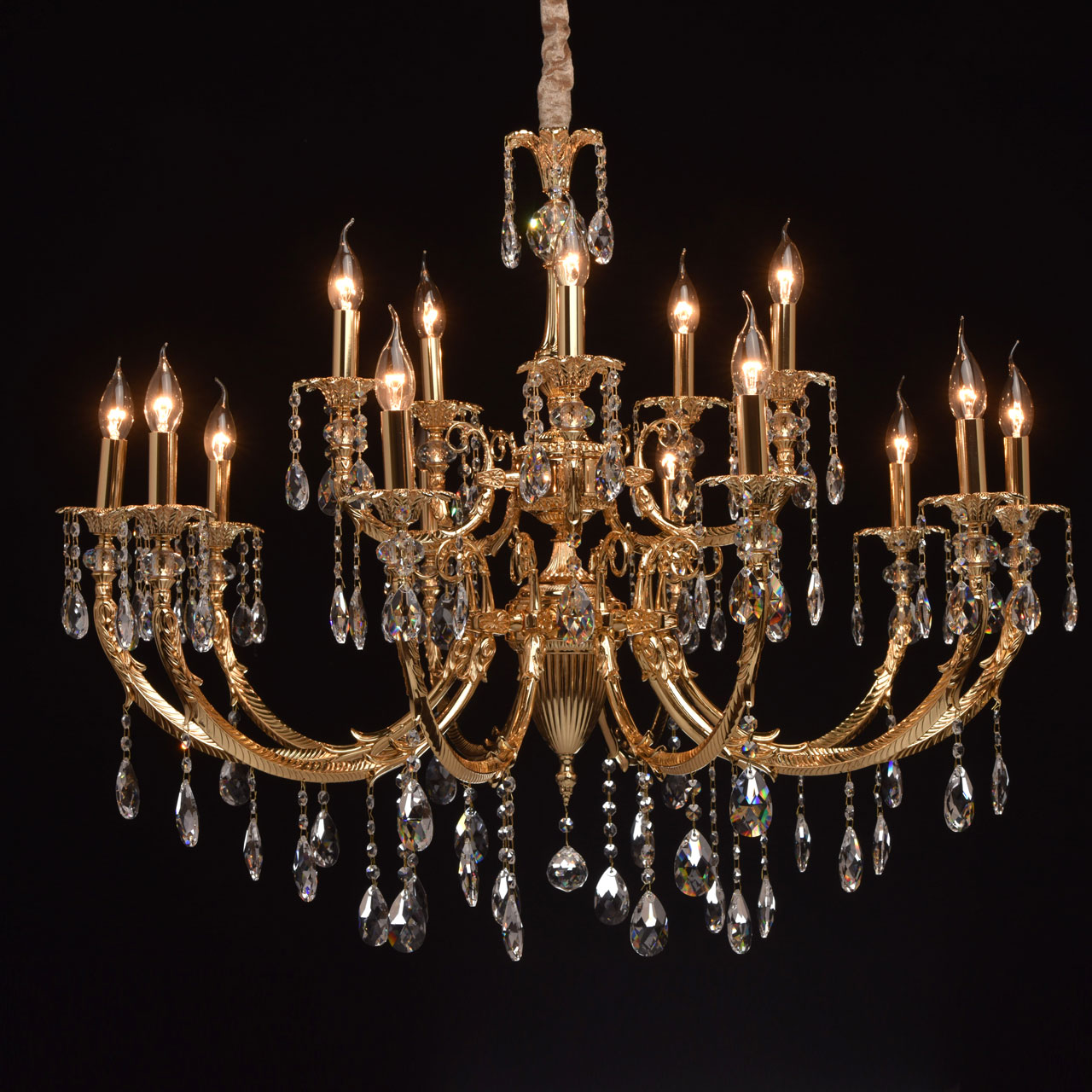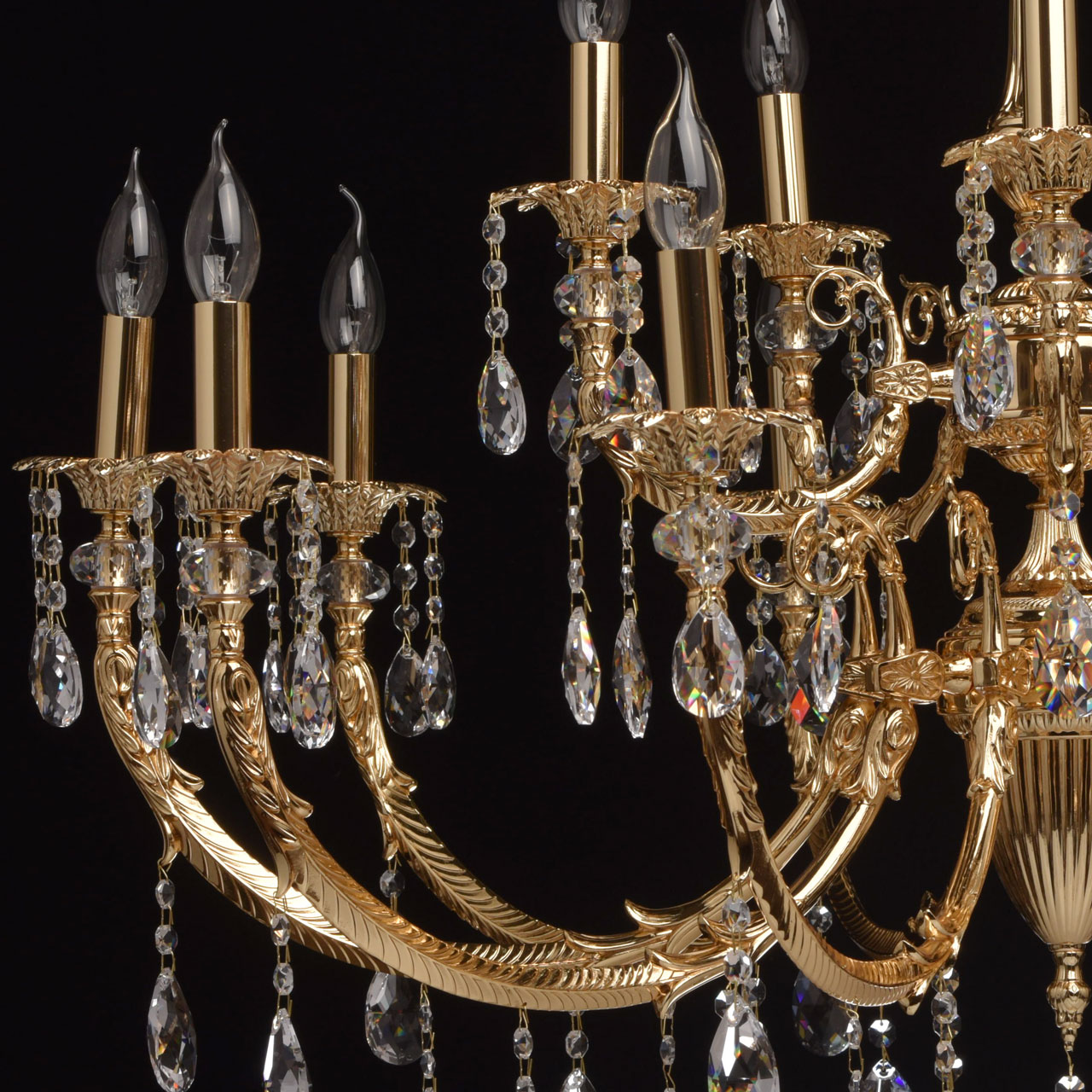 Люстра из коллекции «Габриэль» - воплощение роскоши и изысканной красоты. Утонченное металлическое основание, выполненное из благородной латуни, гальванизировано в цвет золота оригинального оттенка. Грациозные витые рожки подчеркнуты изящными розетками, богатым резным декором и множеством крупных хрустальных подвесов из высококачественного хрусталя Asfour. Такой светильник достоин царских дворцов, но будет прекрасно смотреться и в соответствующее оформленном классическом интерьере.Преимущества модели