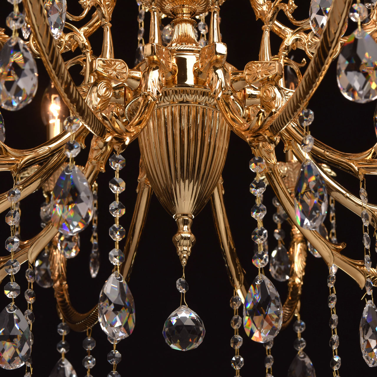 Люстра из коллекции «Габриэль» - воплощение роскоши и изысканной красоты. Утонченное металлическое основание, выполненное из благородной латуни, гальванизировано в цвет золота оригинального оттенка. Грациозные витые рожки подчеркнуты изящными розетками, богатым резным декором и множеством крупных хрустальных подвесов из высококачественного хрусталя Asfour. Такой светильник достоин царских дворцов, но будет прекрасно смотреться и в соответствующее оформленном классическом интерьере.Стилевые решения интерьера