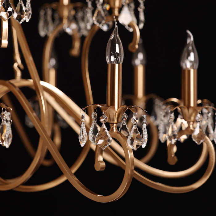 Изысканный образ светильнику придают цвет античной бронзы и хрустальный декор. Многоярусность и сложные изгибы рожков придают люстре оригинальность и уникальность, делая ее привлекательным акцентом в помещении. Заменяемые источники света удобны в эксплуатации. Возможность регулировать комфортную высоту.Металлическое основание подвесной люстры гальванизировано в цвет античной бронзы. Светильник декорирован прозрачным хрусталем формы дубовый лист.