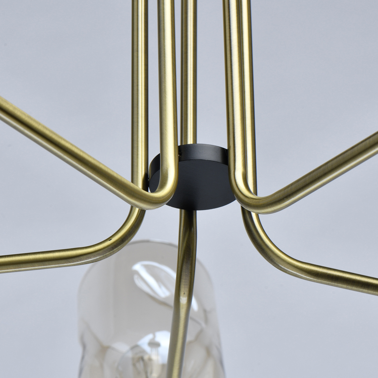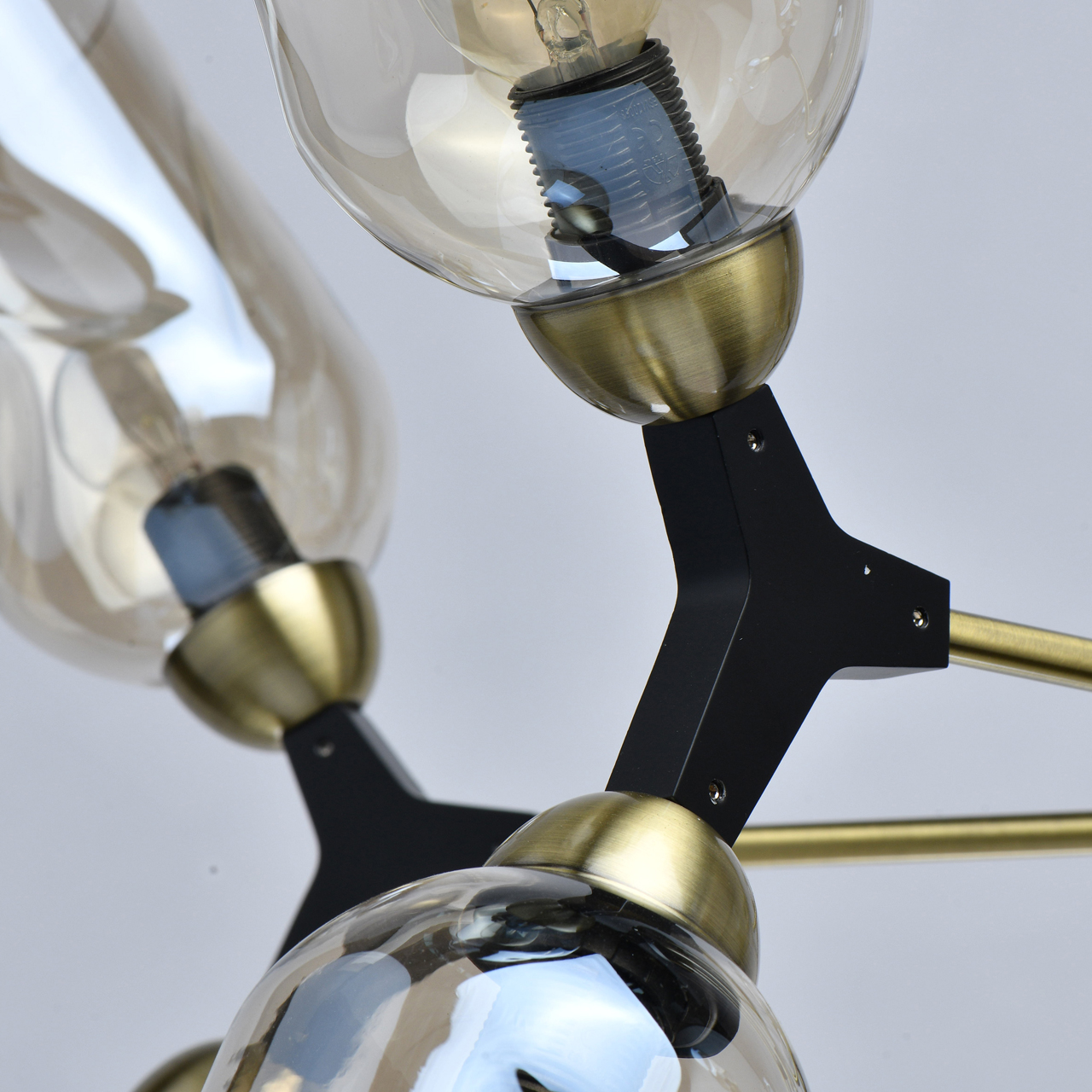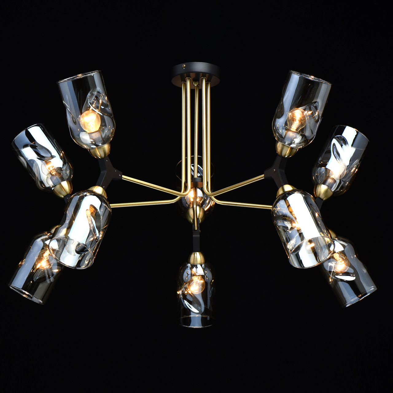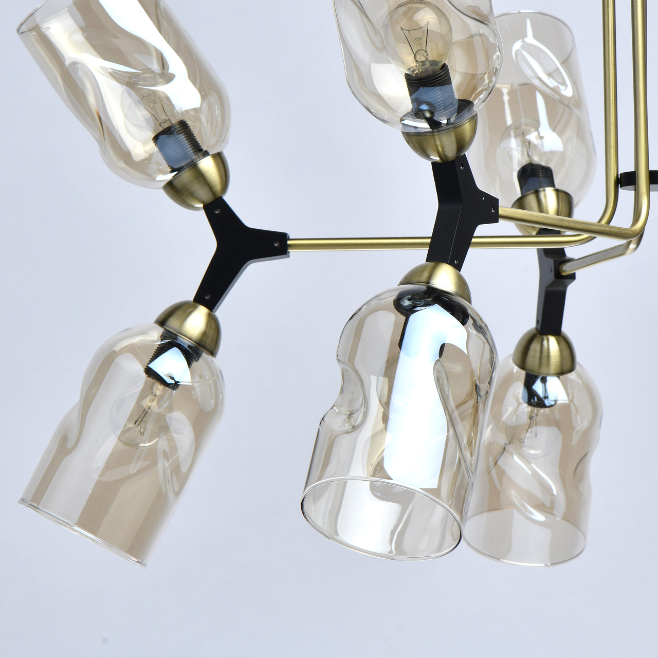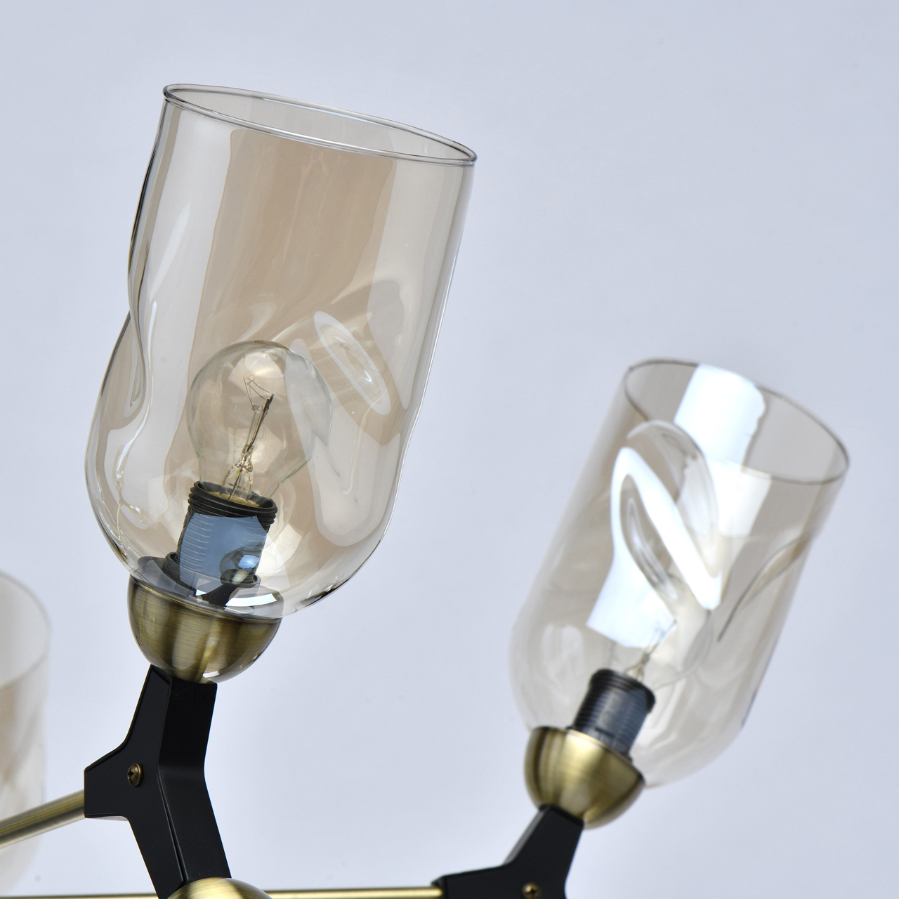 Основание светильника выполнено из металла и гальванизировано в цвет латуни. Отдельные элементы основания окрашены в черный цвет. Светильник декорирован стеклянными плафонами сложной формы, гальванизированными в цвет шампань.Тип помещения
