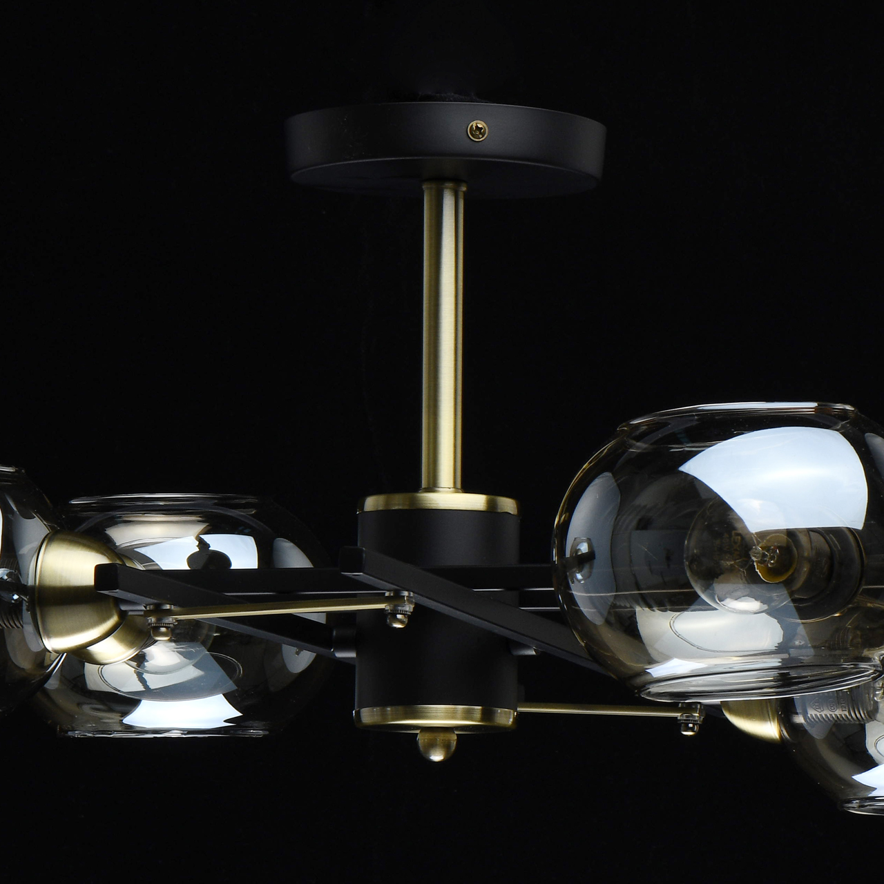 Основание светильника выполнено из металла и окрашено в черный цвет. Отдельные элементы основания гальванизированы в цвет латуни. Светильник декорирован стеклянными плафонами оригинальной формы, гальванизированными в цвет шампань.Тип помещения