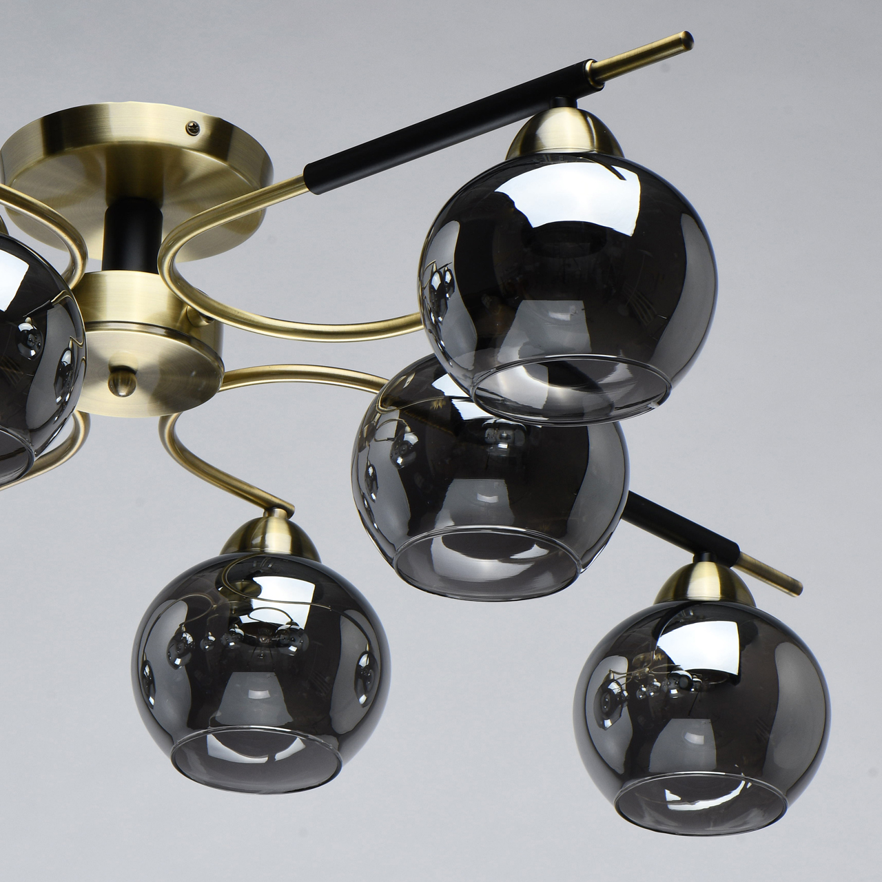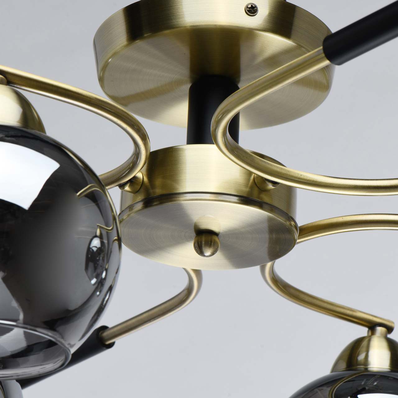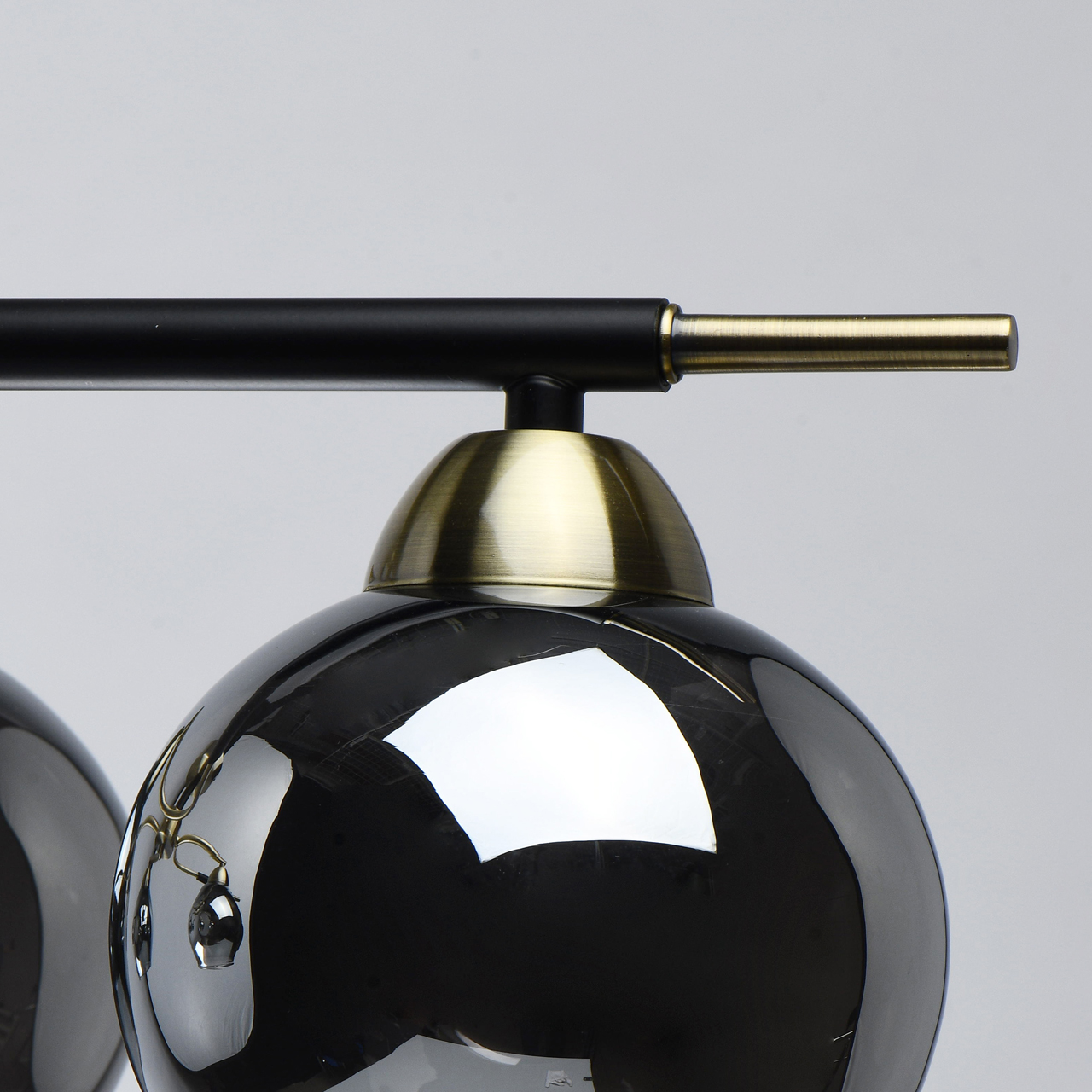 Металлическое основание светильника гальванизировано в цвет античной бронзы. Отдельные элементы основания окрашены в черный цвет. Стеклянные плафоны гальванизированы в дымчатый цвет.Тип помещения