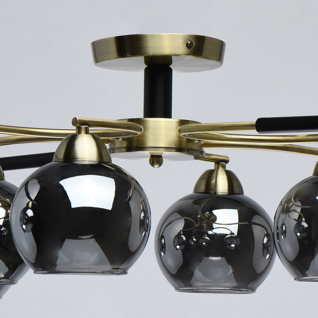 Актуальная стилистика лофта, сочетание металлов цвета античной бронзы и черного. Компактная высота светильника идеальна для стандартной высоты потолка. Стеклянные плафоны гальванизированы в дымчатый цвет, создают комфортный свет. Ассиметрия раздвоенных рожков придает легкости модели. Полная семья из бра, потолочных светильников на 6 и 8 ламп.Стилевые решения интерьера