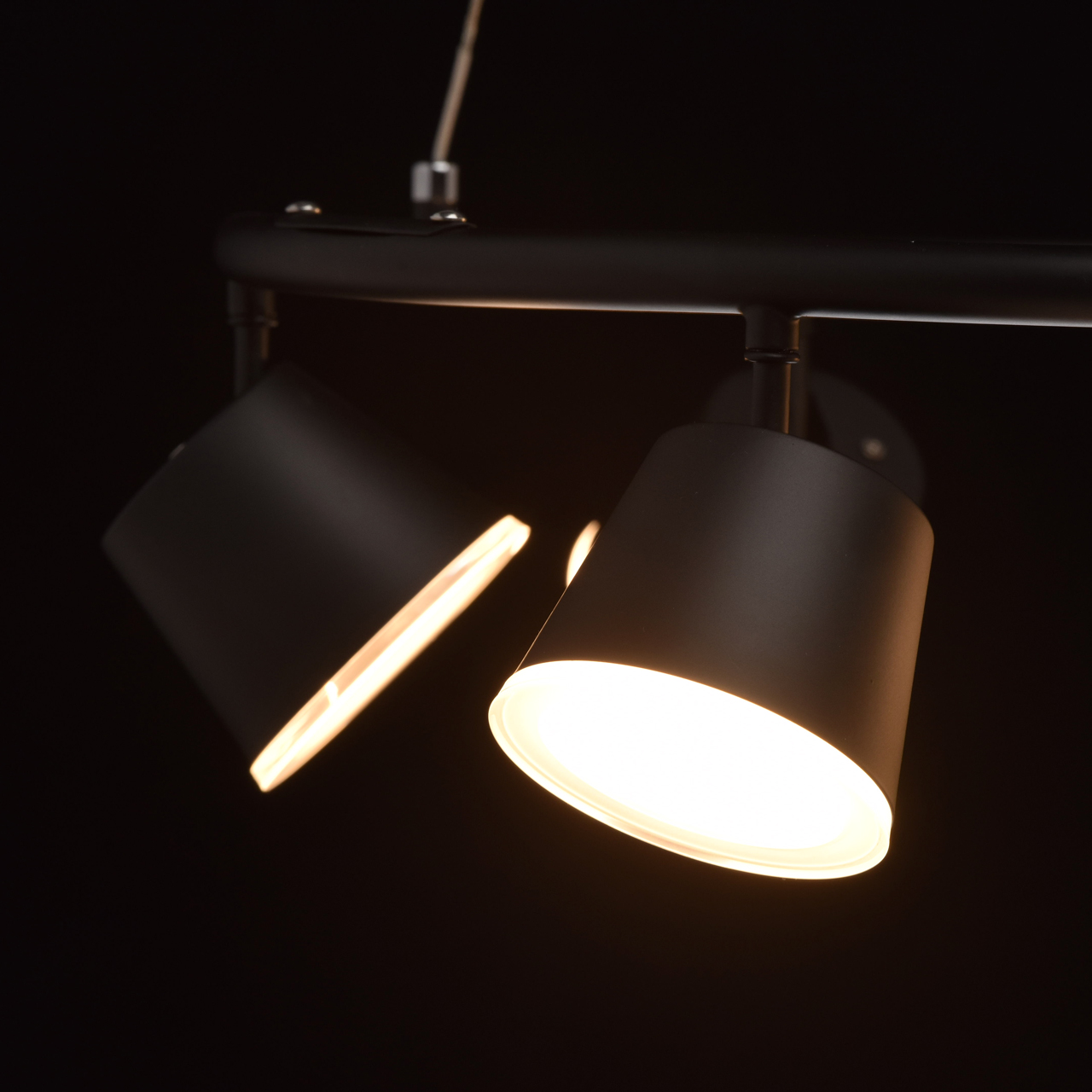 Арматура: основание из металла окрашено в черный цвет. Светильник оснащен металлическими тросами в силиконовой оплетке и ручным лифтом. Плафоны выполнены из сплава аллюминия и окрашены в черный цвет, расположены на регулируемых кронштейнах. Источники света типа COB закрыты белым матовым акрилом.Тип помещения