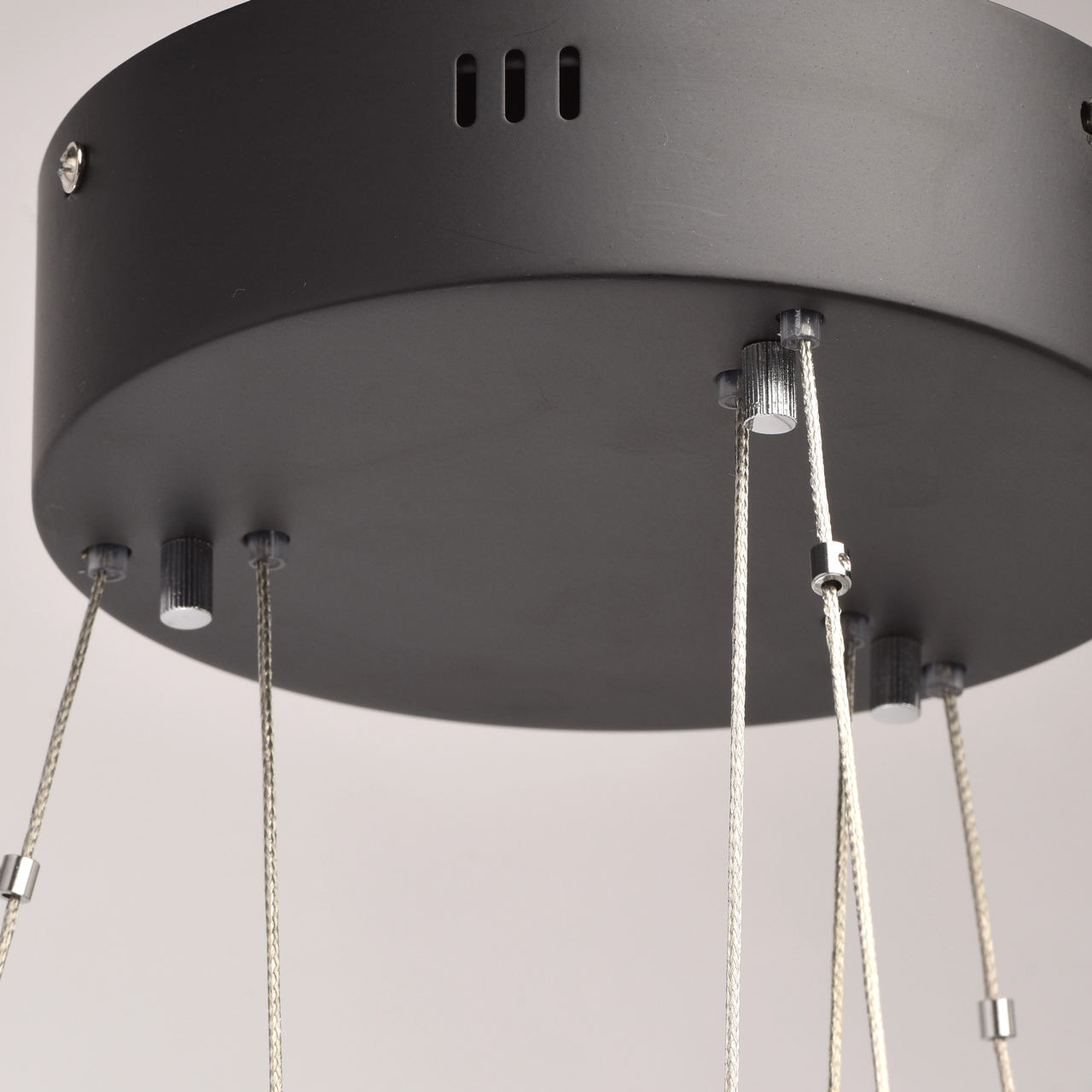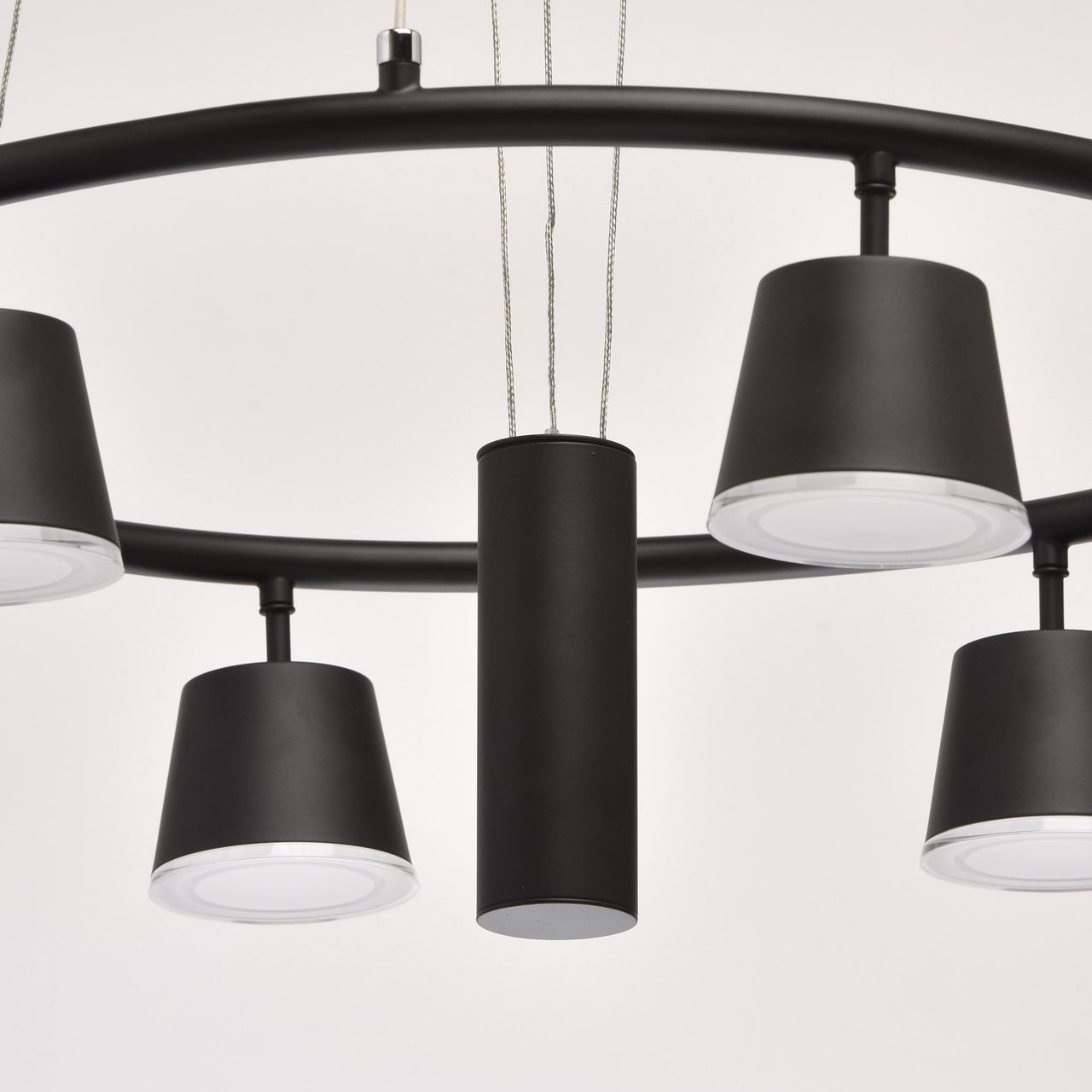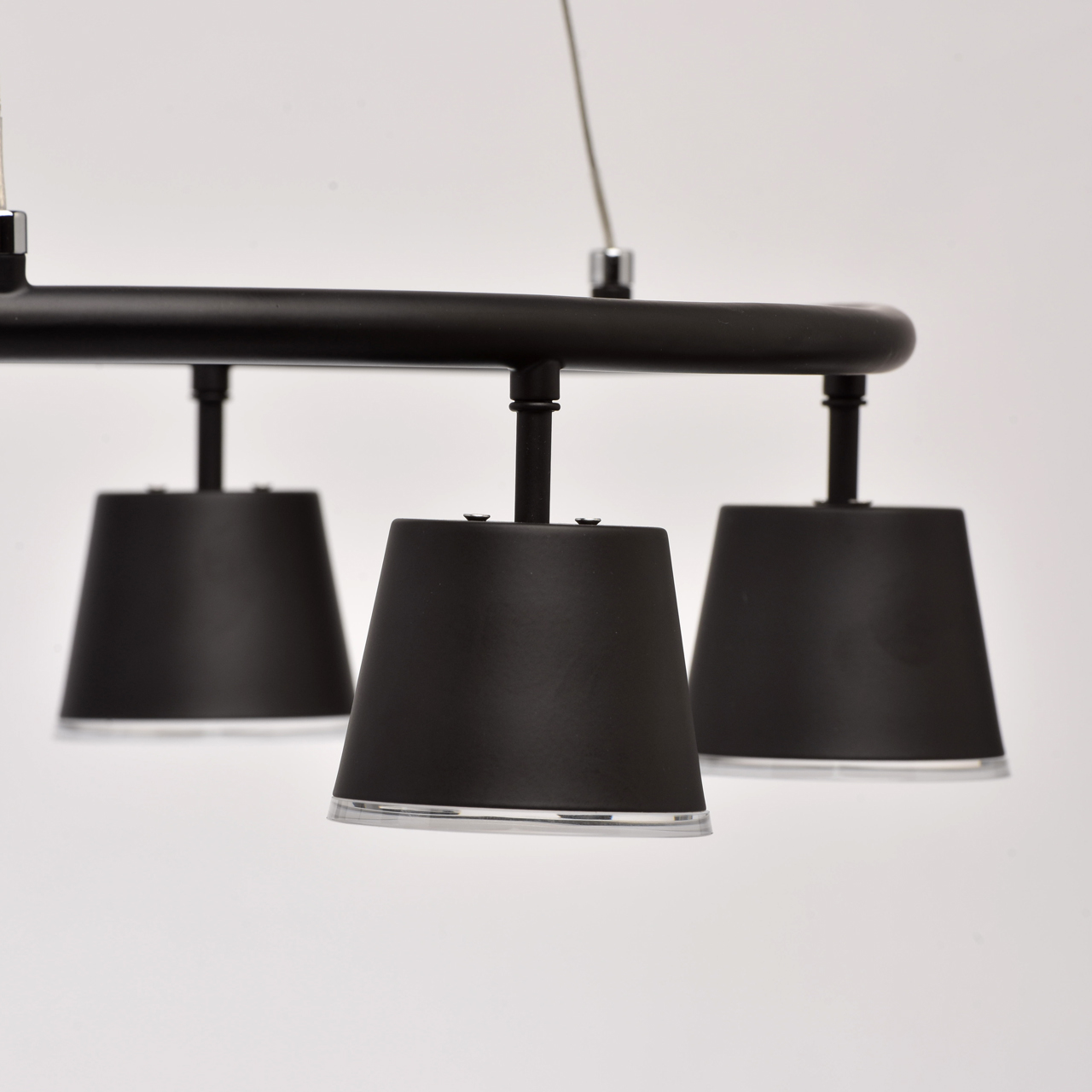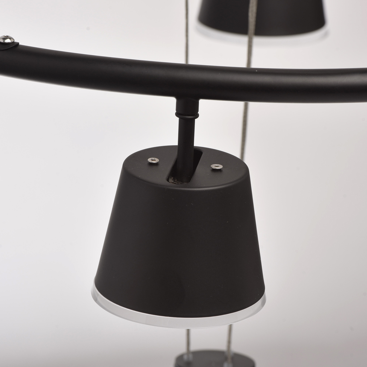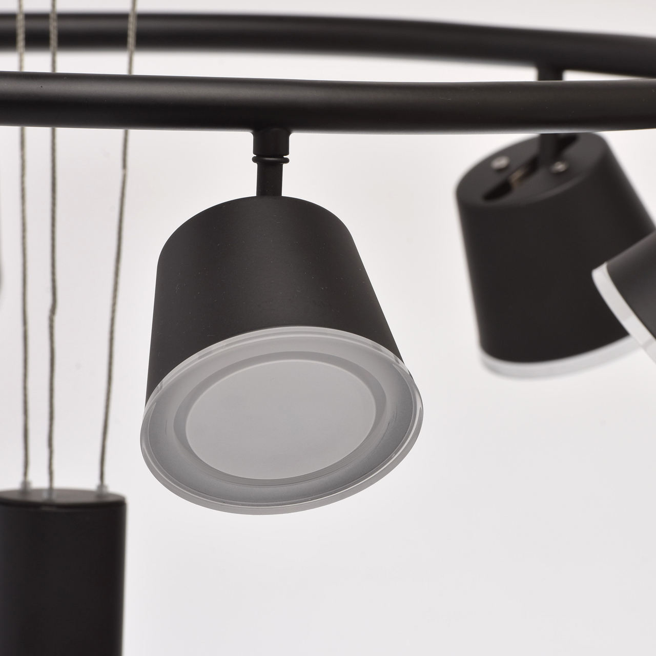 Люстра выполнена в ультрасовременном минималистичном стиле. Благодаря декоративному противовесу можно легко регулировать длину подвесов, меняя положение люстры по отношению к потолку Круглая форма подвеса делает его идеальным для зонального освещения обеденной зоны Спотовая система дает возможность менять направление светового потока Плафоны светильника окрашены в модный черный цвет Светильник оснащен экономичными и долговечными светодиодными элементами.Стилевые решения интерьера