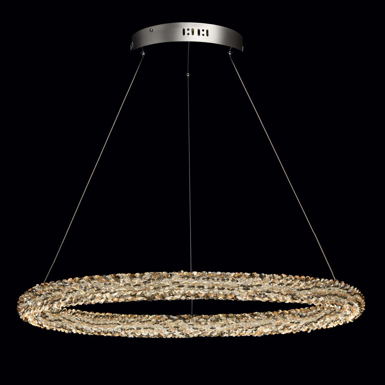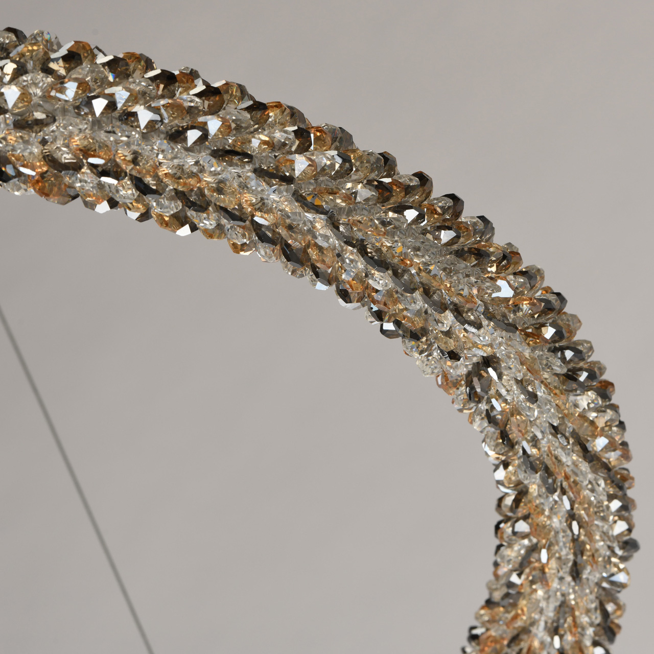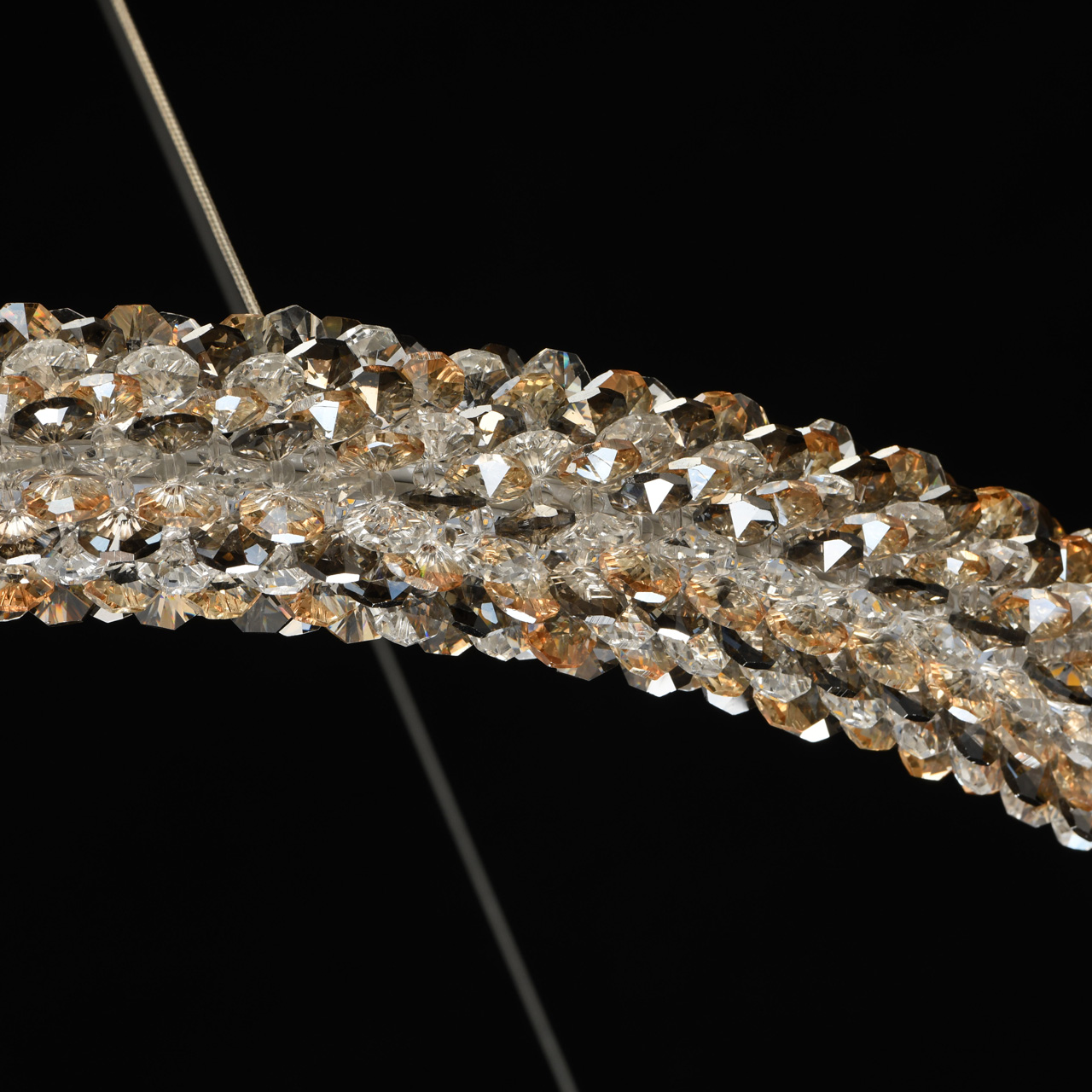Люстра из коллекции «Гослар» сочетает в себе современный трендовый дизайн и подлинную роскошь. Хромированное металлическое основание с зеркальным эффектом дополнено оригинальным плафоном в виде концентрического круга – это один из последних трендов в мире света. Кольцо выполнено в двух вариациях, каждая из которых смотрится по-своему шикарно: это витые бусы из прозрачного хрусталя, а также переплетение хрустальных бус трех оттенков – дымчатого, прозрачного и янтарного. Помимо этого, светильник радует функциональностью: с помощью пульта можно контролировать яркость освещения.Преимущества модели
