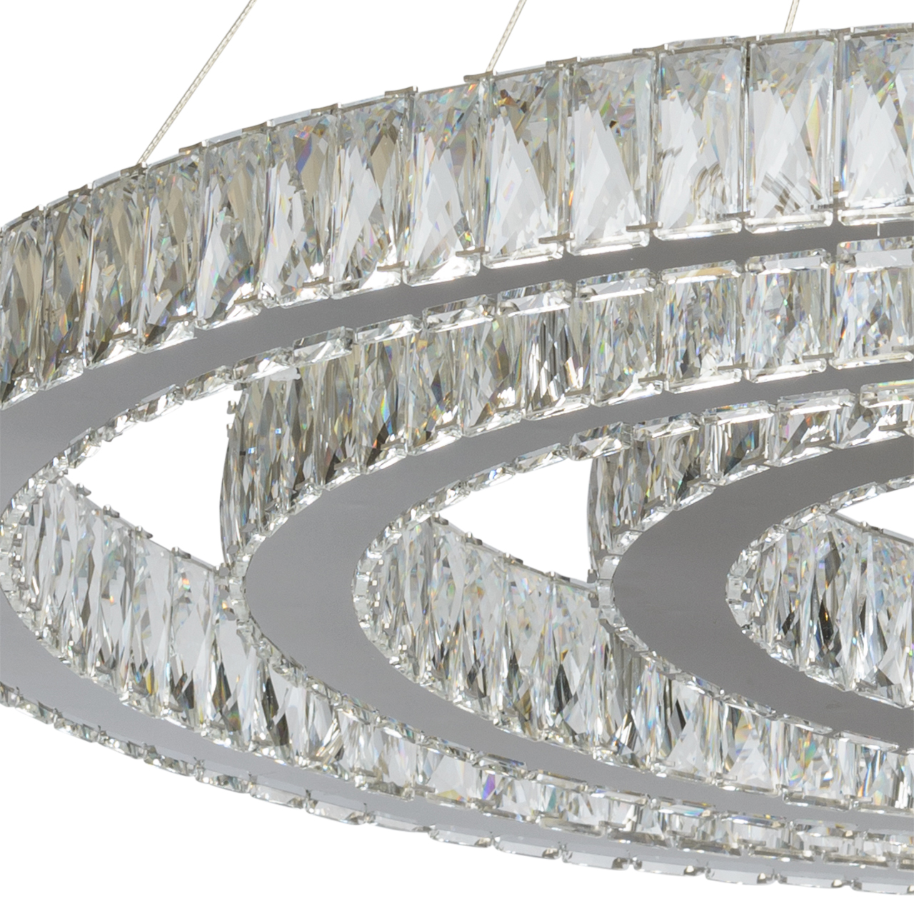 Основание выполнено из сплава металла, гальванизировано в цвет хрома. Каркас светильника выполнен из нержавеющей стали. С двух сторон светильник декорирован хрусталем сложной огранки с множеством центров схождения граней. Светодиоды на микросхемах. Световая температура 4000 - 4200 К. Лампы в комплекте.Тип помещения