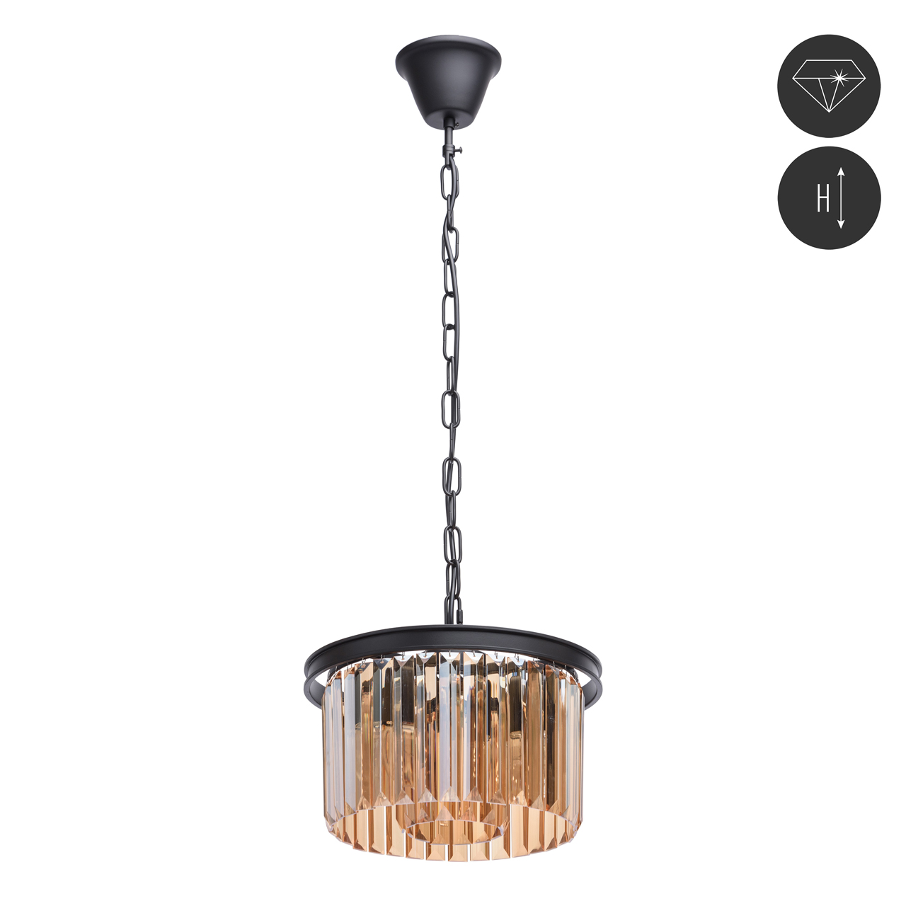 Основание выполнено из металла и окрашено в черный матовый цвет. Декоративные подвески из хрусталя прямоугольной формы, гальванизированного в цвет топаза.Тип помещения
