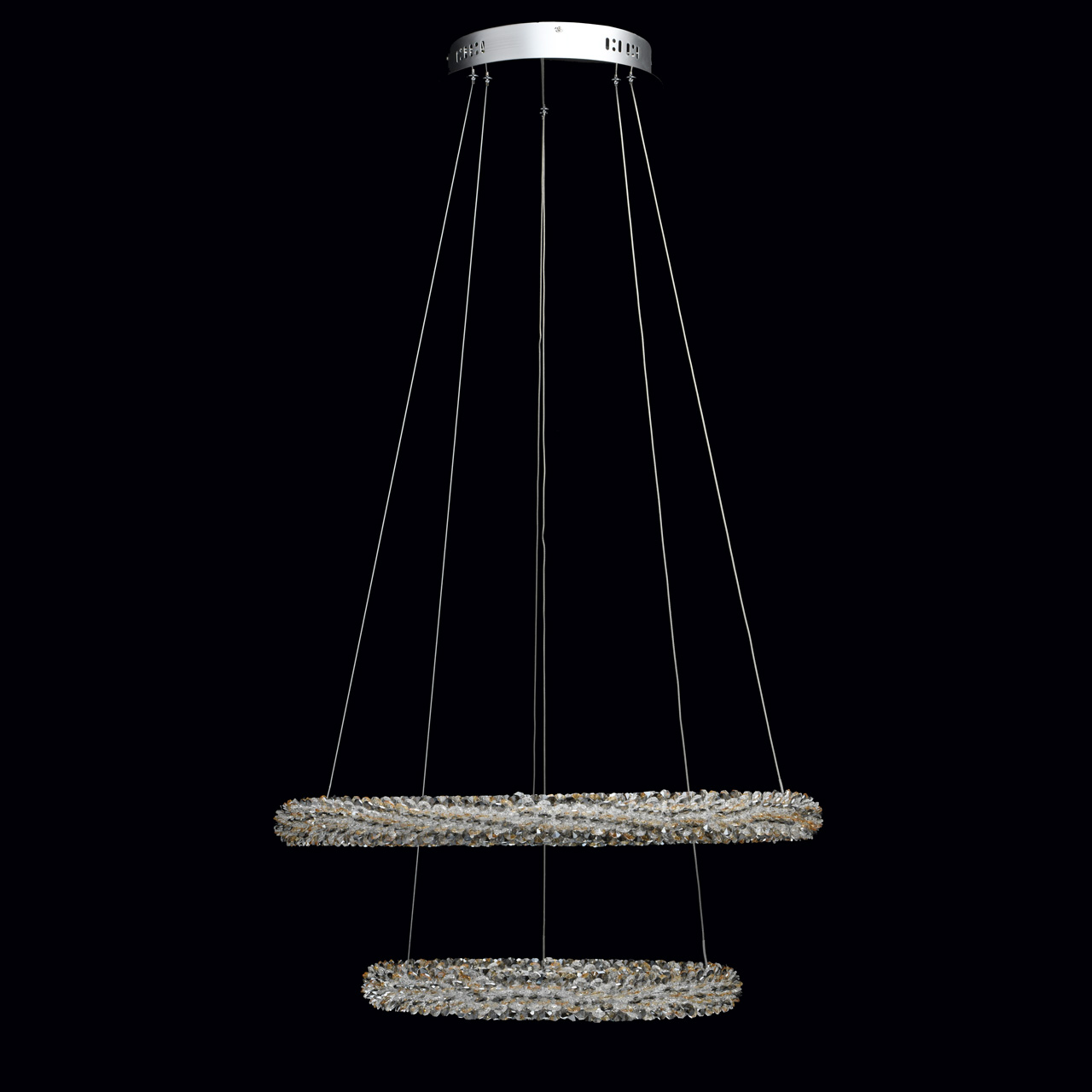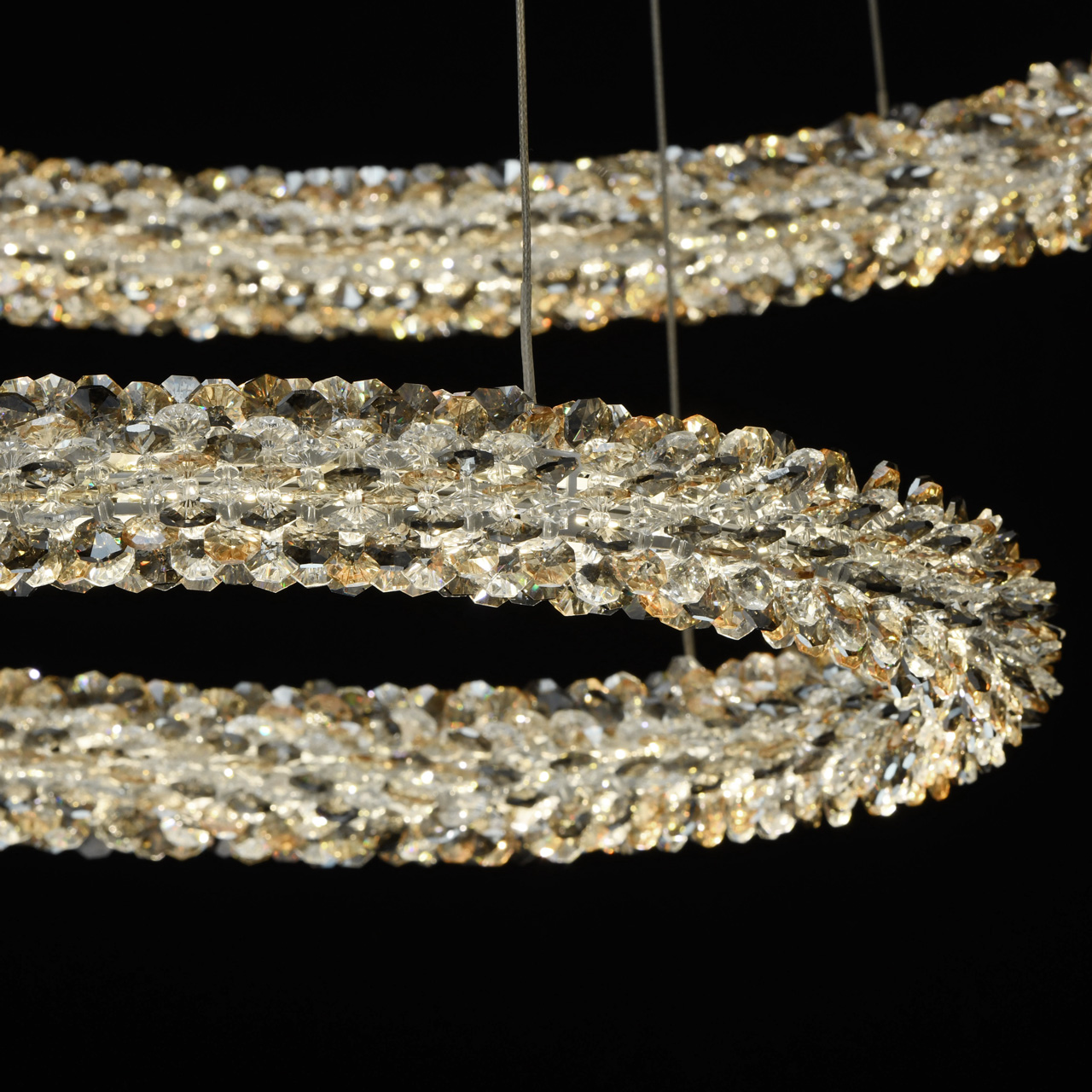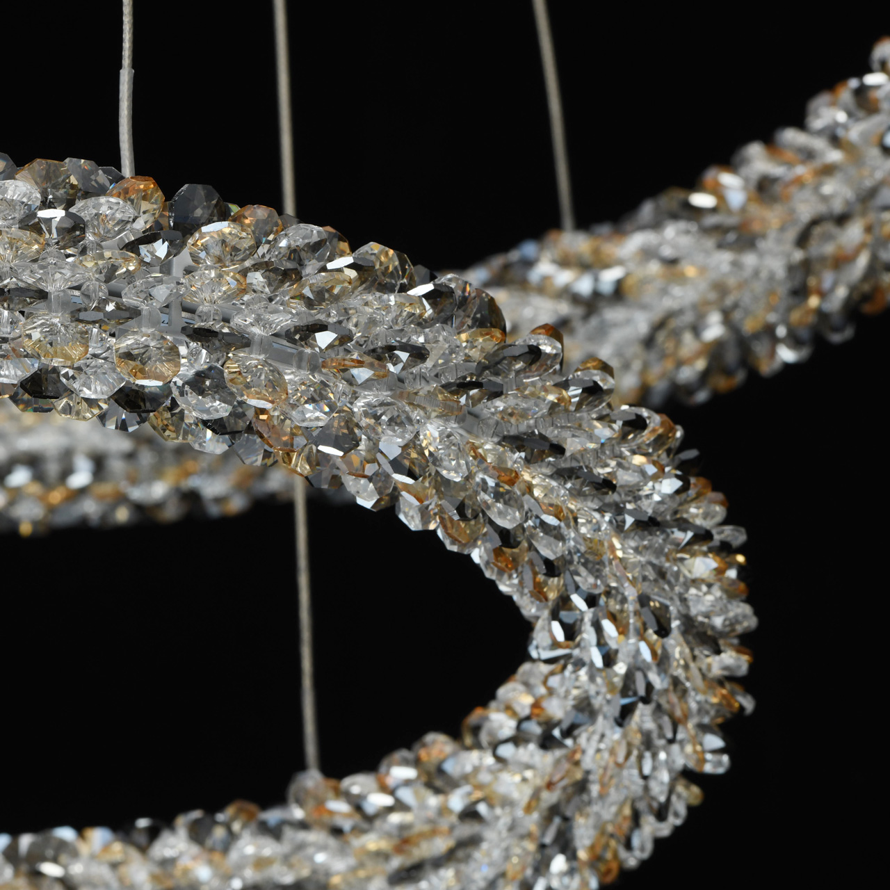 Люстра из коллекции «Гослар» сочетает в себе современный трендовый дизайн и подлинную роскошь. Хромированное металлическое основание с зеркальным эффектом дополнено оригинальными плафонами в виде концентрических кругов – это один из последних трендов в мире света. Кольца выполнены в двух вариациях, каждая из которых смотрится по-своему шикарно: это витые бусы из прозрачного хрусталя, а также переплетение хрустальных бус трех оттенков – дымчатого, прозрачного и янтарного. Помимо этого, светильник радует функциональностью: с помощью пульта можно контролировать яркость освещения.Преимущества модели