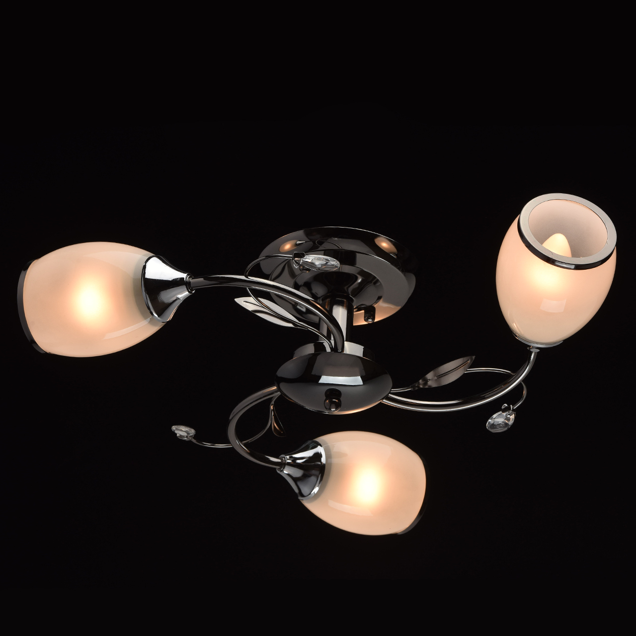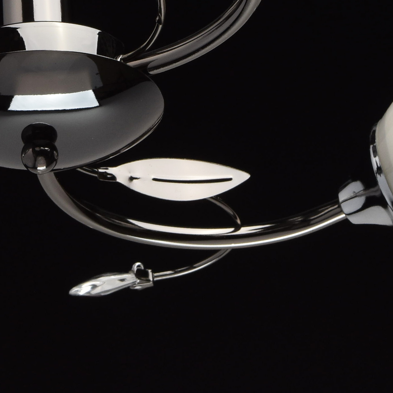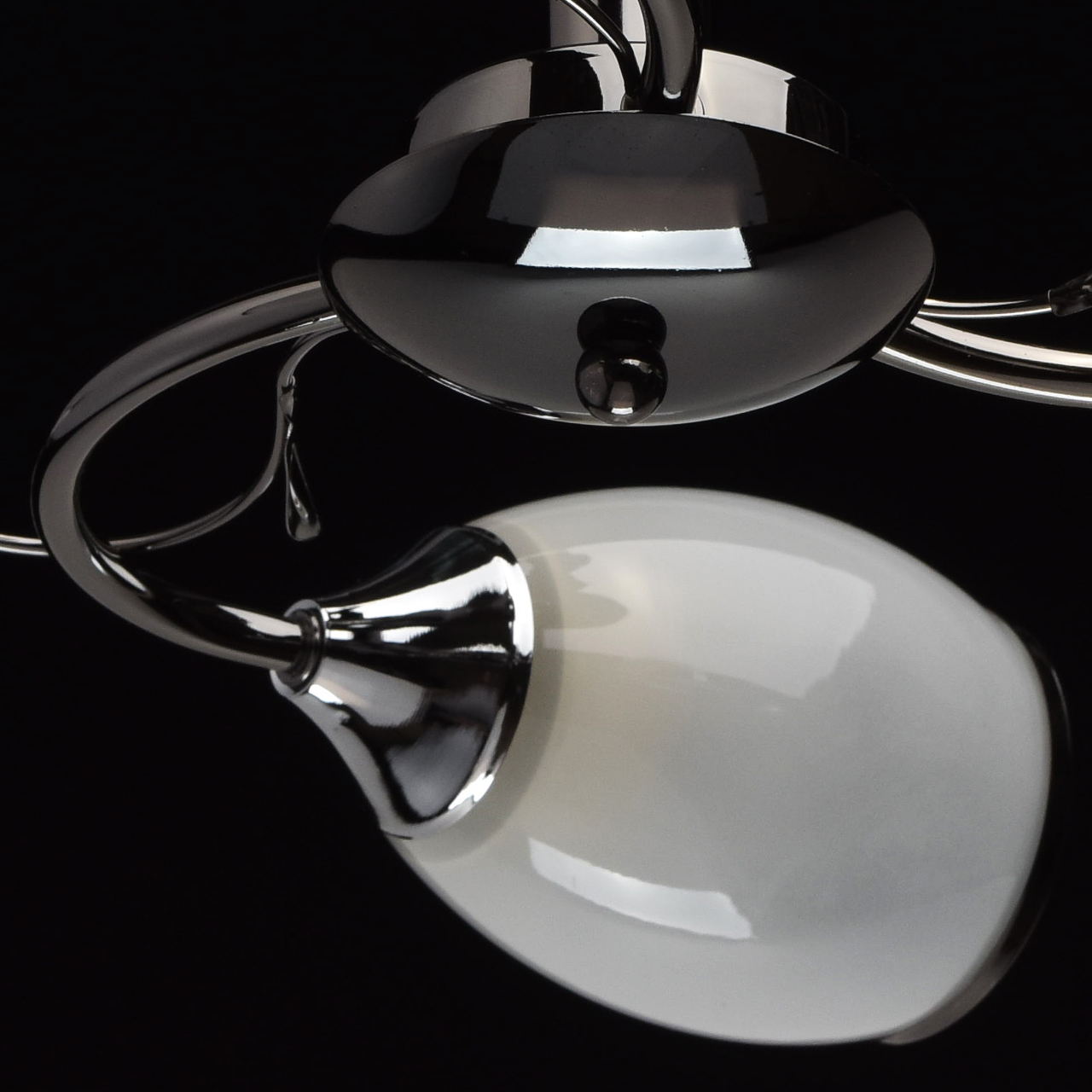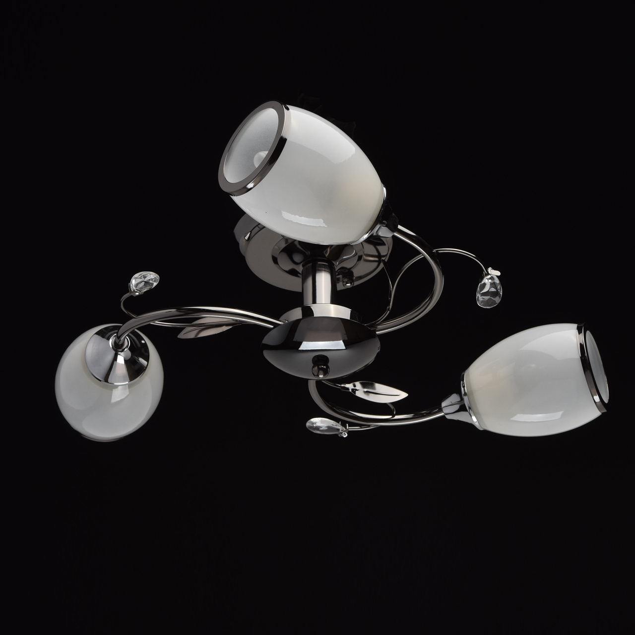 Основание светильника выполнено из металла, гальванизация в цвет никеля. Потолочная чаша, корпус, держатели плафонов изготовлены по технологии токарной обработки, рожки и завитки - прокат на роликовом станке. Светильник декорирован стеклянными плафонами, отлитыми в форму, с последующим матированием внутренней поверхности. Декоративные элементы на завитках из декоративного стекла в форме миндаля.Тип помещения