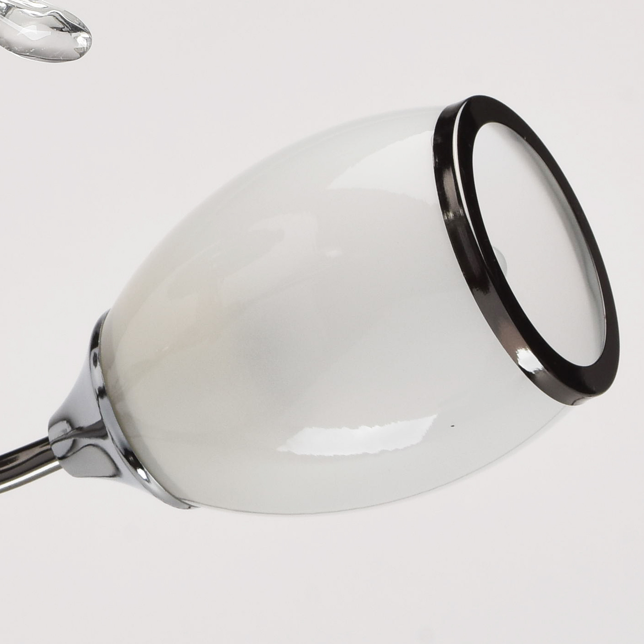 Стильная и элегантная люстра из коллекции «Грация» идеально дополнит современный интерьер. Основание из металла цвета чёрного никеля гармонично сочетается с тонкими изогнутыми рожками. Этот дуэт прекрасно разбавляют белые стеклянные плафоны. Легкий декор из хрустального стекла и растительные элементы из металла оживляют композицию.Преимущества модели