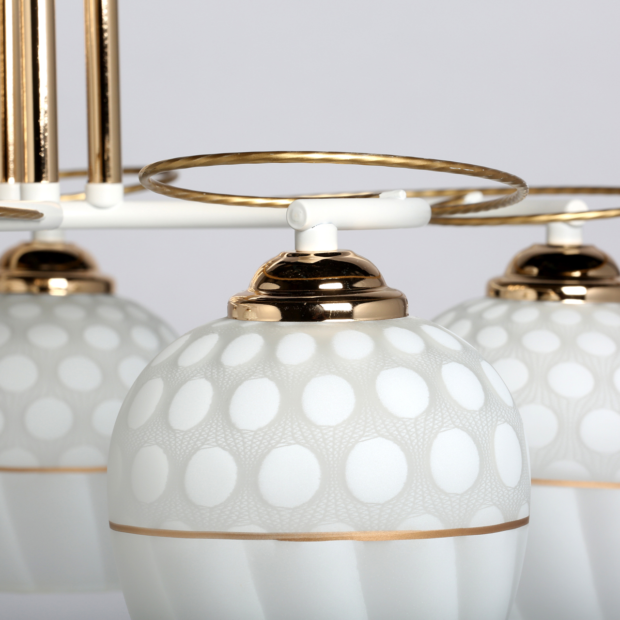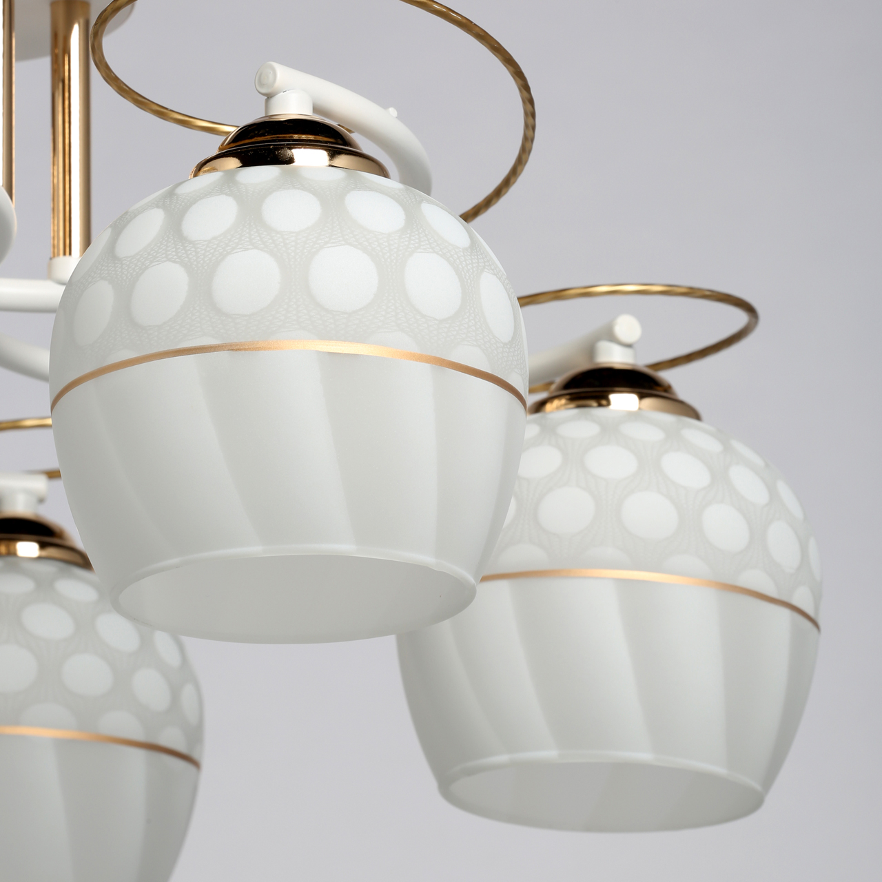 Основание светильника выполнено из металла и окрашено в белый цвет. Отдельные элементы гальванизированы в цвет золота. Декоративные элементы выполнены по технологии твист. Стеклянные плафоны матированы и декорированы золотой полоской.Тип помещения