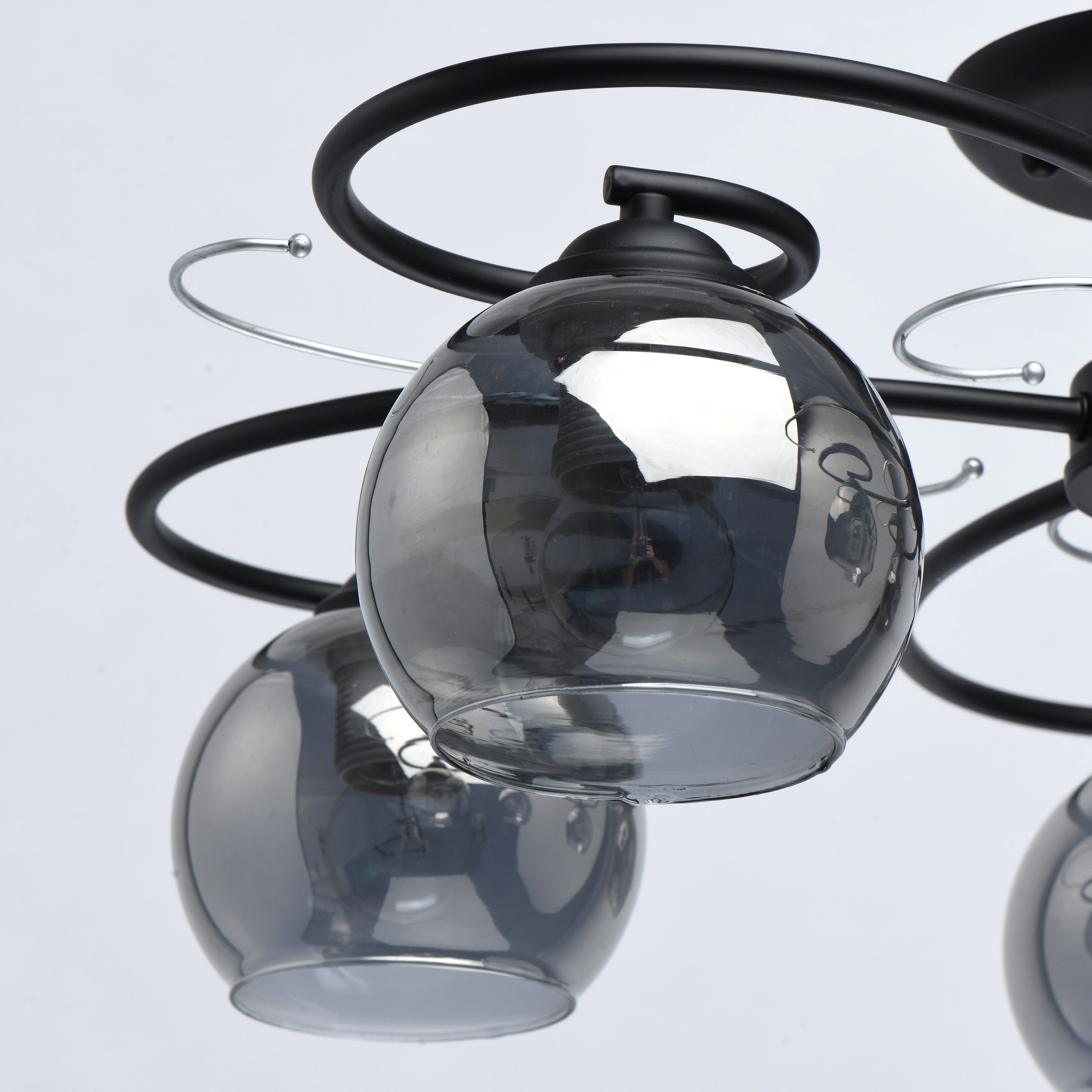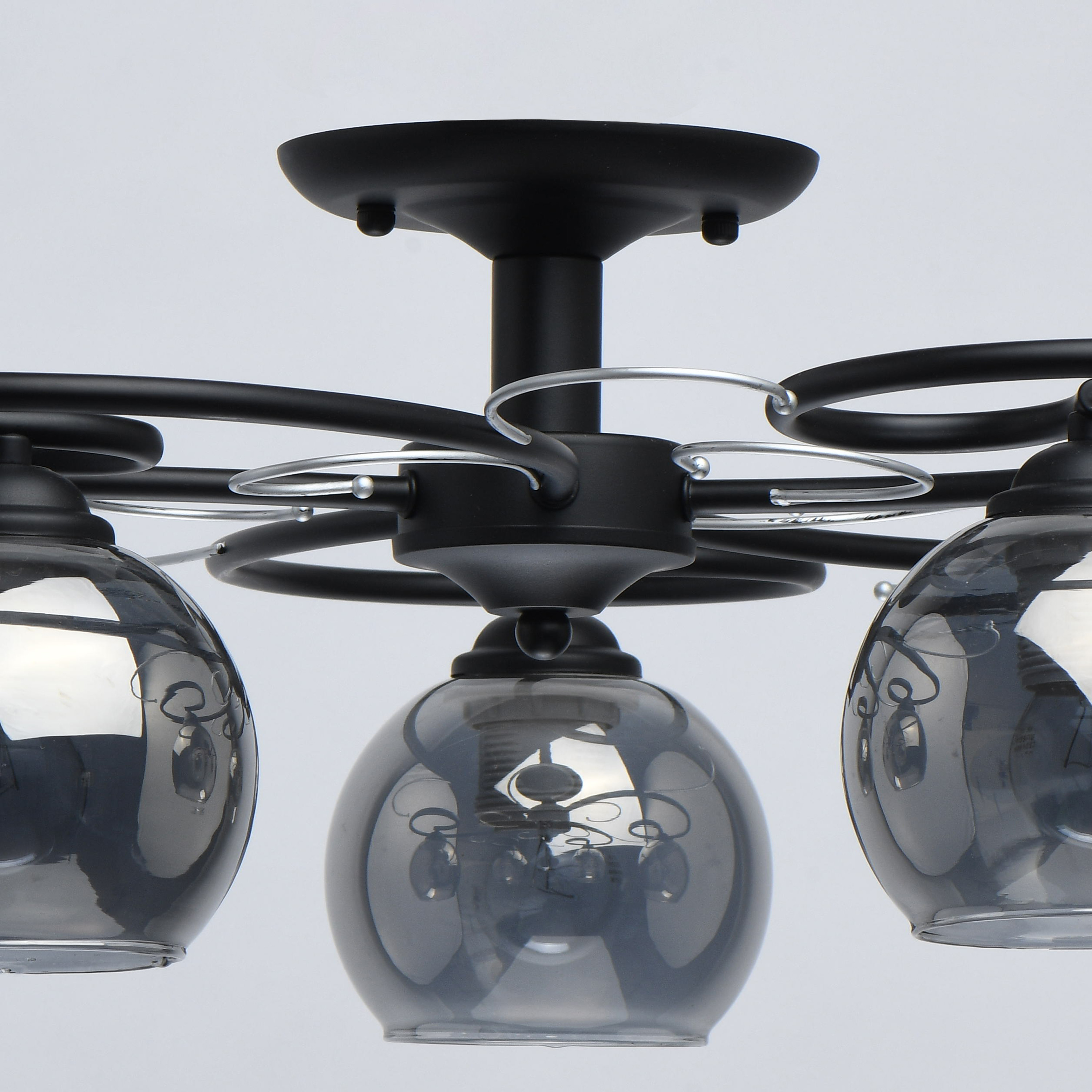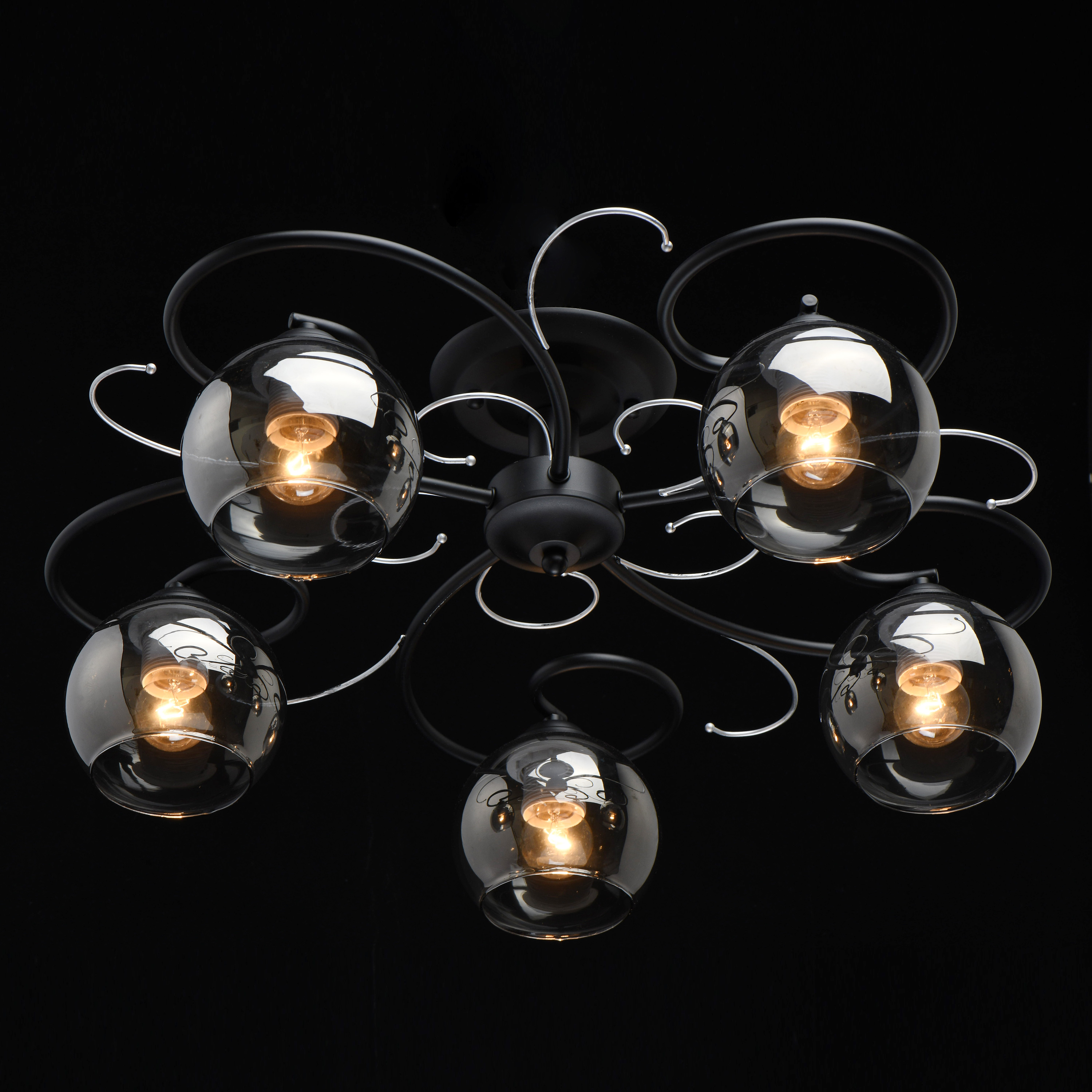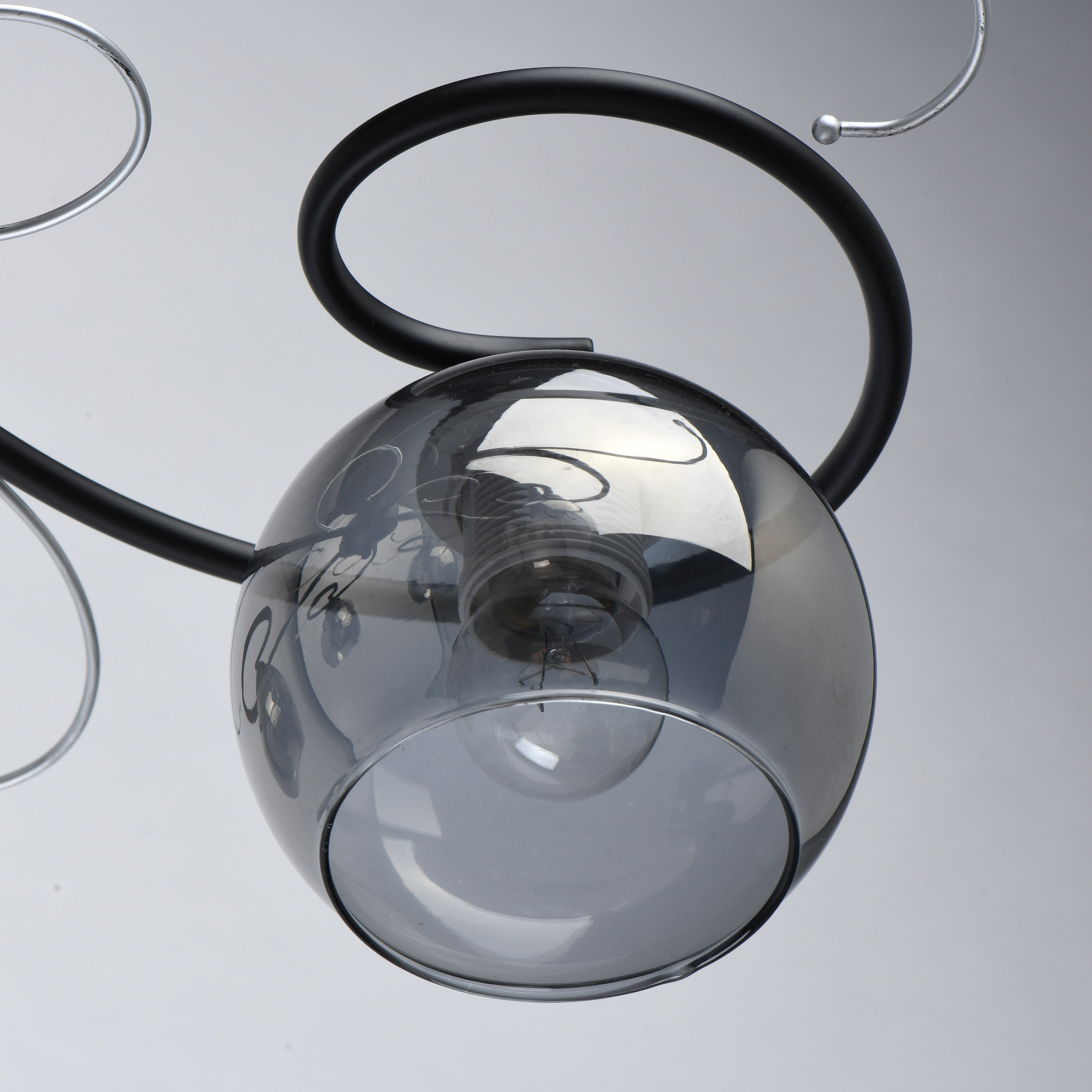 Основание светильника выполнено из металла и окрашено в черный цвет. Декоративные элементы окрашены в цвет серебра. Стеклянные плафоны круглой формы гальванизированы в дымчатый цвет.Тип помещения