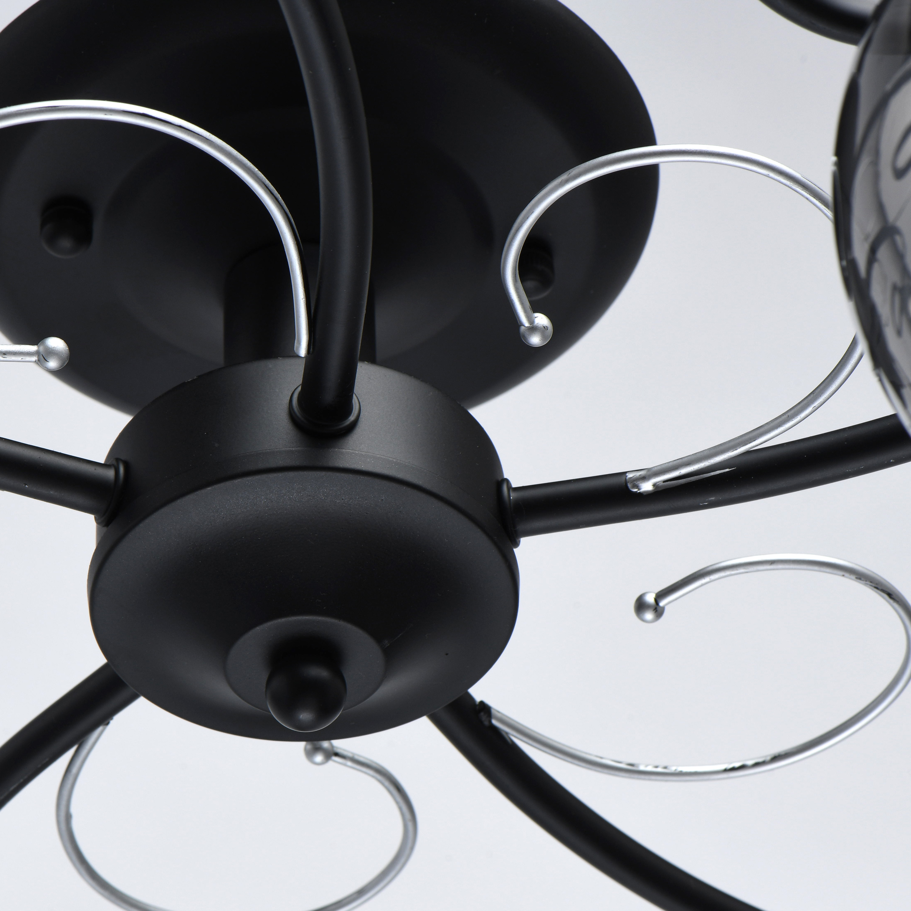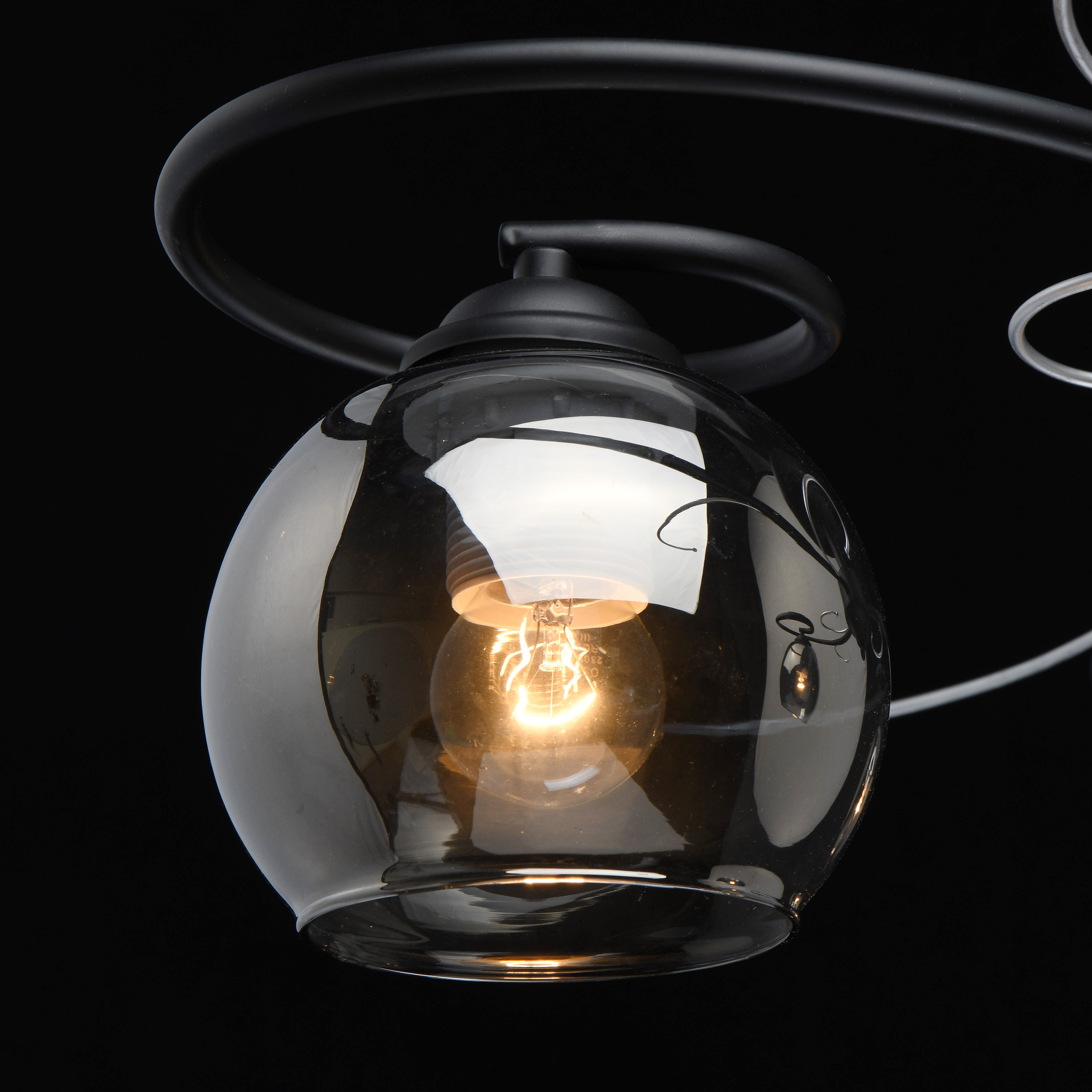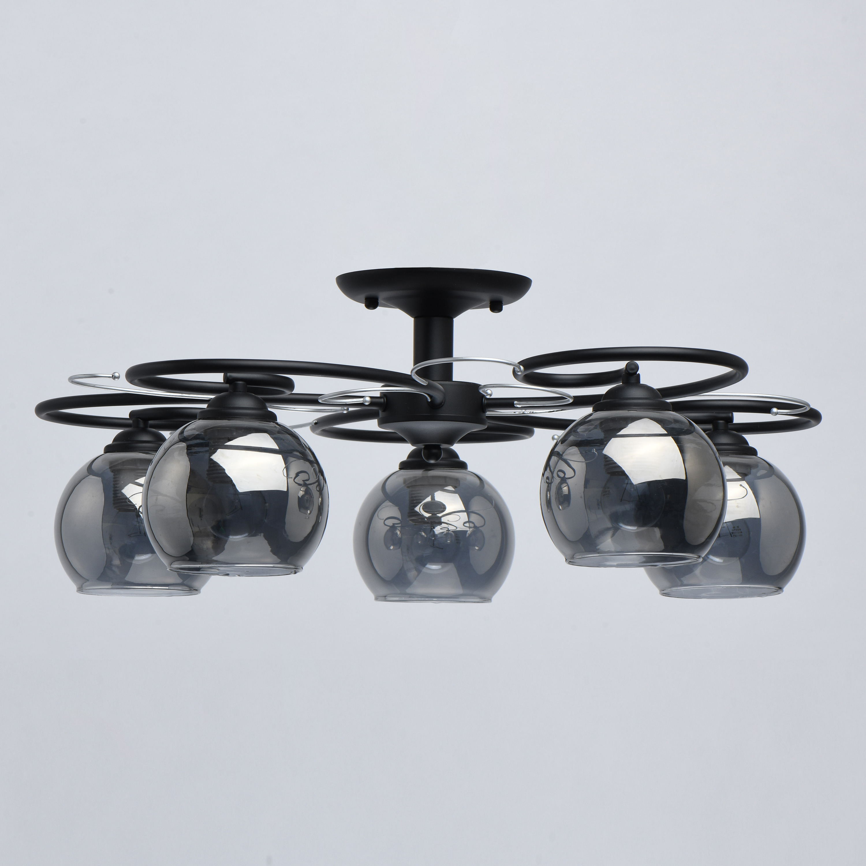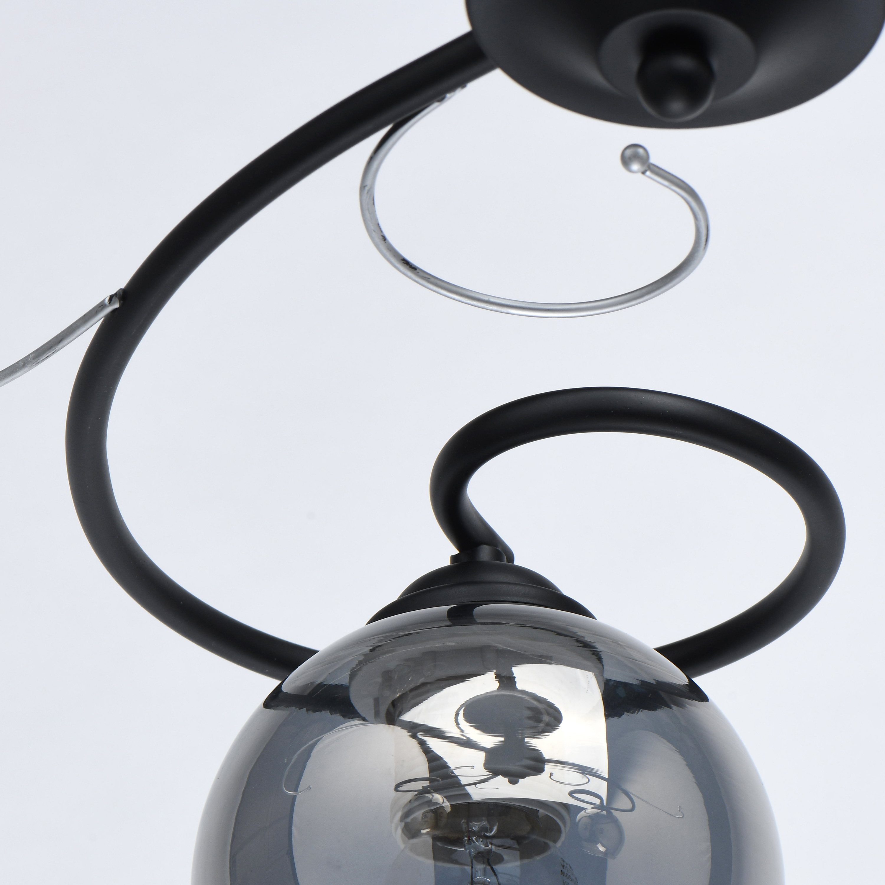 Основание светильника выполнено из металла и окрашено в черный цвет. Декоративные элементы окрашены в цвет серебра. Стеклянные плафоны круглой формы гальванизированы в дымчатый цвет.Тип помещения