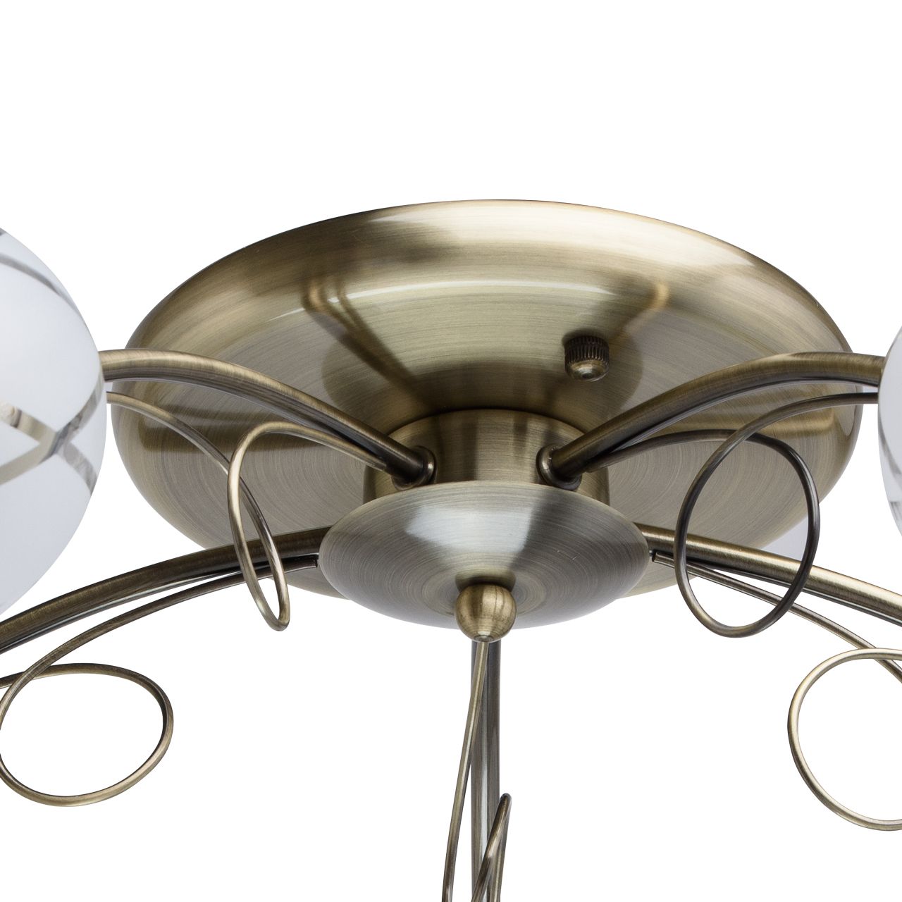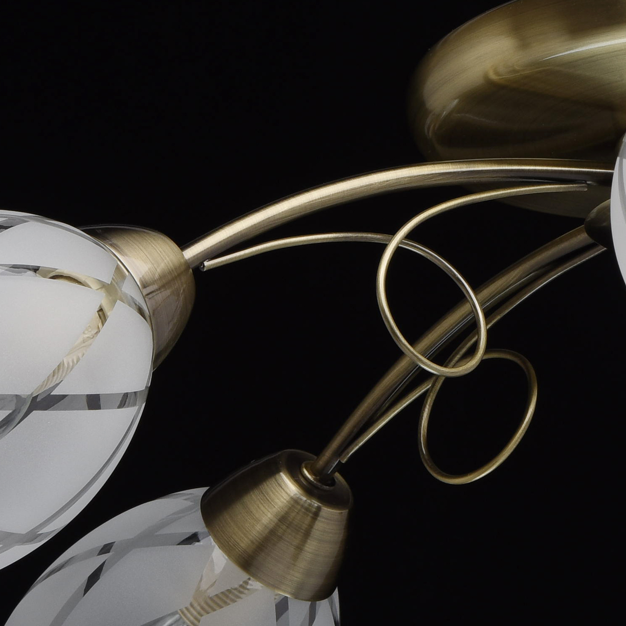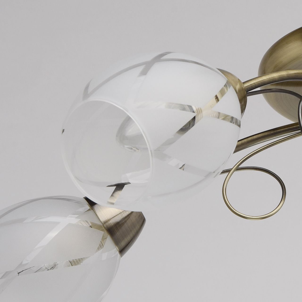 Основание светильника выполнено из металла, гальванизация в цвет античной бронзы. Потолочная чаша, держатели плафонов изготовлены по технологии токарной обработки, рожки и завитки - прокат на роликовом станке. Плафоны из стекла, отлитого в форму. Внешняя поверхность плафонов матирована по трафарету. Края плафонов обработаны по технологии оплавления.Тип помещения
