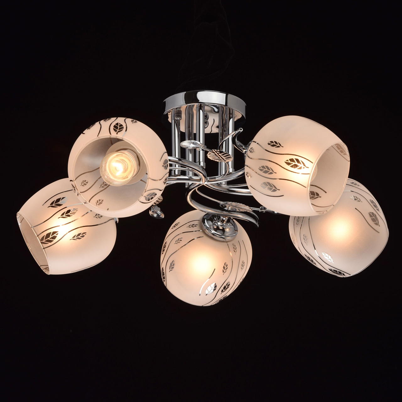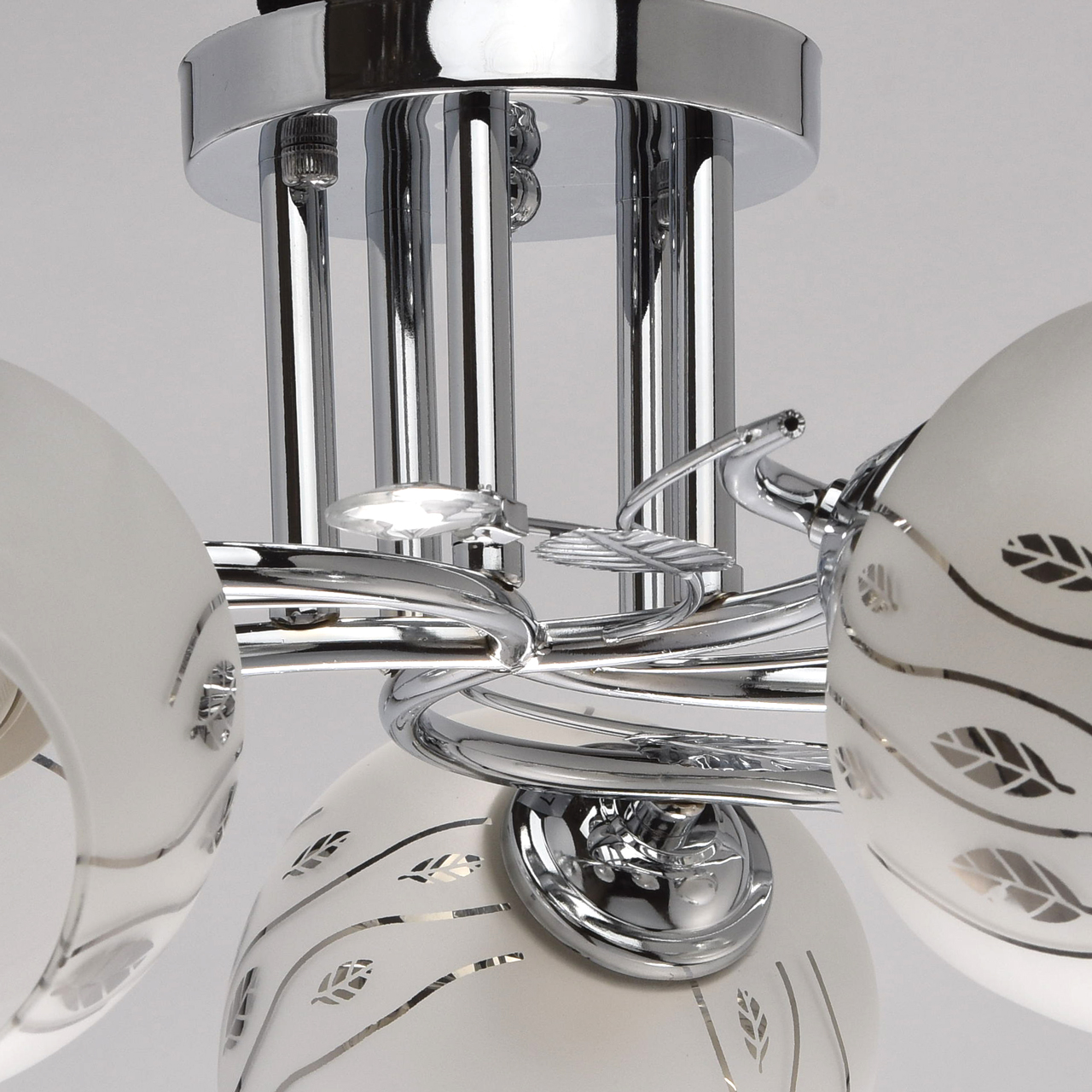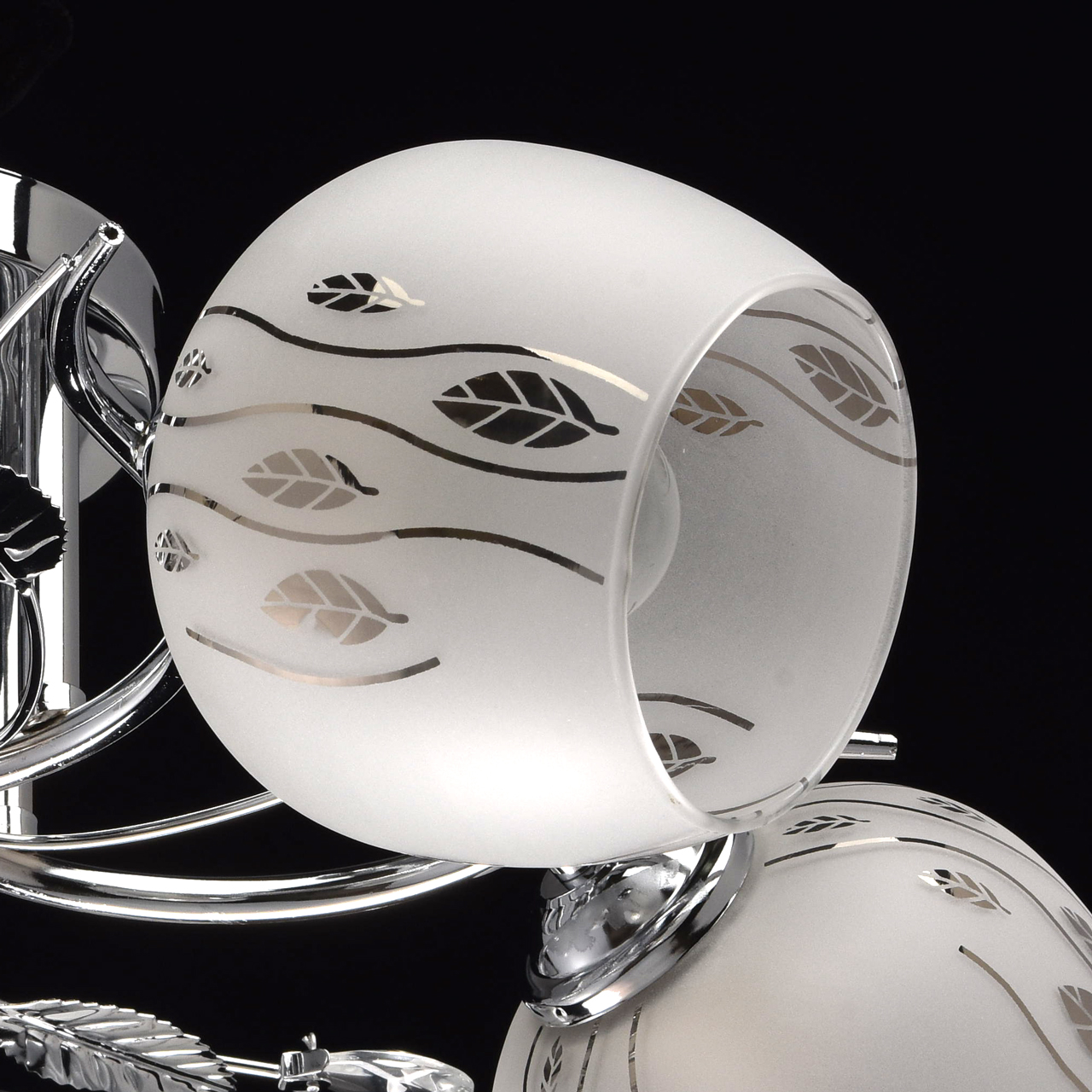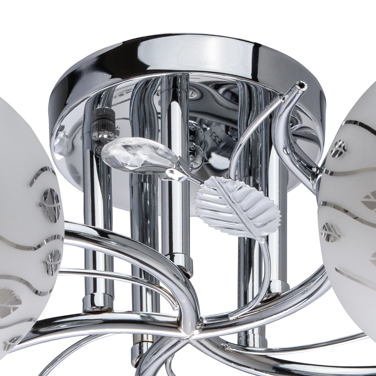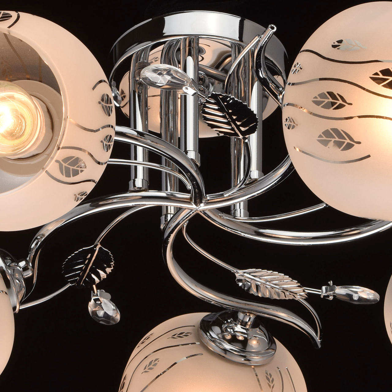 Основание светильника выполнено из металла, гальванизация в цвет хрома. Потолочная чаша, декоративные элементы в виде листьев изготовлены по технологии прессования, держатели плафонов изготовлены по технологии токарной обработки, рожки и завитки - прокат на роликовом станке. Плафоны из стекла, отлитого в форму. Плафоны матированы, на плафоны нанесен растительный рисунок путём гальванизации в цвет хрома по трафарету. Края плафонов оплавлены. Декоративные элементы на завитках из декоративного стекла в форме миндаля.Тип помещения