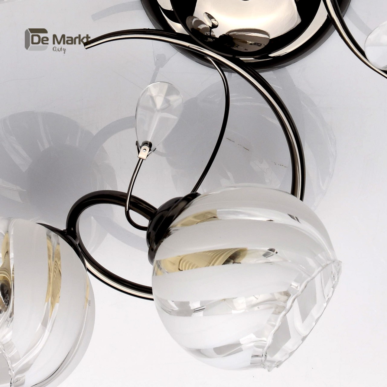 Основание светильника выполнено из металла, гальванизация в цвет никеля. Потолочная чаша, корпус, держатели плафонов изготовлены по технологии токарной обработки, рожки - прокат на роликовом станке с изменением диаметра рожка. Светильник декорирован стеклянными плафонами округлой формы, отлитыми в сложную форму, с последующим матированием внешней поверхности по трафарету. Края плафонов обработаны по технологии оплавления. Декоративные элементы на завитках из декоративного стекла в форме миндаля.Тип помещения