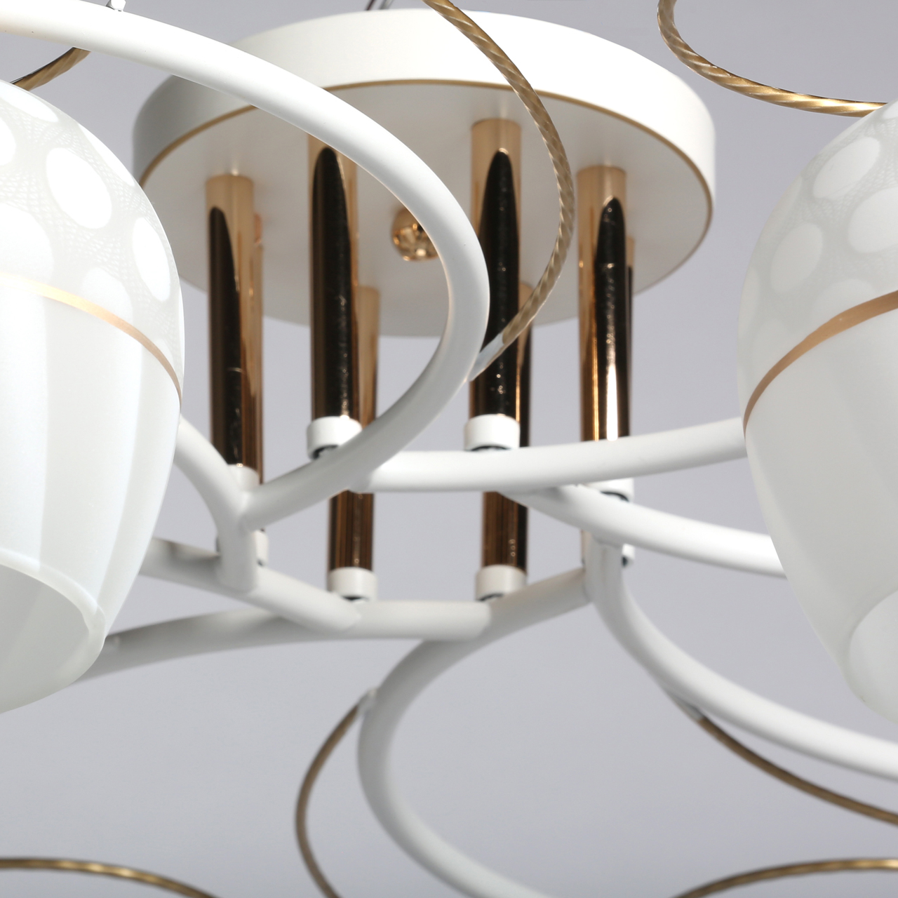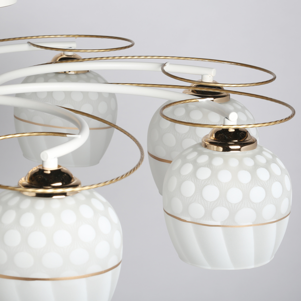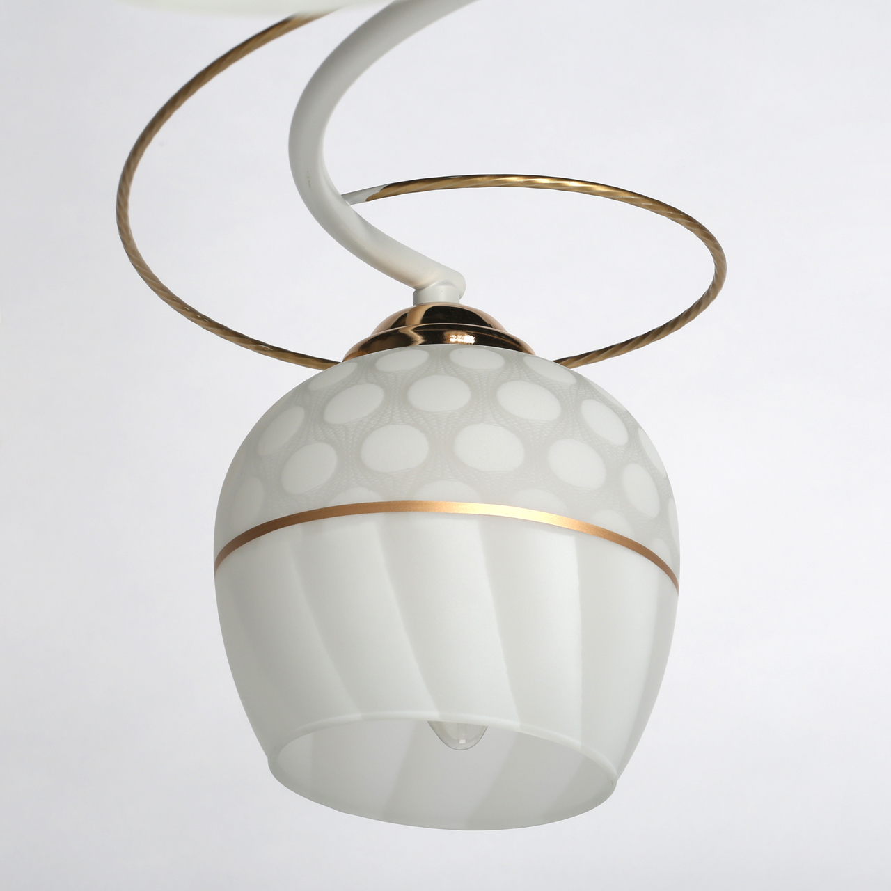 Основание светильника выполнено из металла и окрашено в белый цвет. Отдельные элементы гальванизированы в цвет золота. Декоративные элементы выполнены по технологии твист. Стеклянные плафоны матированы и декорированы золотой полоской.Тип помещения