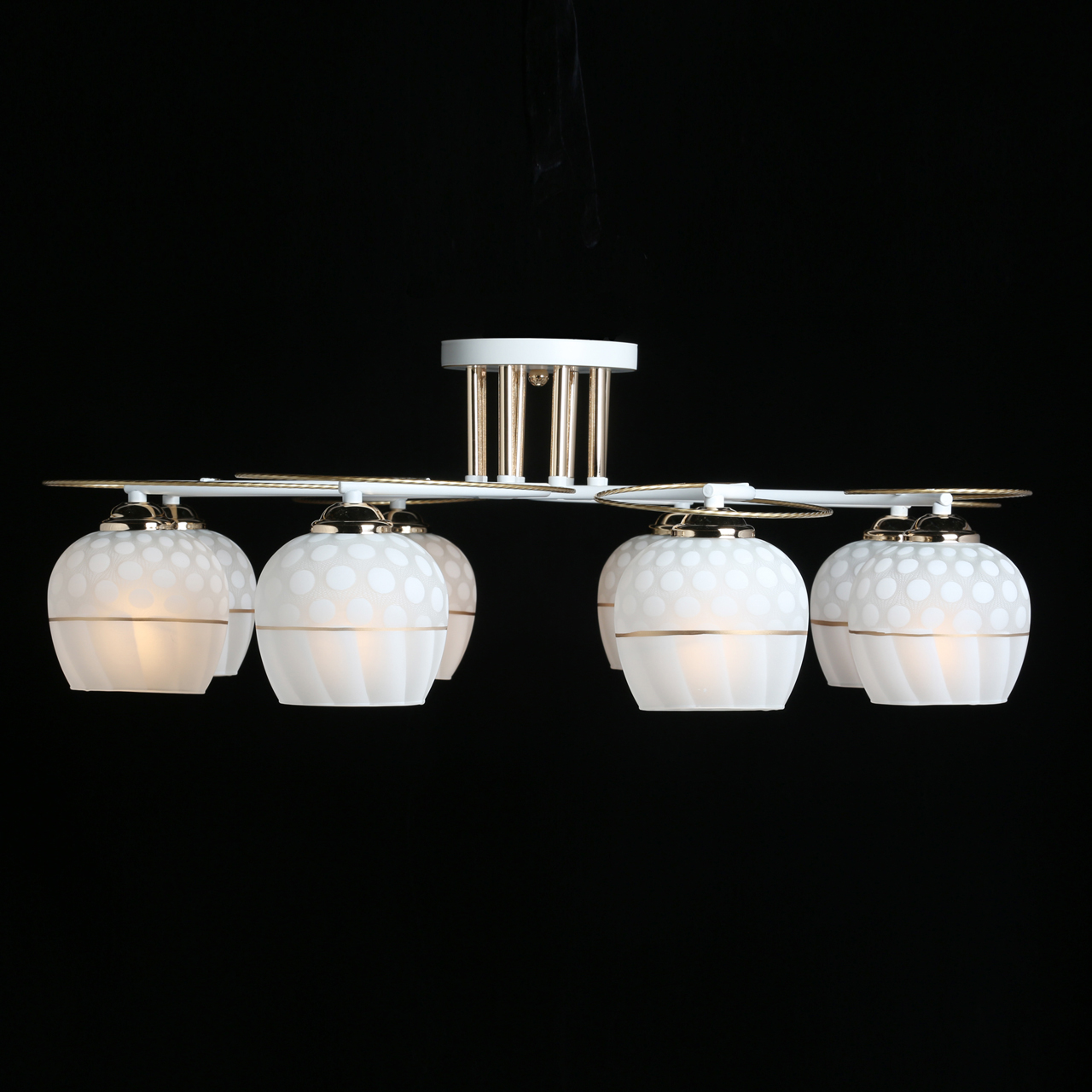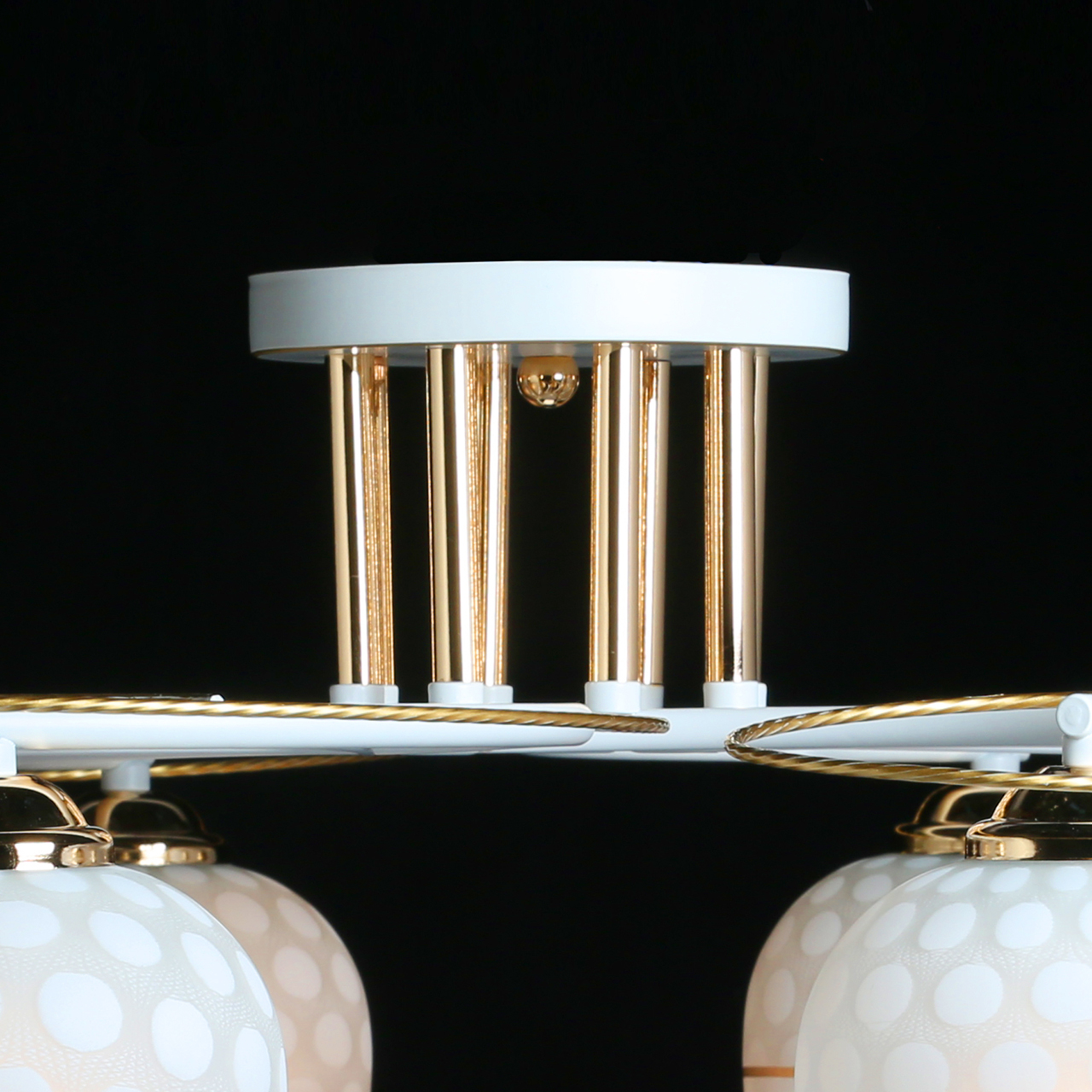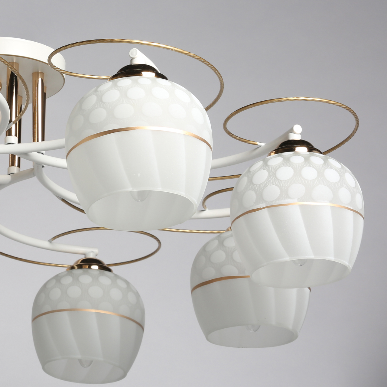 Основание светильника выполнено из металла и окрашено в белый цвет. Отдельные элементы гальванизированы в цвет золота. Декоративные элементы выполнены по технологии твист. Стеклянные плафоны матированы и декорированы золотой полоской.Тип помещения