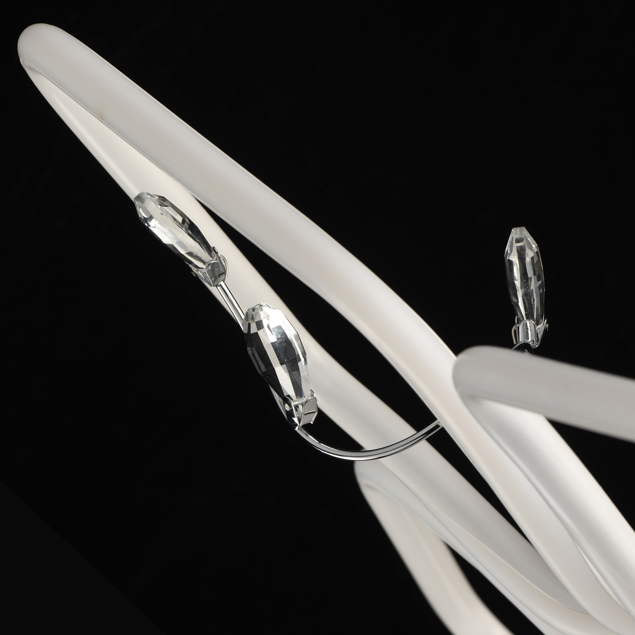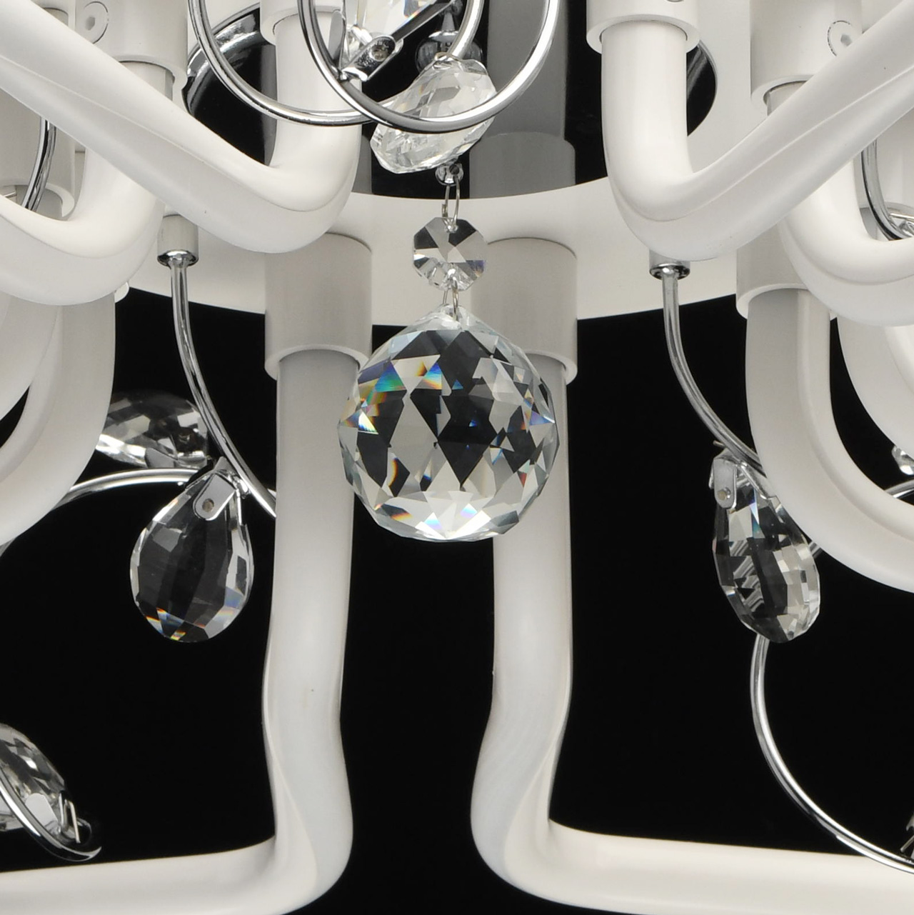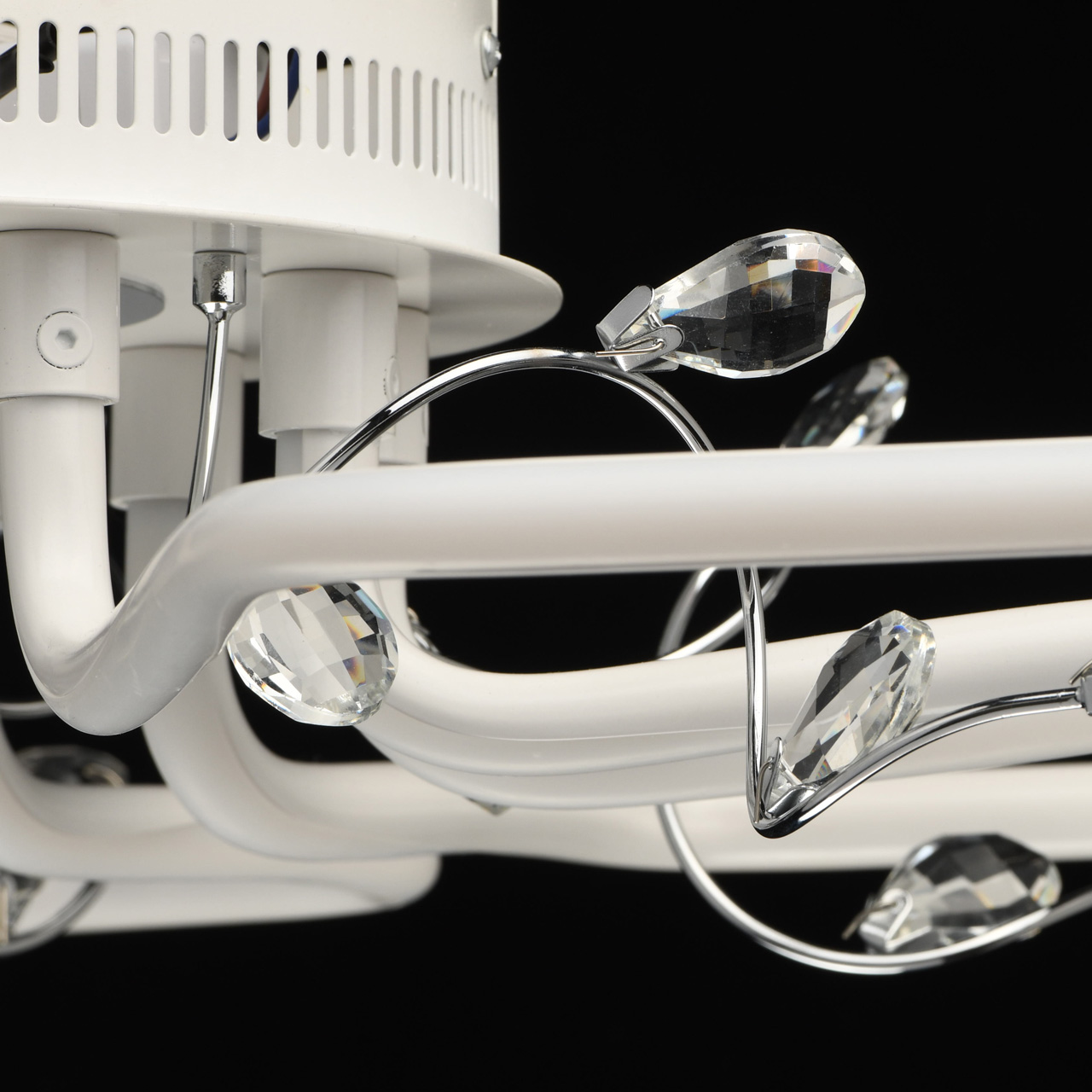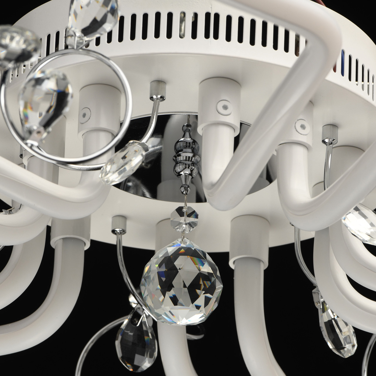 Основание светильника выполнено из комбинации сплавов металлов и окрашено в белый цвет. Потолочная чаша: металл, прессование. Рожки: сплав алюминия, окраска в белый цвет. Светодиодный источник света типа SMD Stripe закрыт белым матовым силиконом. Декор: декоративные элементы, прокат на роликовом станке, гальваника в цвет хром. Прозрачный хрусталь формы миндаль.Тип помещения