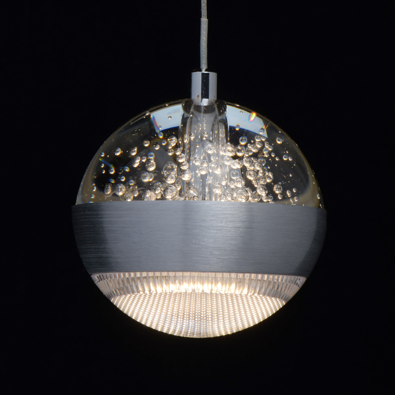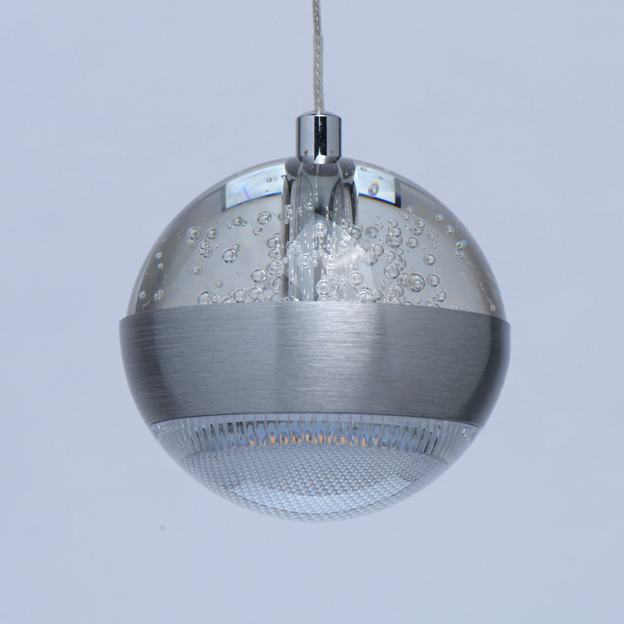 Основание светильника выполнено из комбинации сплавов металлов. Потолочная чаша выполнена из металла и окрашена в цвет серебра. Потолочная чаша закрыта пластиной из сплава алюминия цвета античного серебра, обработанного по технологии браширования с последующим патинированием. Плафон на подвесе в виде троса: каркас плафона выполнен из сплава алюминия цвета античного серебра и обработан по технологии браширования с последующим патинированием. В верхней части плафона светодиодный источник света типа SMD chip закрыт стеклом, отлитым в форму и обработанным по технологии пулегозо, при которой в плафоне образуются пузырьки. В нижней части плафона второй светодиодный источник света типа SMD chip закрыт прозрачным акрилом с фактурой сот.Тип помещения