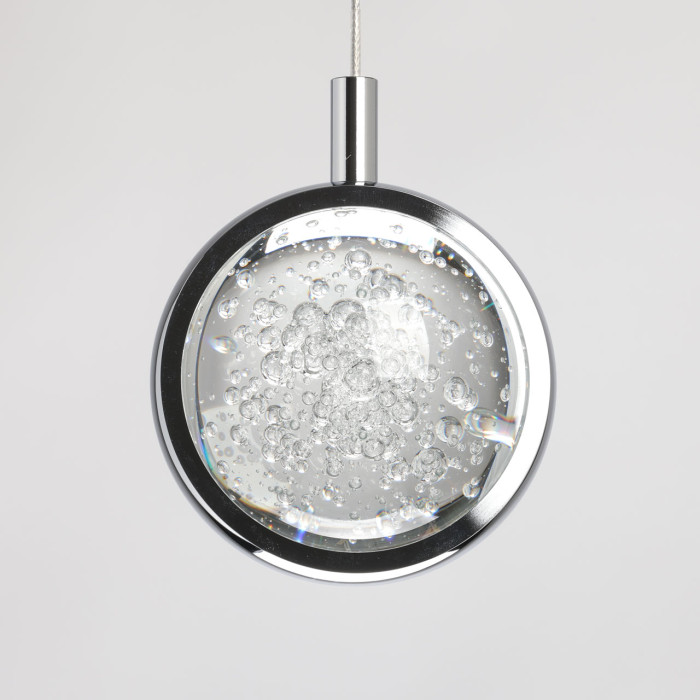 Трендовый цвет хрома. Сфера из прозрачного стекла с пузырьками красиво преломляет свет. Инновационный источник света актуален. Возможность регулировать комфортную высоту. Полная семья решает задачи общего и зонального освещения.Основание светильника выполнено из сплава алюминия с цинком, обработано по технологии брашинга и гальванизировано в цвет хрома. Светодиодный источник света закрыт сферой из стекла с включениями пузырьков.