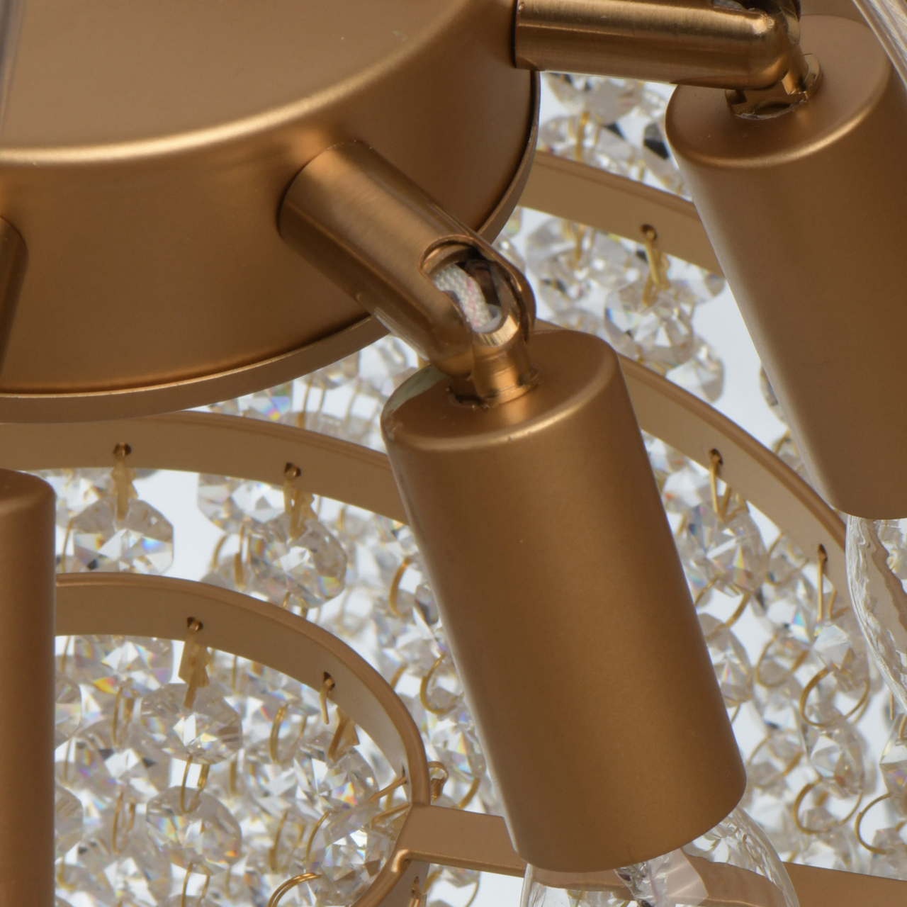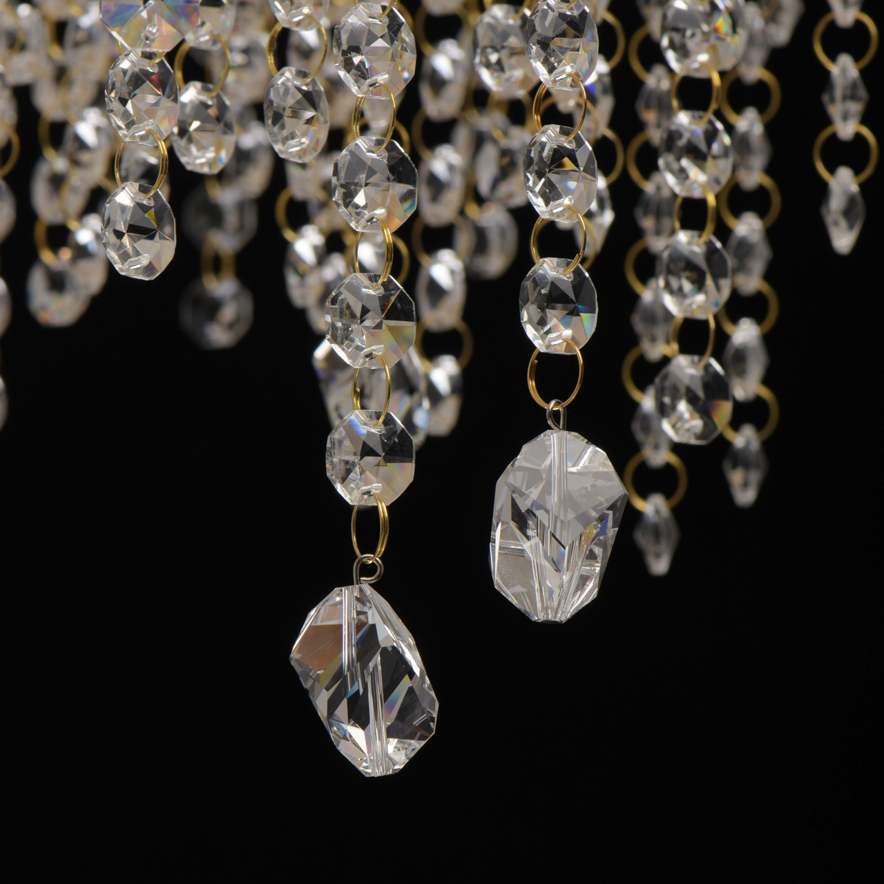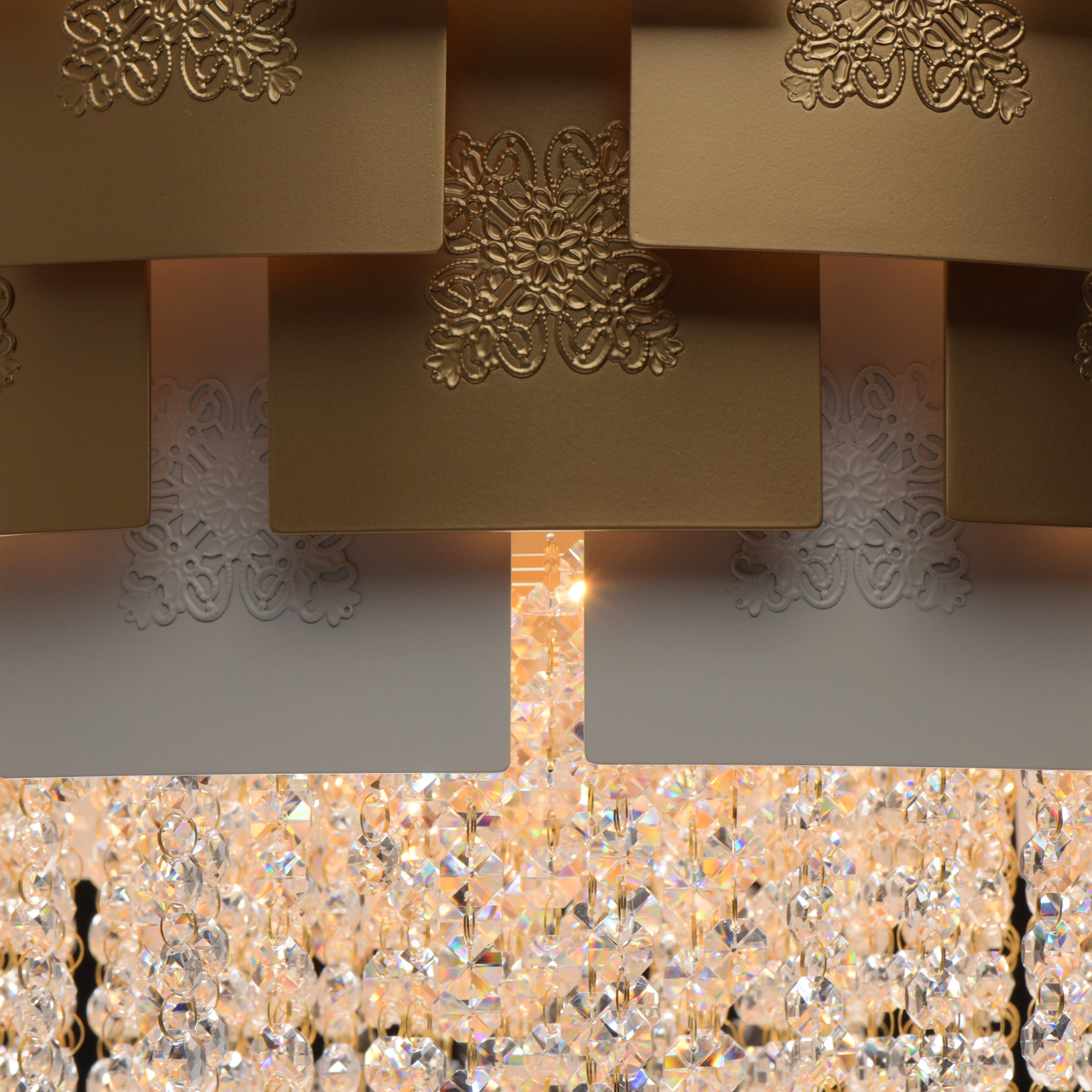 Основание светильника выполнено из металла и окрашено в золотой и белый цвет. Металлические пластины декорированы цветочным орнаментом, выполненным по технологии прессования. Светильник декорирован прозрачным хрусталем формы октагон.Тип помещения