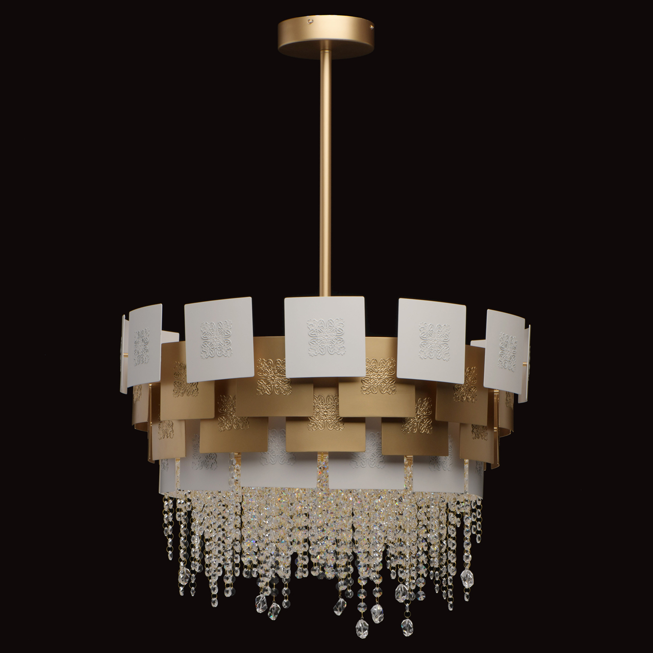 Дизайнерский светильник - безусловное преимущество для ценителей арт-объектов в интерьере. Фирменный хрусталь Swarovski с уникальными параметрами чистоты и прозрачности создает мягкий, искрящийся свет. Пластины матового золотого и белого - модный тренд сезона дополняют гламурный образ модели в стиле арт-деко.Стилевые решения интерьера