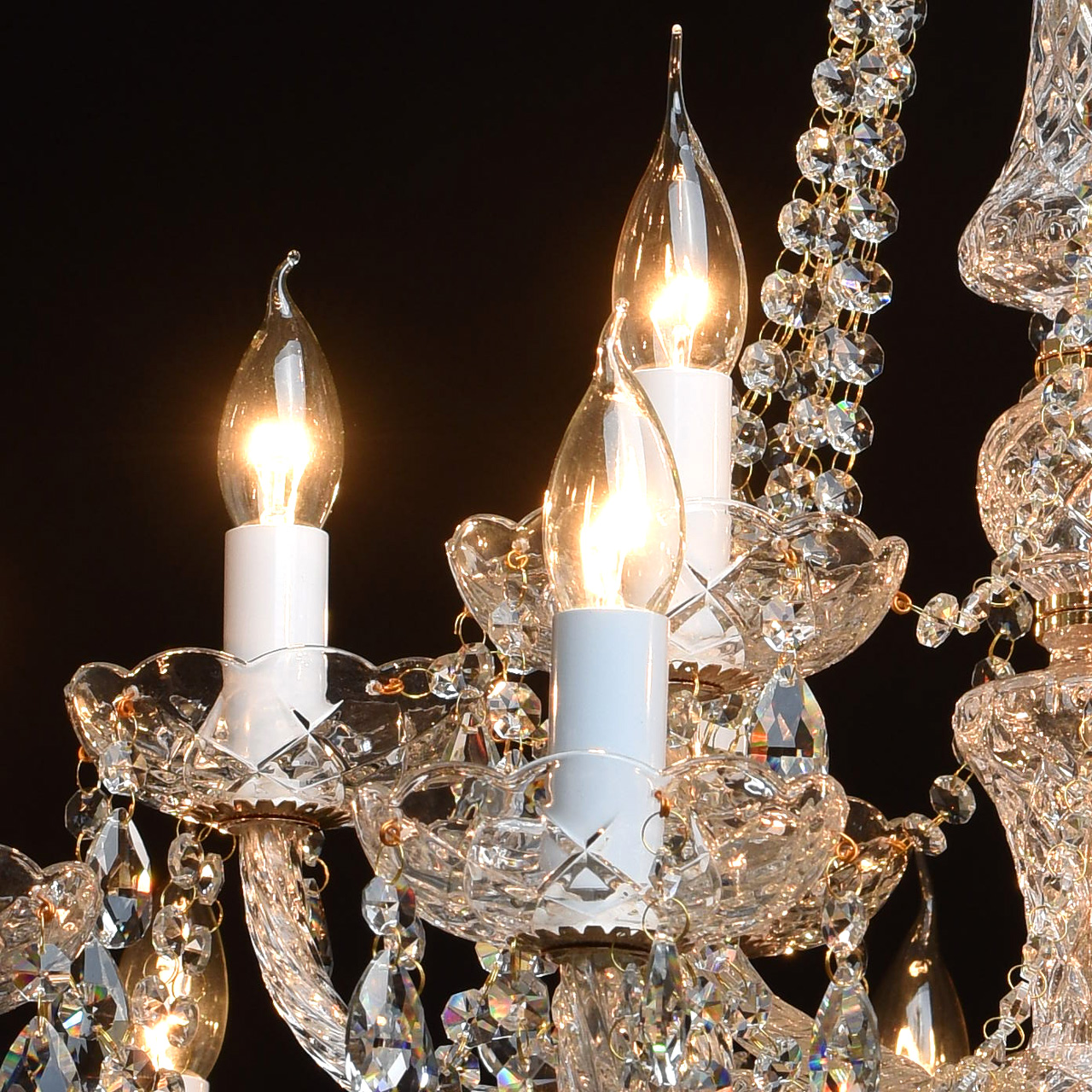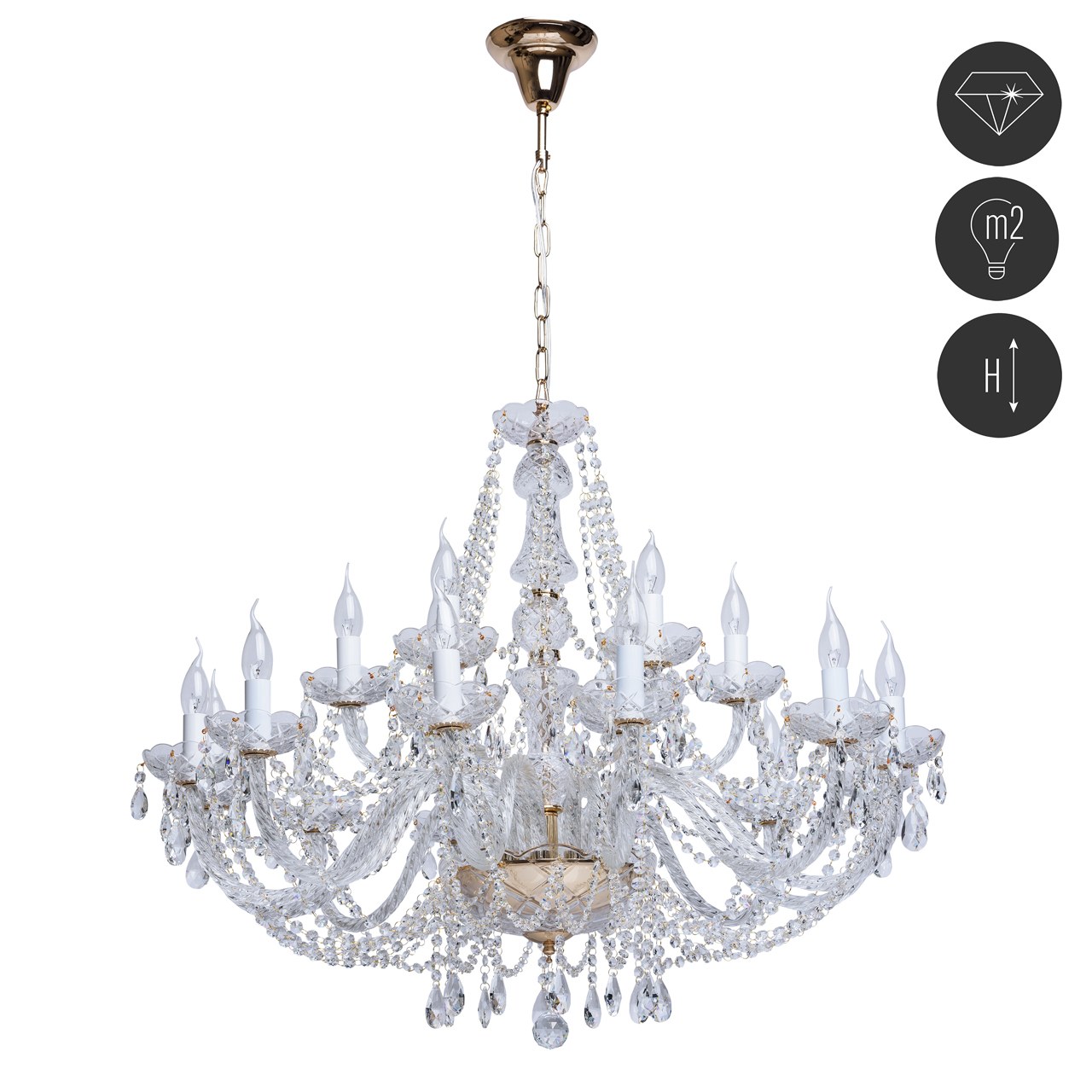 Люстра из коллекции «Каролина» восхищает своим блеском и великолепием. Основание выполнено из металла цвета французского золота. Изящно изогнутые рожки светильника декорированы витым стеклом, а чаши и декоративные элементы также выполнены из прозрачного рельефного стекла. Финальный штрих композиции – россыпь хрустальных подвесок. Это по-настоящему праздничная люстра, её сияние создает необыкновенную, живую игру света, который преломляется в гранях стекла и хрусталя. Рекомендуемая площадь освещения порядка 54 кв.м.Преимущества модели