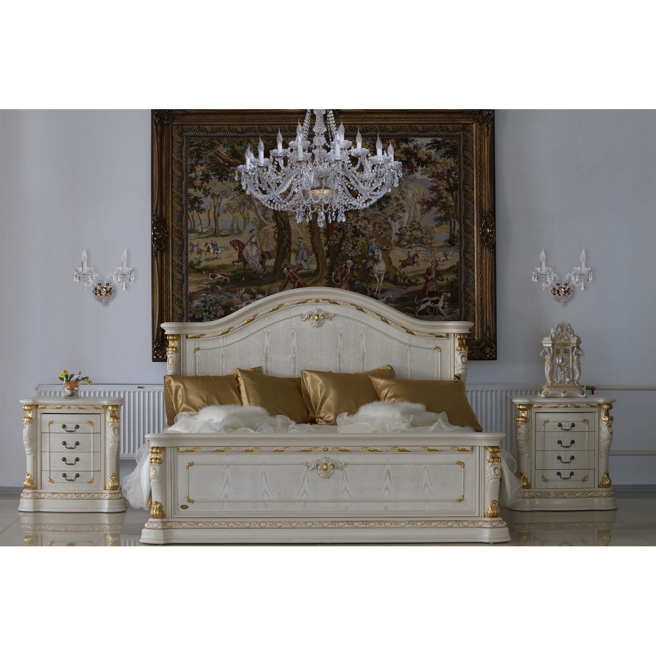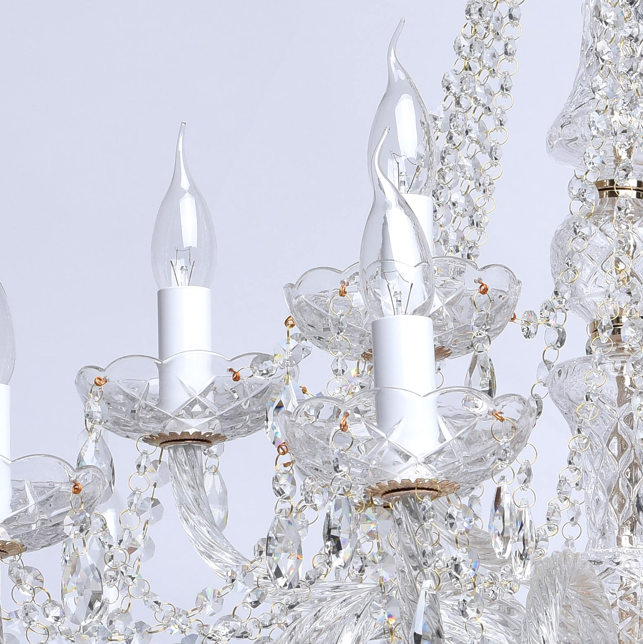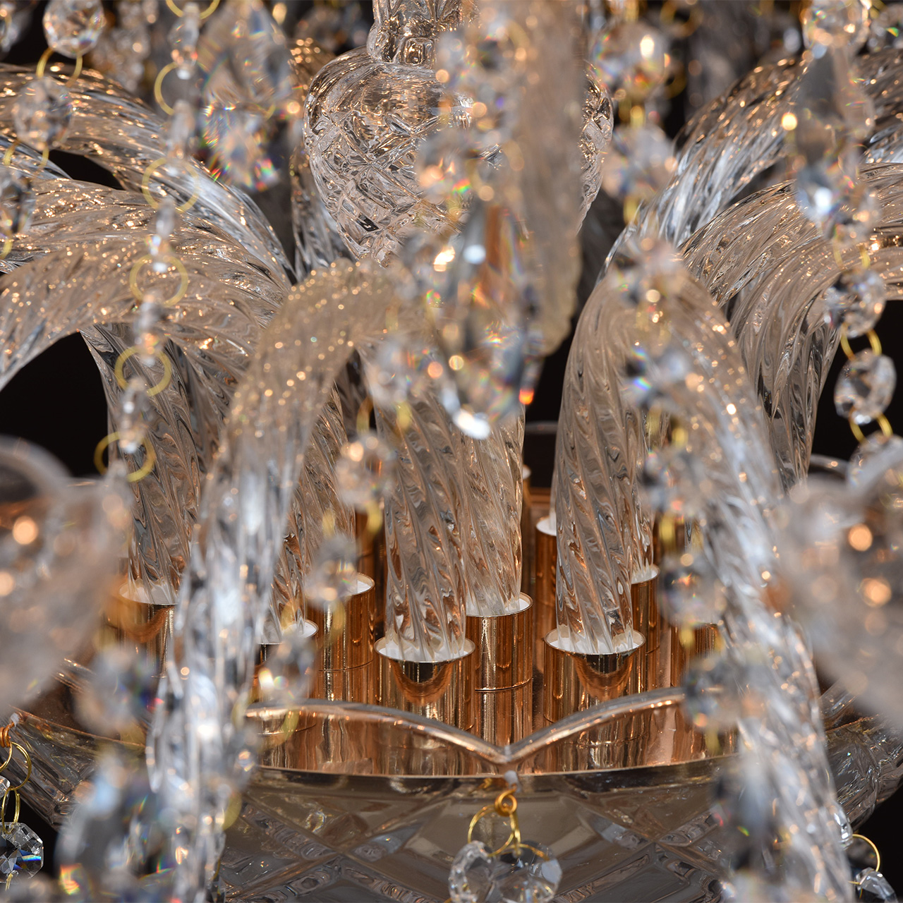 Металлическое основание цвета золота, декоративные элементы из прозрачного хрусталя и стекла с резным рисунком.Технология производства