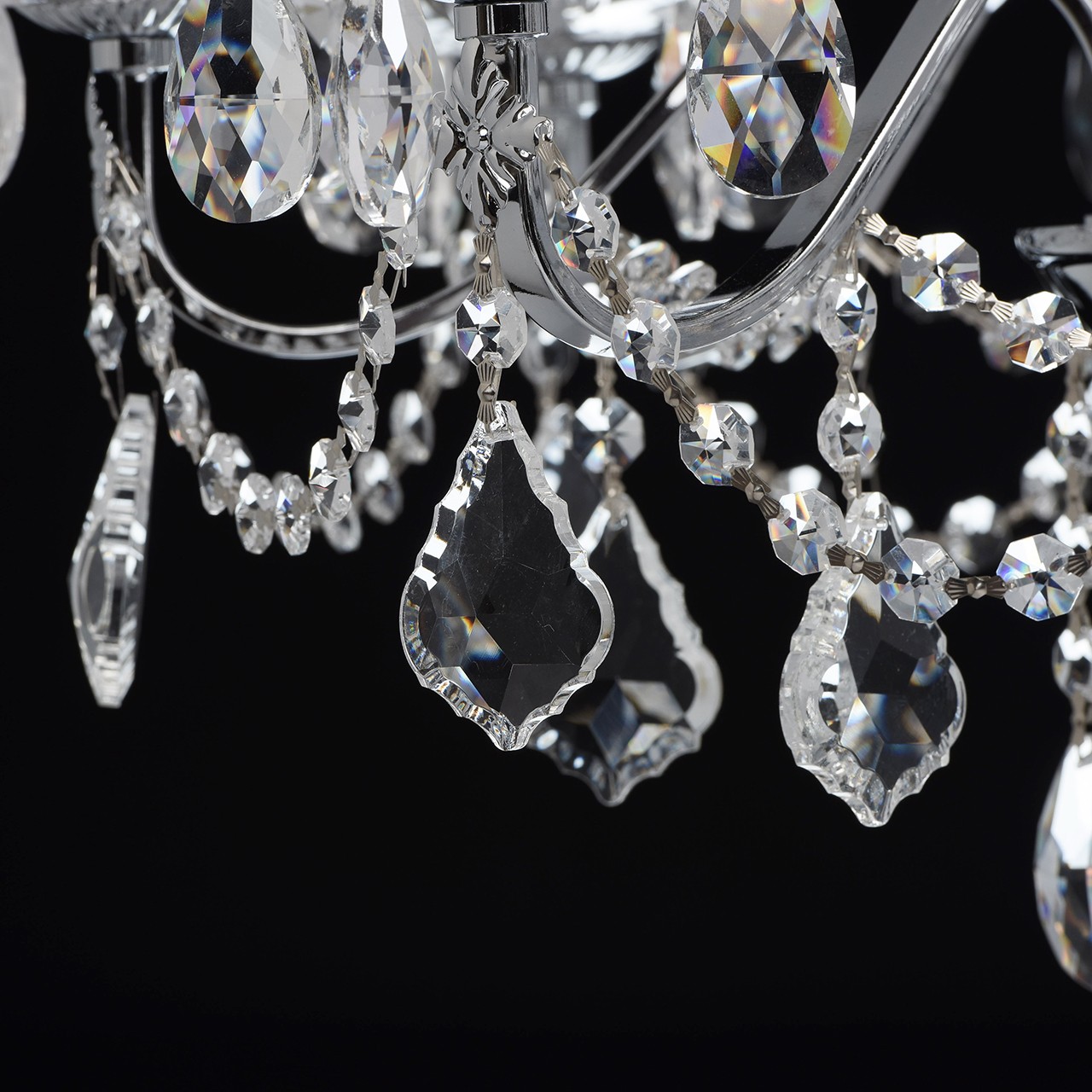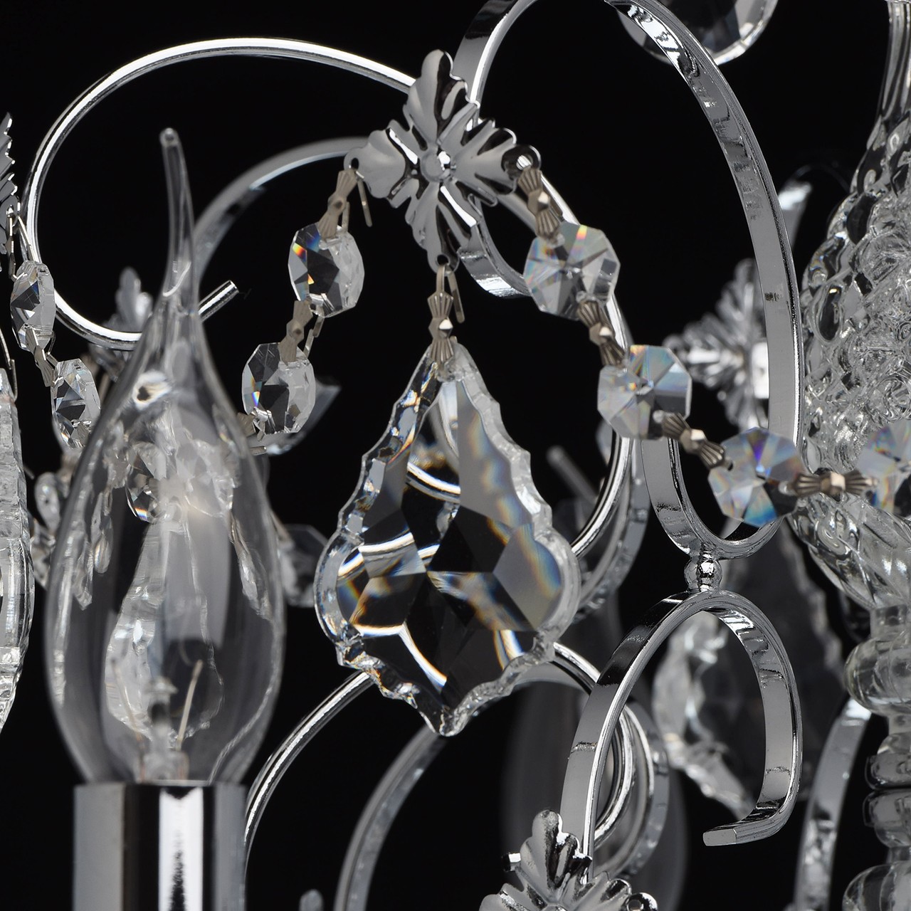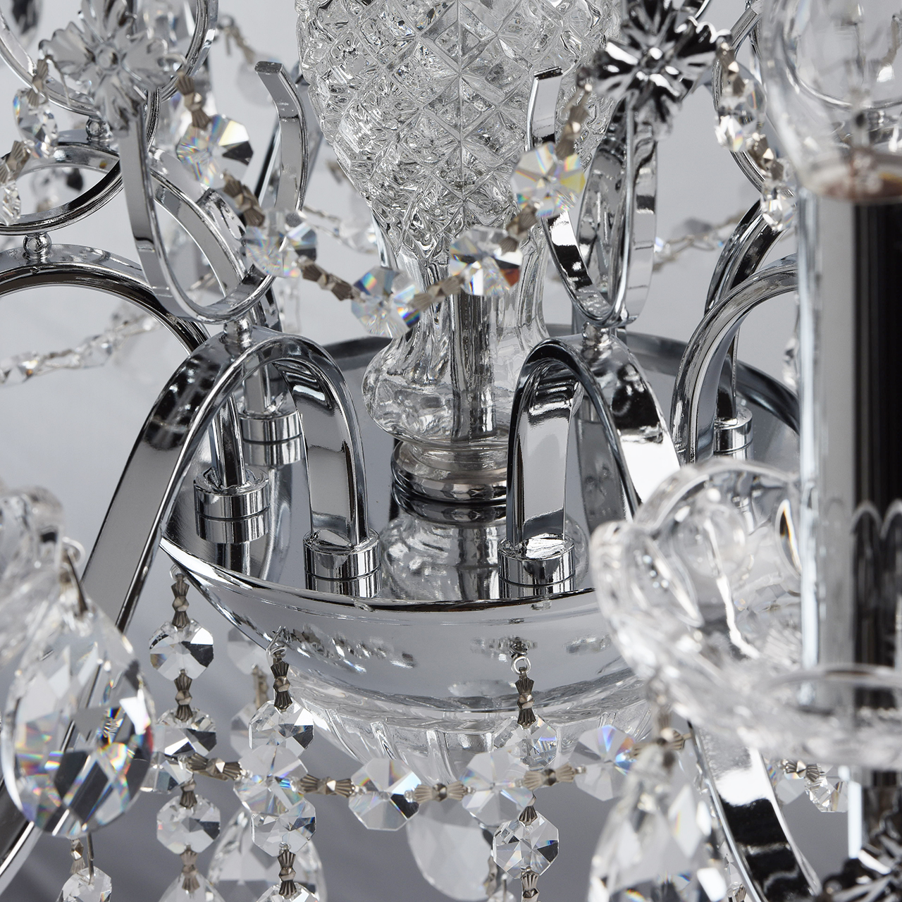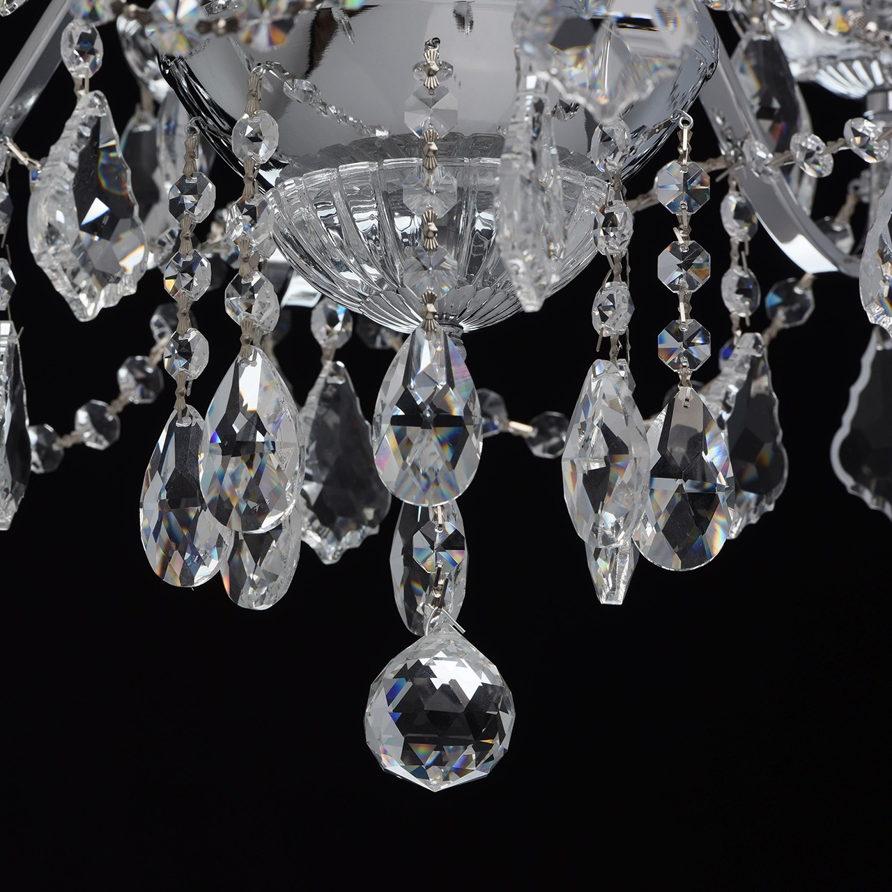 Арматура светильника выполнена из сплава железа и гальванизирована в цвет хрома. Центральная ось декорирована прозрачным стеклом со сложным орнаментом. Розетки выполнены из прозрачного стекла, отлитого по форме. Светильник декорирован хрустальными подвесками 4-х видов: октагон, миндаль, дубовый лист, шар.Тип помещения
