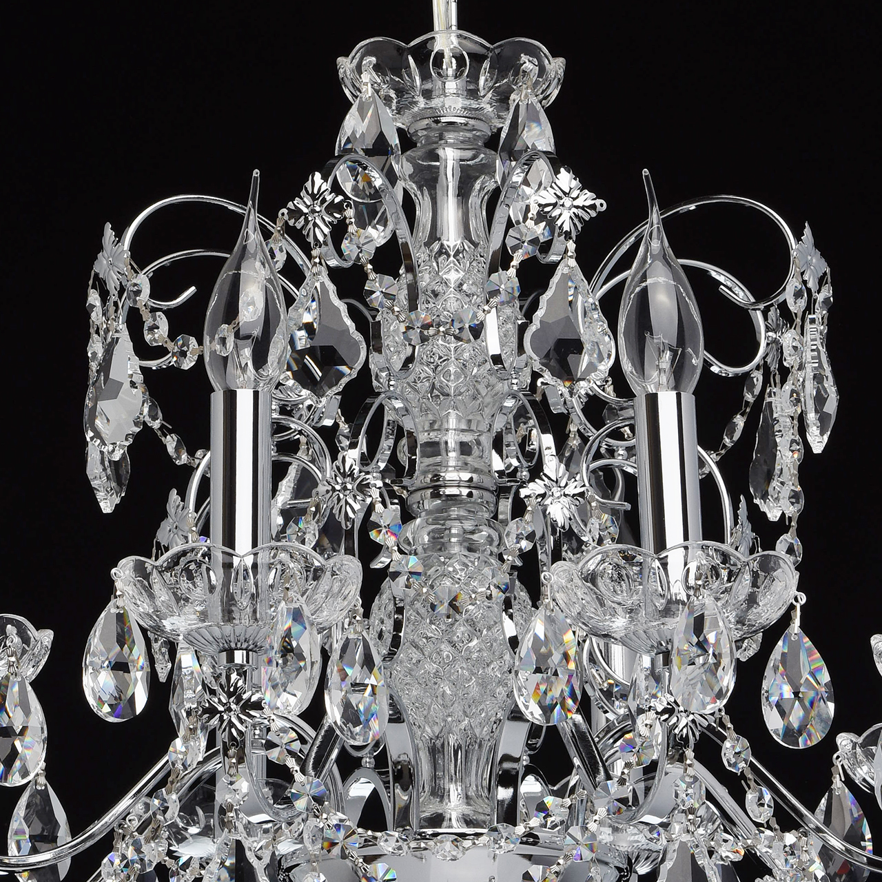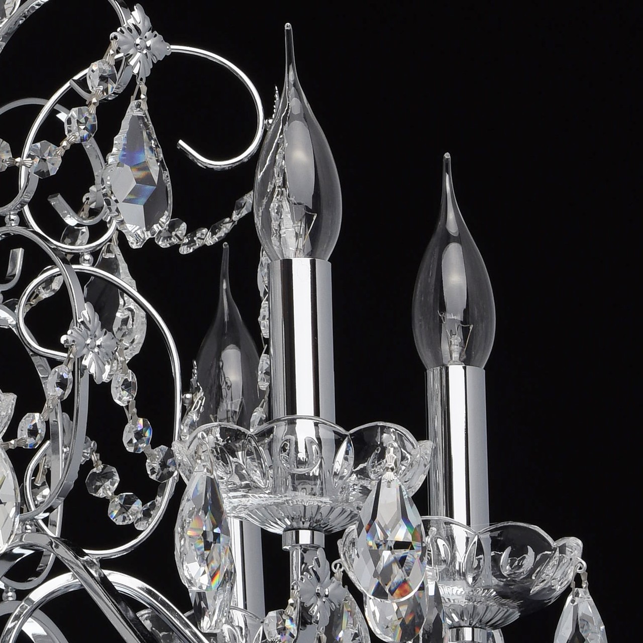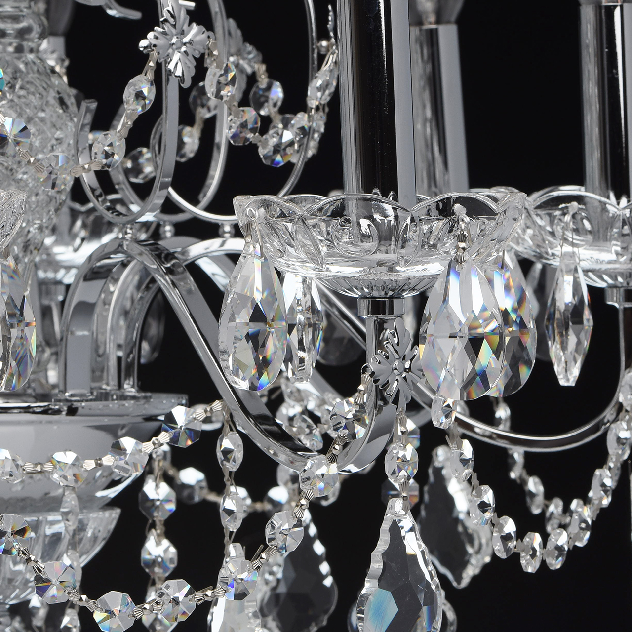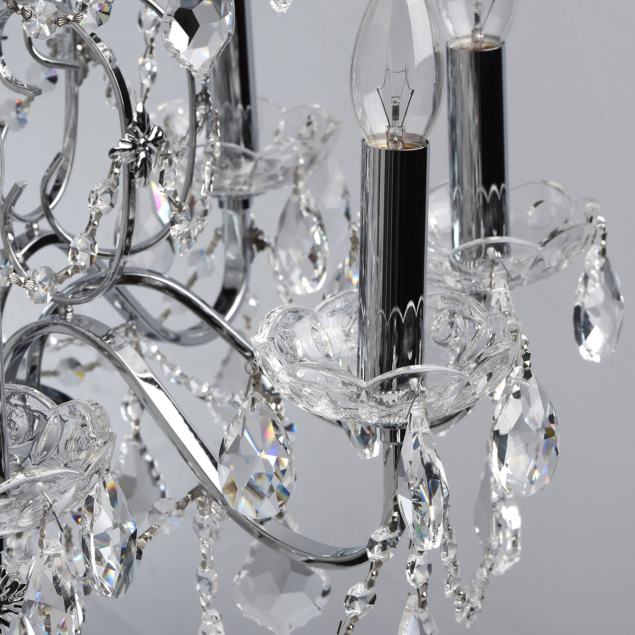 Арматура светильника выполнена из сплава железа и гальванизирована в цвет хрома. Центральная ось декорирована прозрачным стеклом со сложным орнаментом. Розетки выполнены из прозрачного стекла, отлитого по форме. Светильник декорирован хрустальными подвесками 4-х видов: октагон, миндаль, дубовый лист, шар.Тип помещения