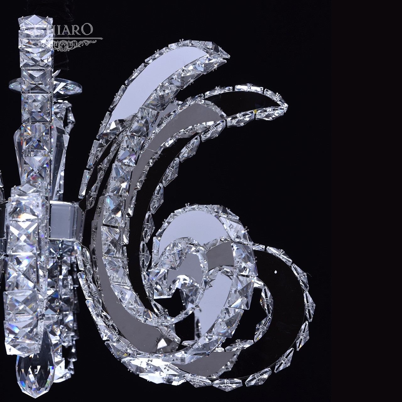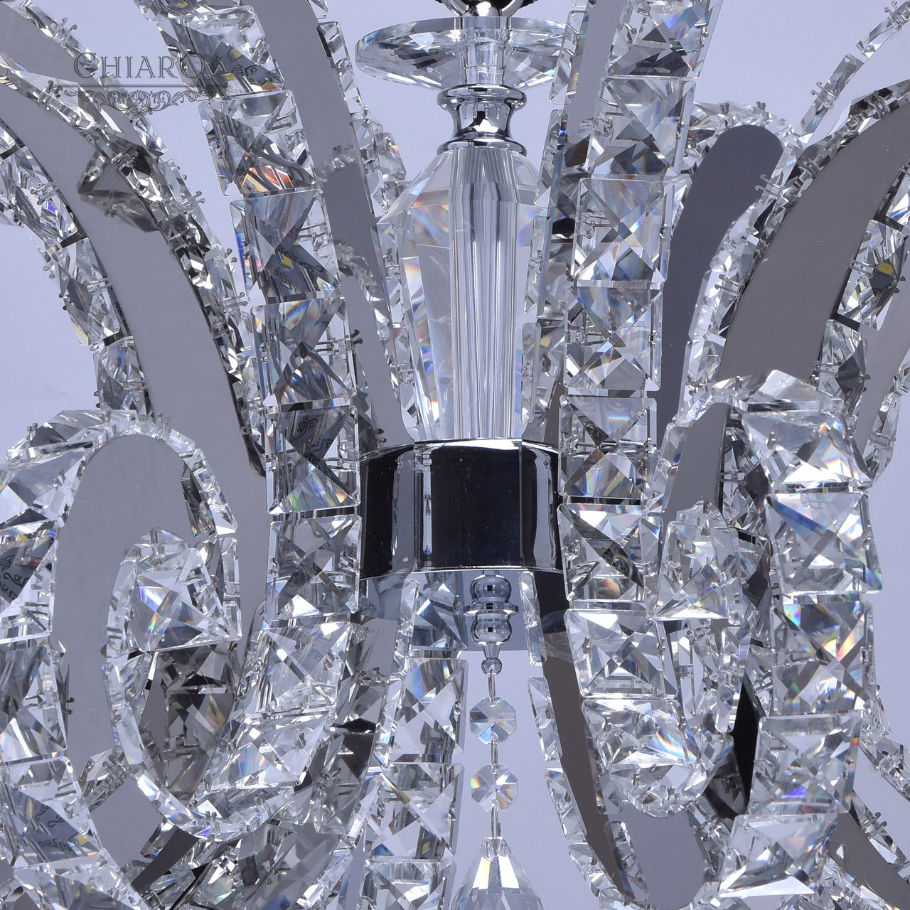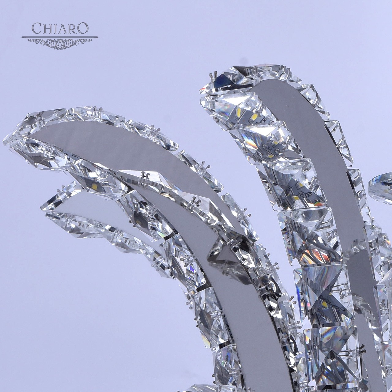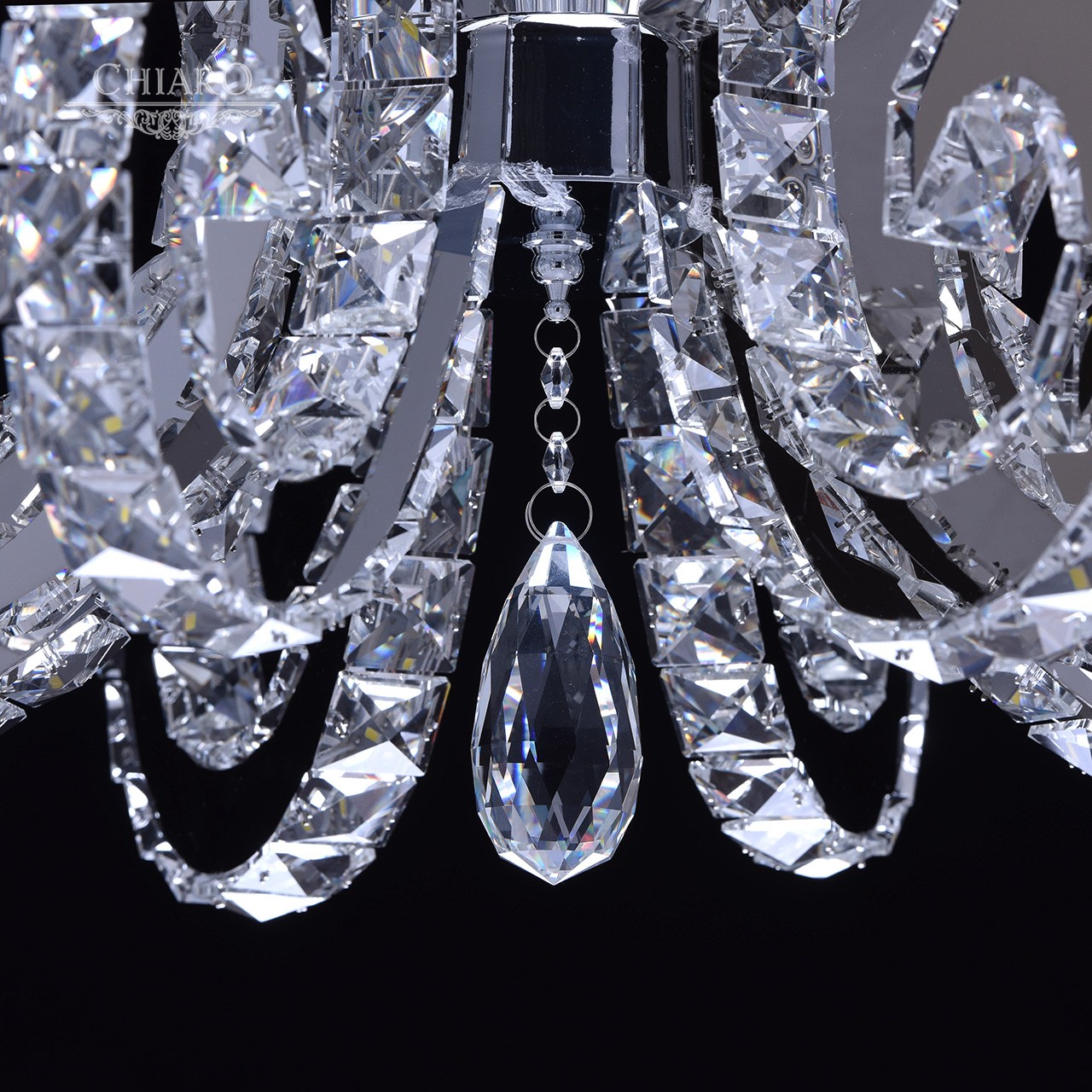 Корпус светильника выполнен из сплава металла и гальванизирован в цвет хрома. Дуги, имитирующие плафоны, выполнены из нержавеющей стали. Светильник декорирован хрусталем с множественными центрами схождения граней.Тип помещения