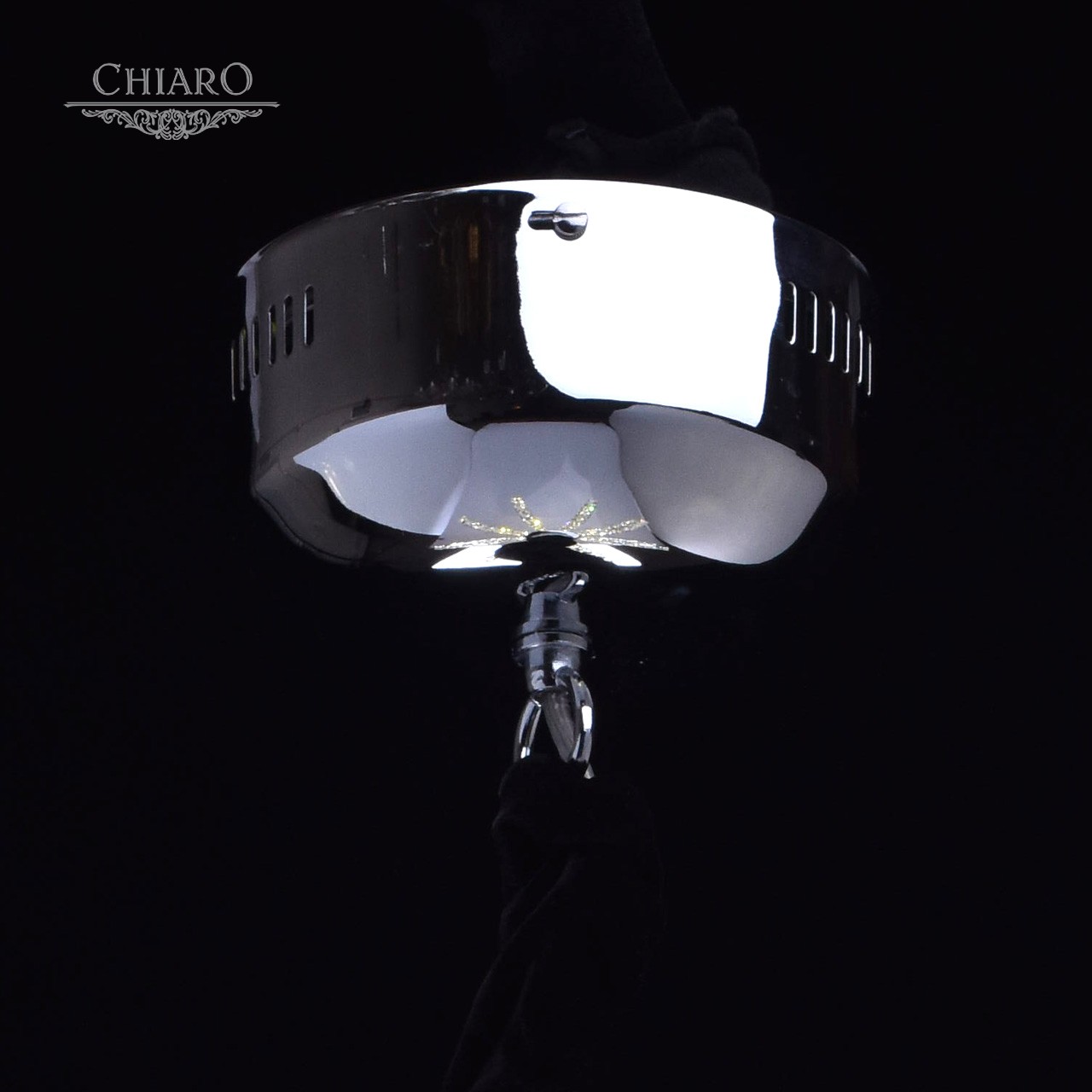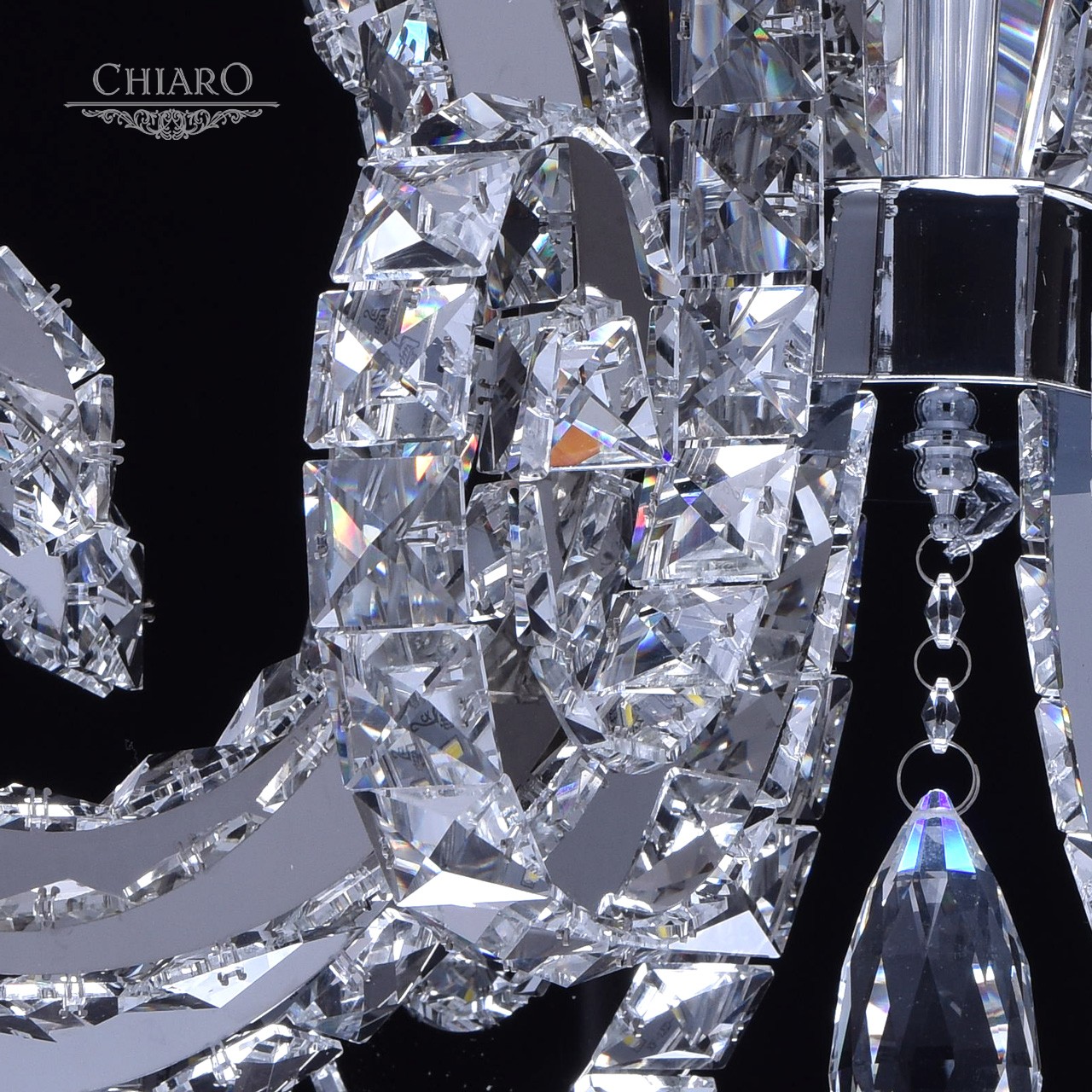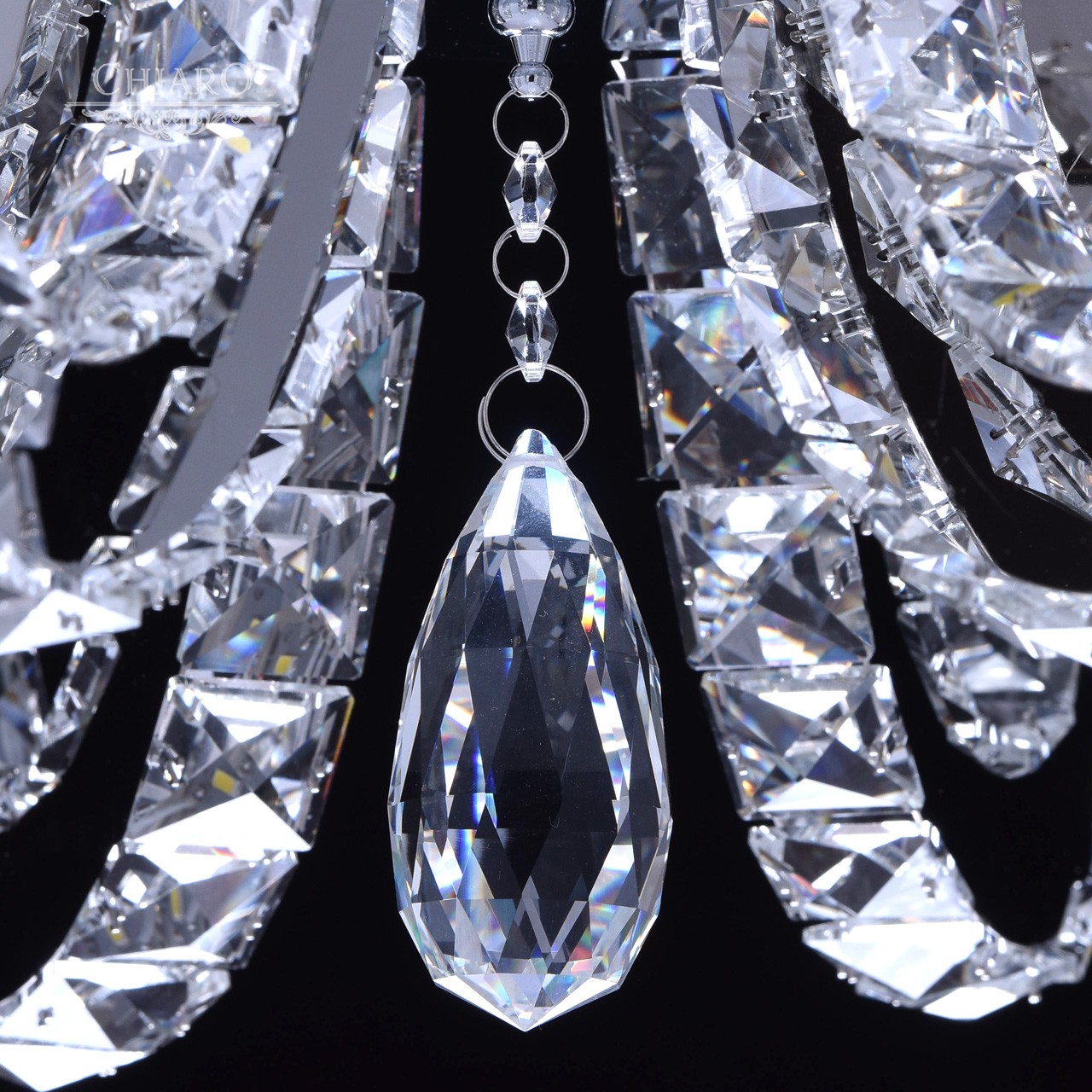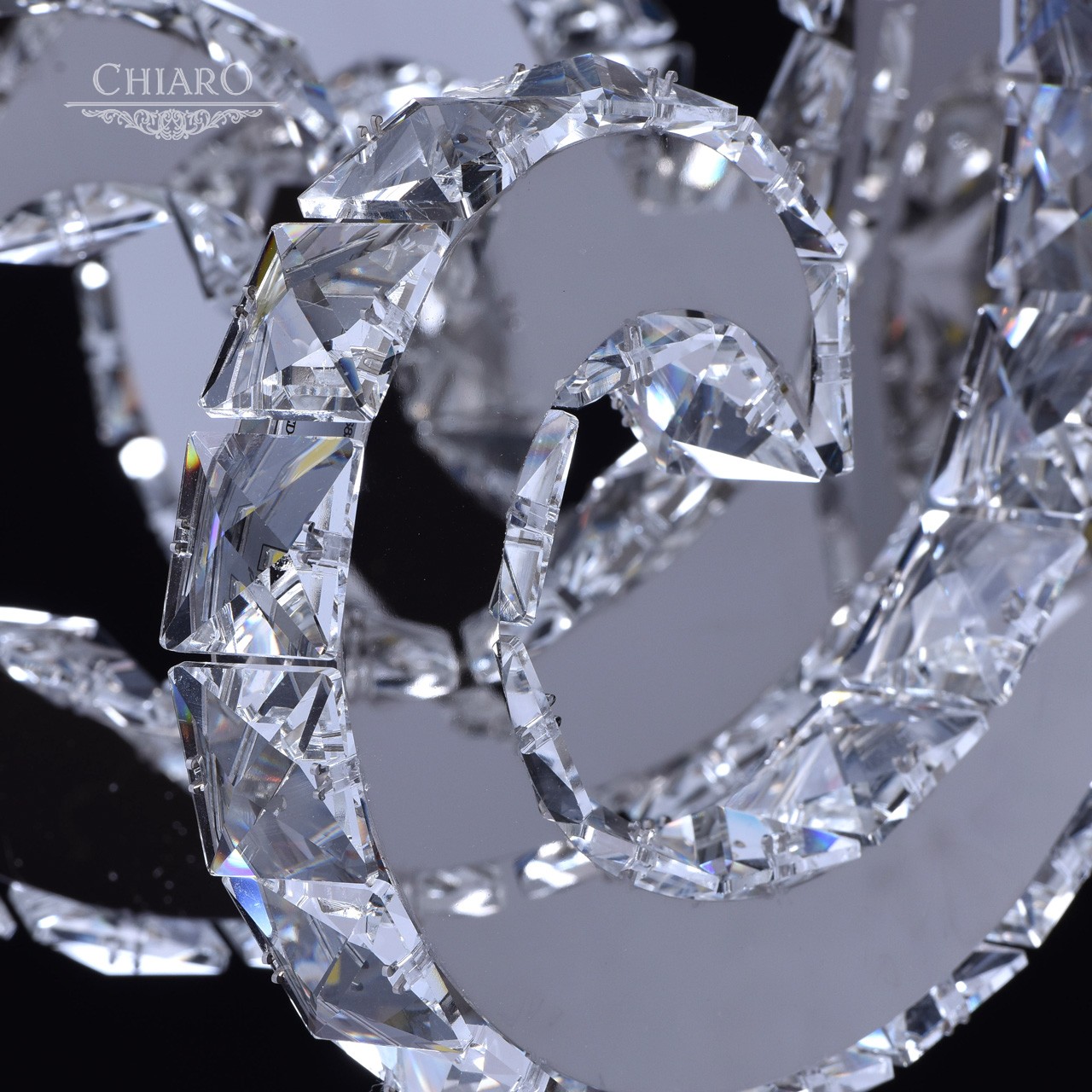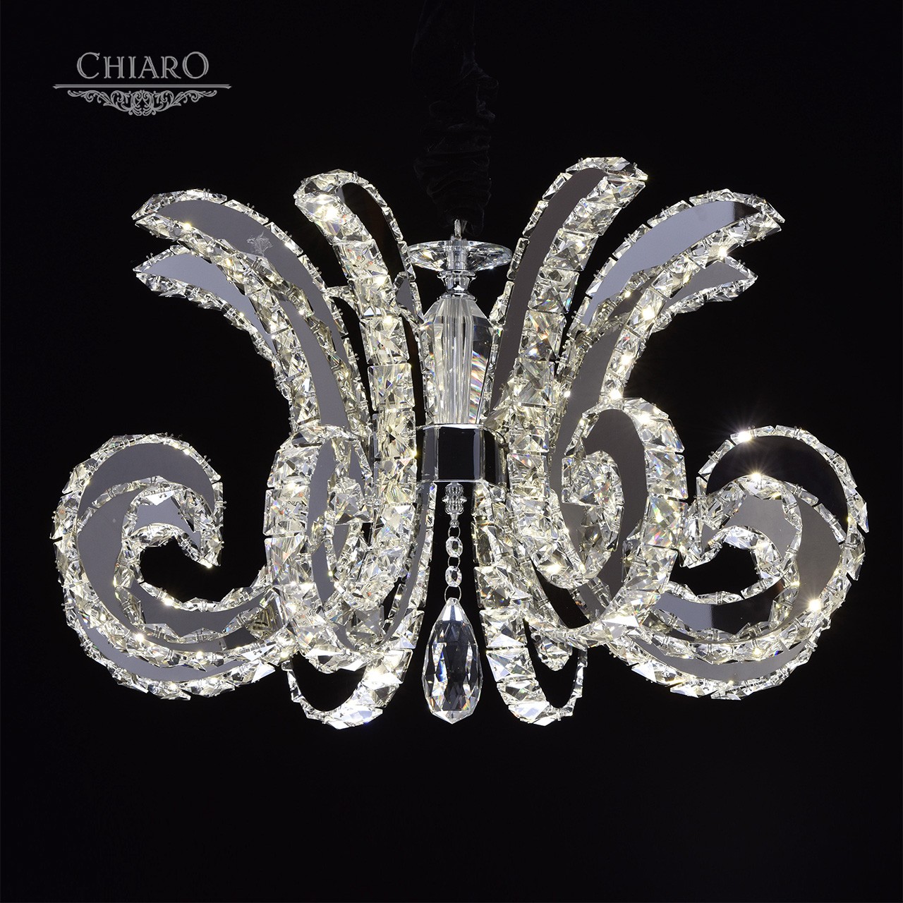 Корпус светильника выполнен из сплава металла и гальванизирован в цвет хрома. Дуги, имитирующие плафоны, выполнены из нержавеющей стали. Светильник декорирован хрусталем с множественными центрами схождения граней.Тип помещения