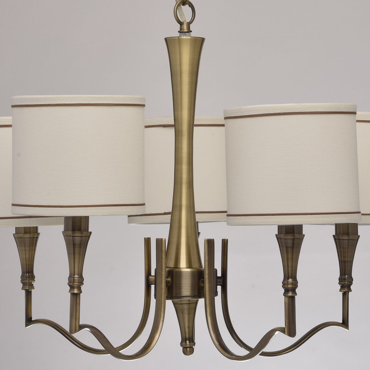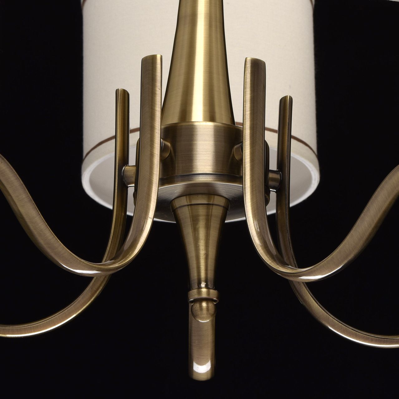 Сложно найти более элегантное решение для интерьера, чем люстра из коллекции «Конрад». Основание из металла благородного цвета античной бронзы плавно переходит в изящно изогнутые рожки. Фактурные тканевые абажуры натурального бежевого оттенка удачно дополняют тон основания, а коричневый кант эффектно завершает композицию. Интересно, что светильник можно использовать и без абажуров: тогда будут видны источники света в виде свечей. Стильная люстра в духе нео-классики будет гармонично смотреться в современном интерьере.Преимущества модели
