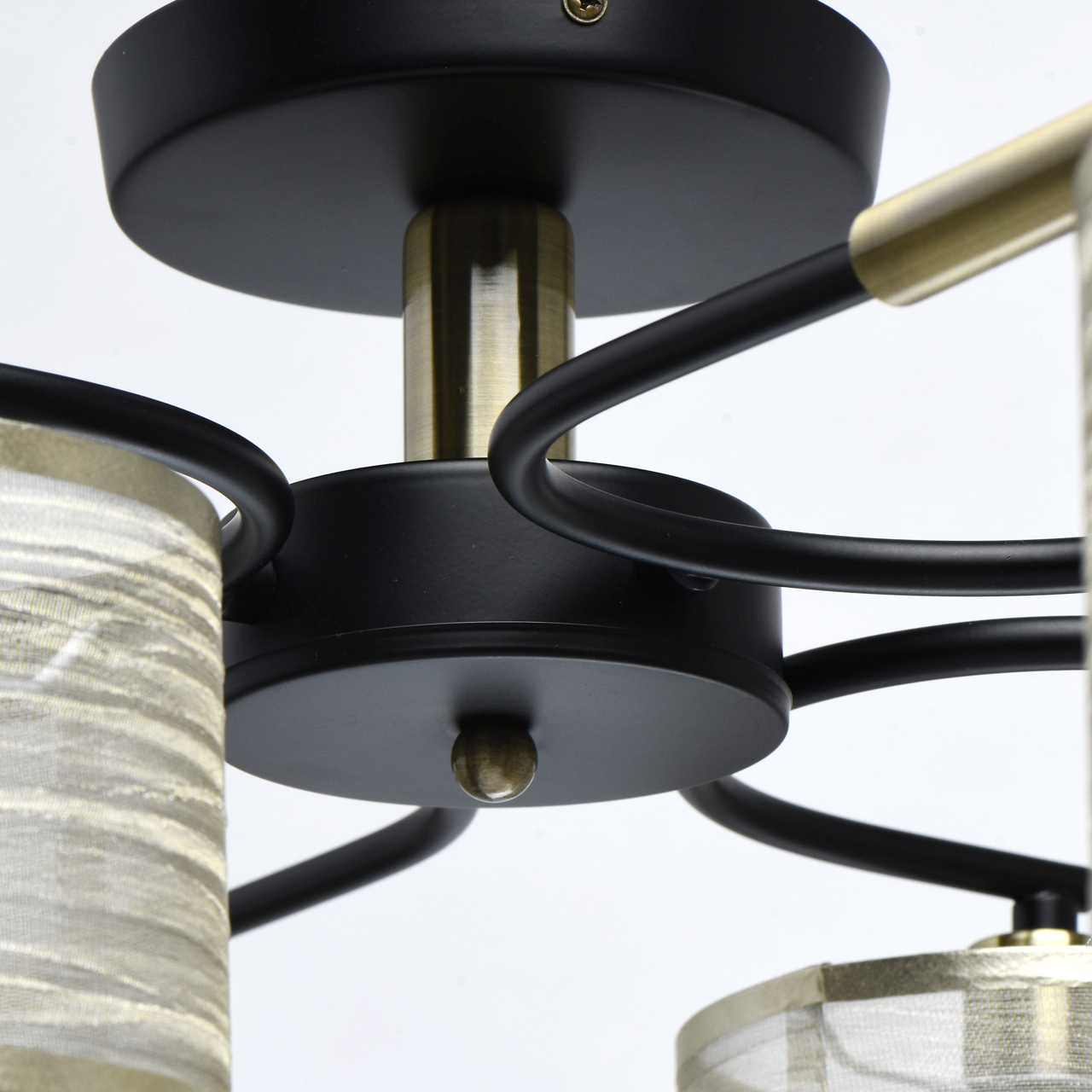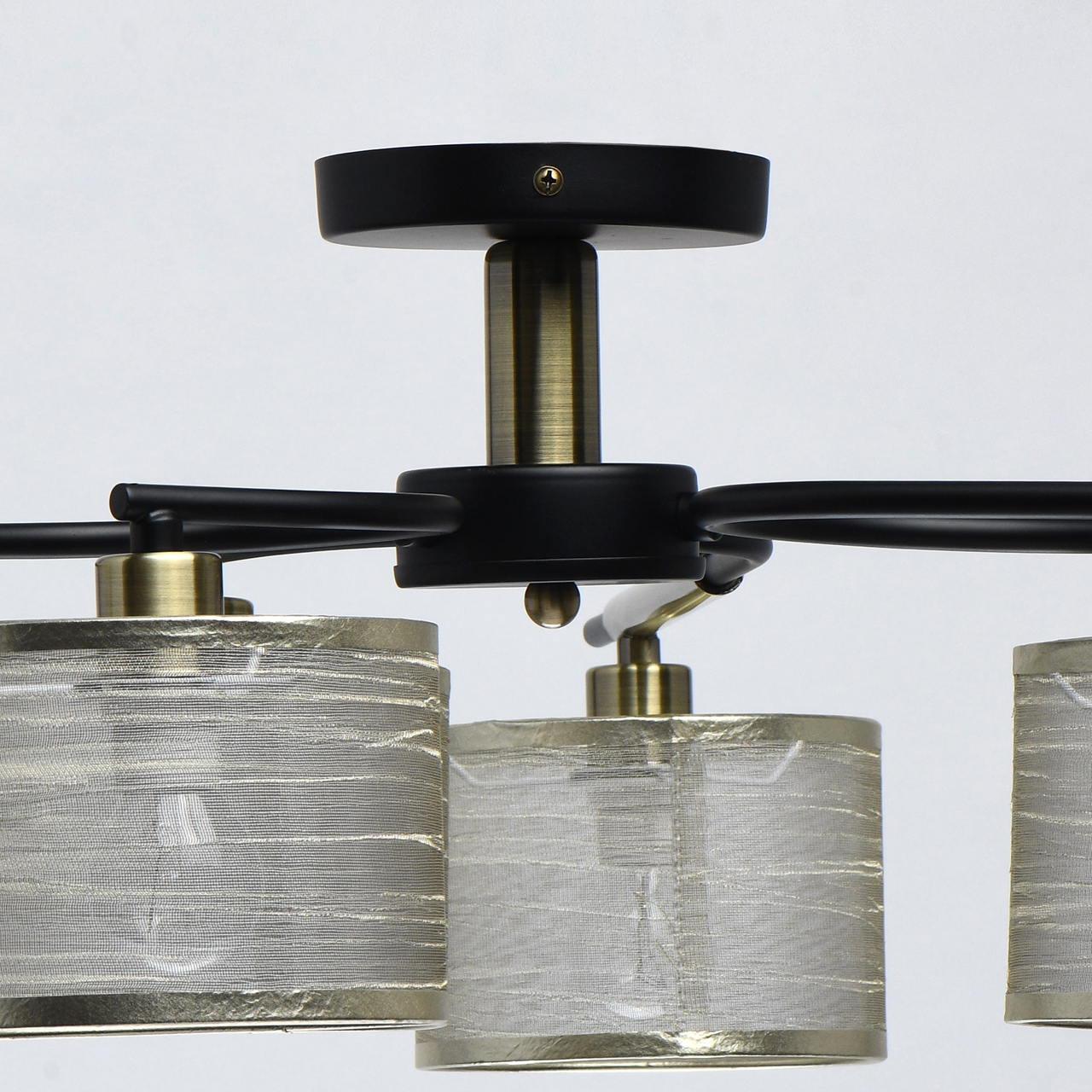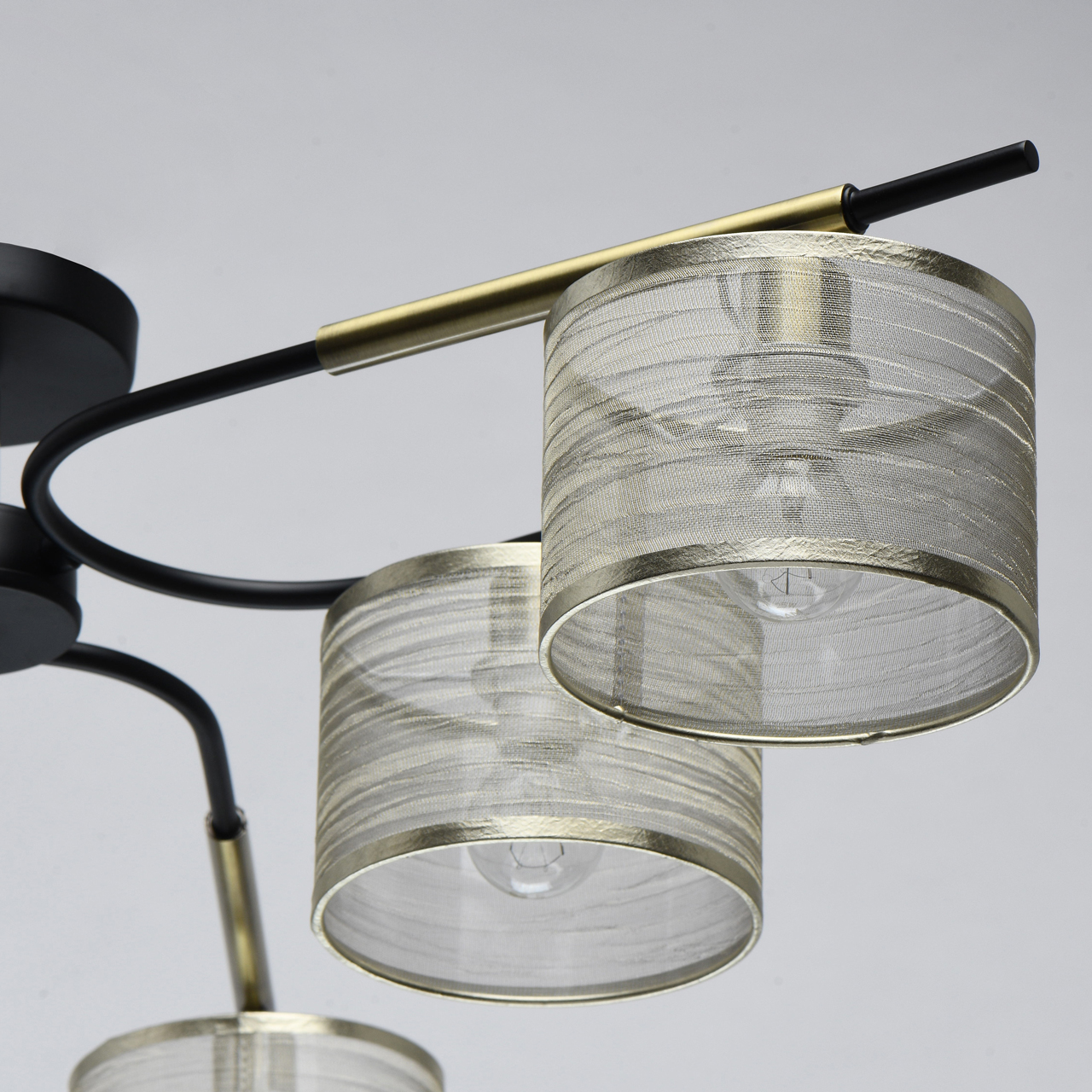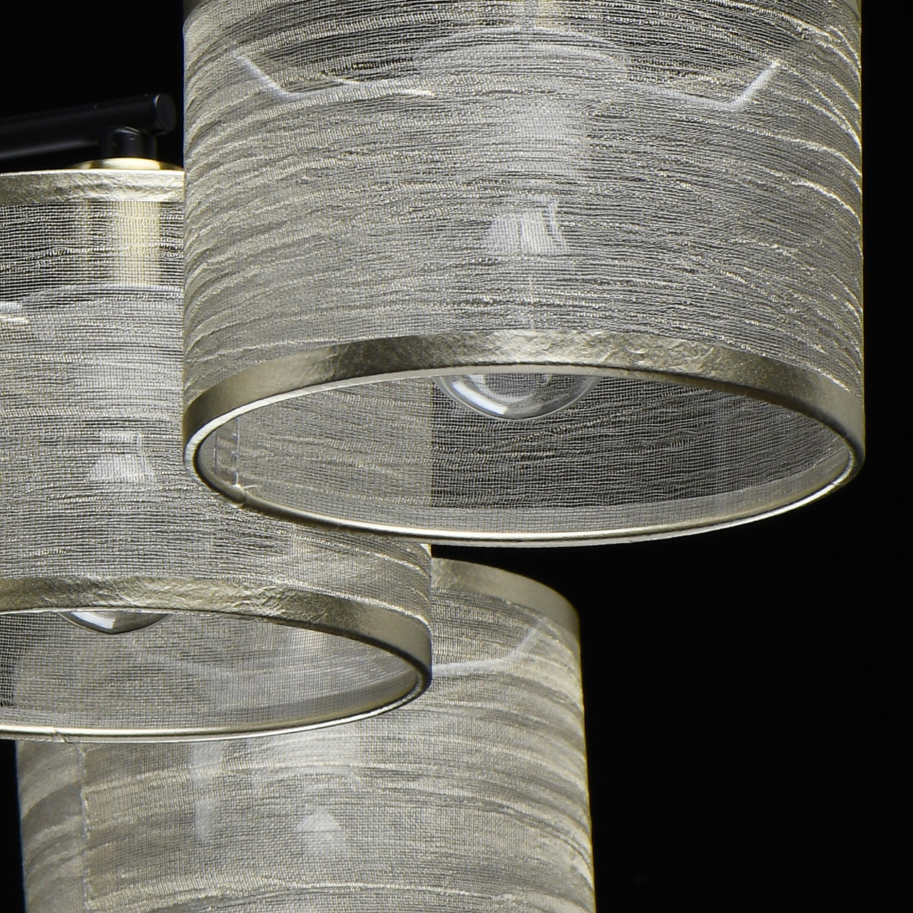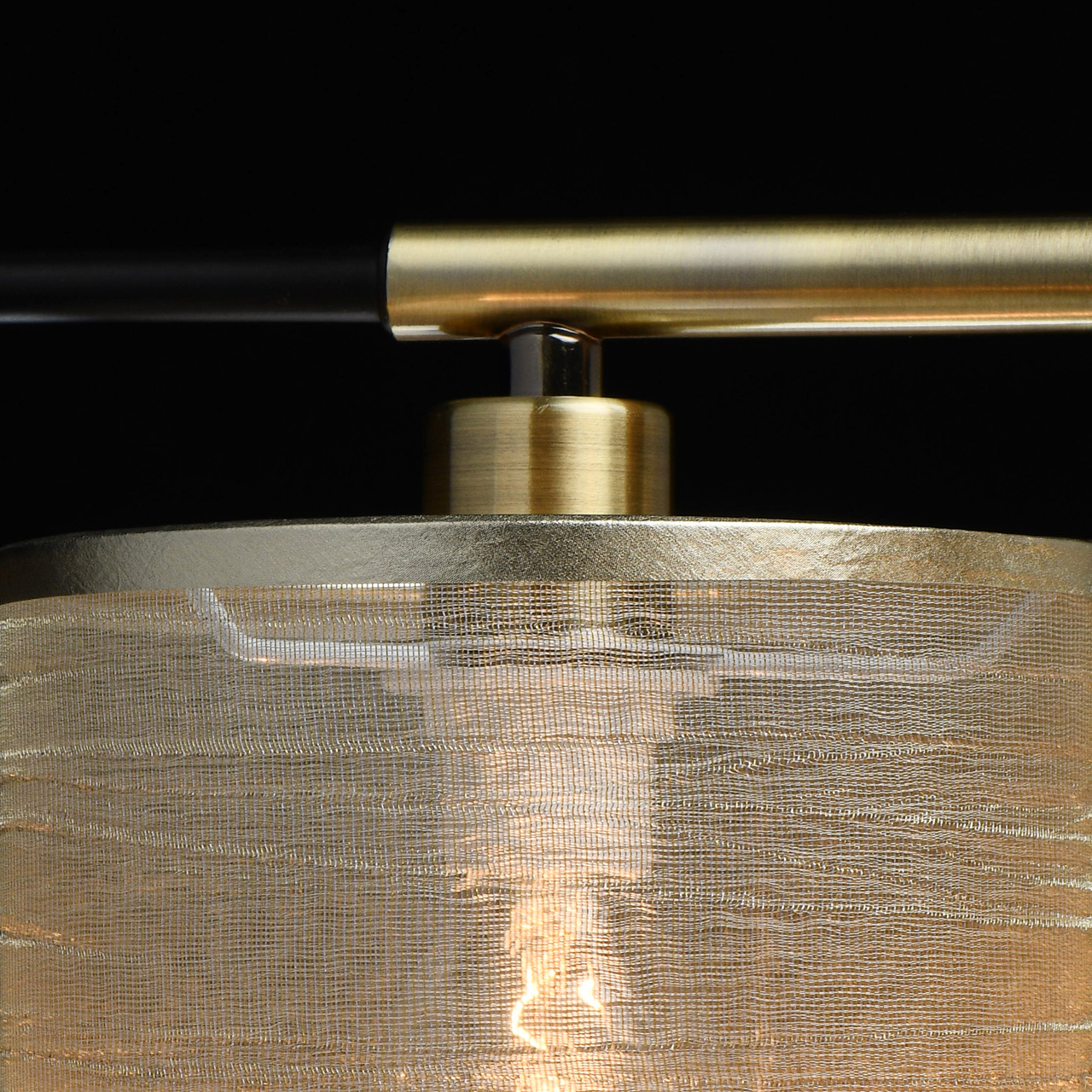 Металлическое основание светильника окрашено в черный цвет. Отдельные элементы основания гальванизированы в цвет бронзы. Светильник декорирован двойными текстильными абажурами с термостойким акрилом внутри. Внешний слой из органзы цвета шампань. Абажуры прошиты и отделаны кантом.Тип помещения